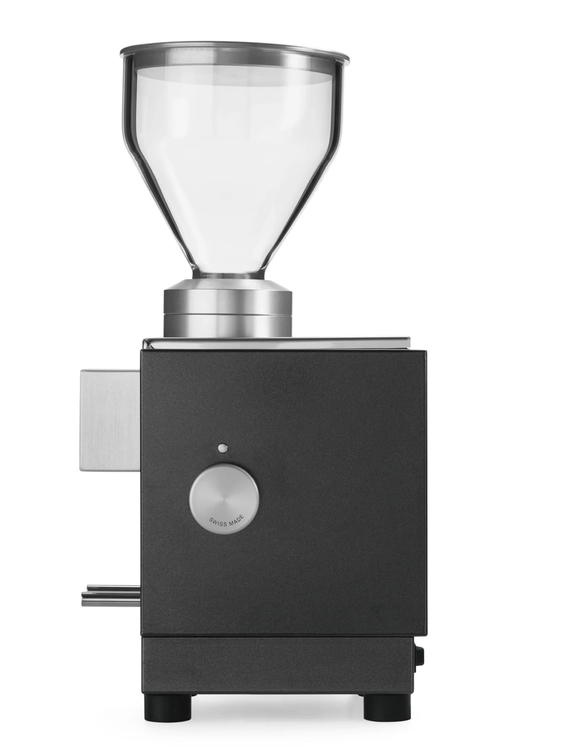 Elektrische Espressomühle. Gehäuse: Seitenteile aus pulverbeschichtetem Stahl, Front aus hochglanzpoliertem Edelstahl. Der Bohnentrichter aus Borosilikatglas (Fassungsvermögen etwa 200 g ist abnehmbar.) 4 Gummifüße.