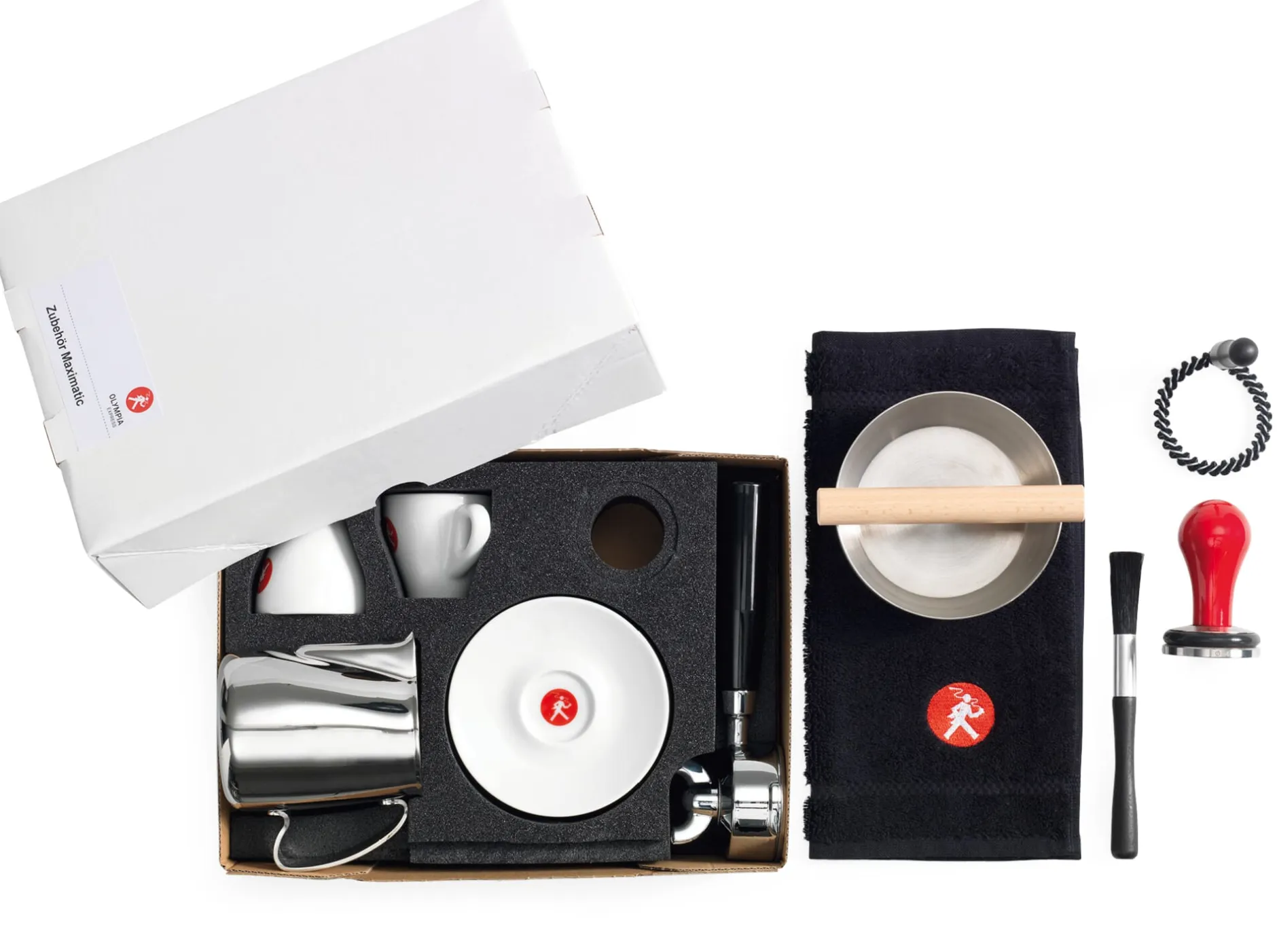 In den Sets enthalten sind, abgestimmt auf die jeweilige Größe von Maschine und Siebträger, ein Milchschaumkännchen, Tamper und eine Ausklopfschale aus Edelstahl inkl. Holzsteg. Außerdem mitgeliefert werden zwei Olympia-Expresso-Tassen mit Untertassen, eine Rundbürste, ein Reinigungspinsel und ein spezielles Pflegetuch. Zubehörset für die Olympia Maximatic oder Olympia Cremina.