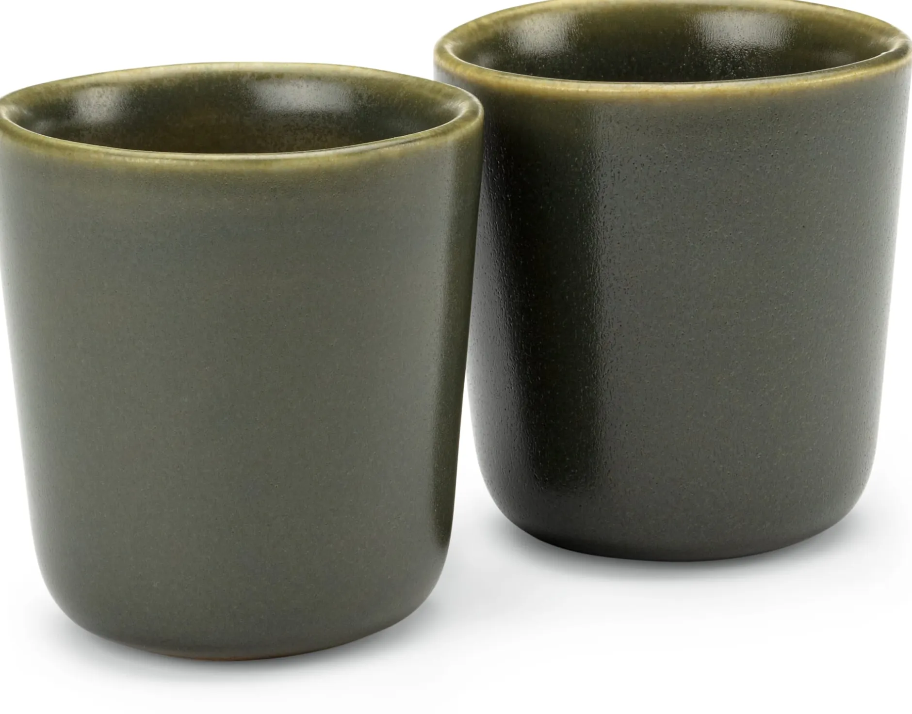 Bereits der helle Sandton der einen Glasur ist durch und durch ehrlich: Frei von zusätzlichen Pigmentzugaben, ergibt er sich aus der ursprünglichen Farbe des verwendeten Scherbens und ist charakteristisch für die Region im Norden Portugals, wo die Töpferei tätig ist. Die helle Glasur hebt den Charakter des Werkstoffes hervor und betont ihn nachdrücklich – auf seine ganz eigene Weise. Wir haben sie nur an den Innenseiten auftragen lassen. Dadurch wird außen die feinporige Struktur des Tons greifbar, und das im wahrsten Sinne des Wortes. Mit jedem Gebrauch, mit jeder Speise und jedem Getränk, das Sie mit diesem Geschirr servieren, werden Spuren sichtbar, verändert das Material sein Aussehen und entwickelt Patina. Im Vergleich dazu ebenmäßiger kommt der Farbton der anderen Glasur daher, die satt aufgetragen ein matt schimmerndes Dunkelgrün ergibt.