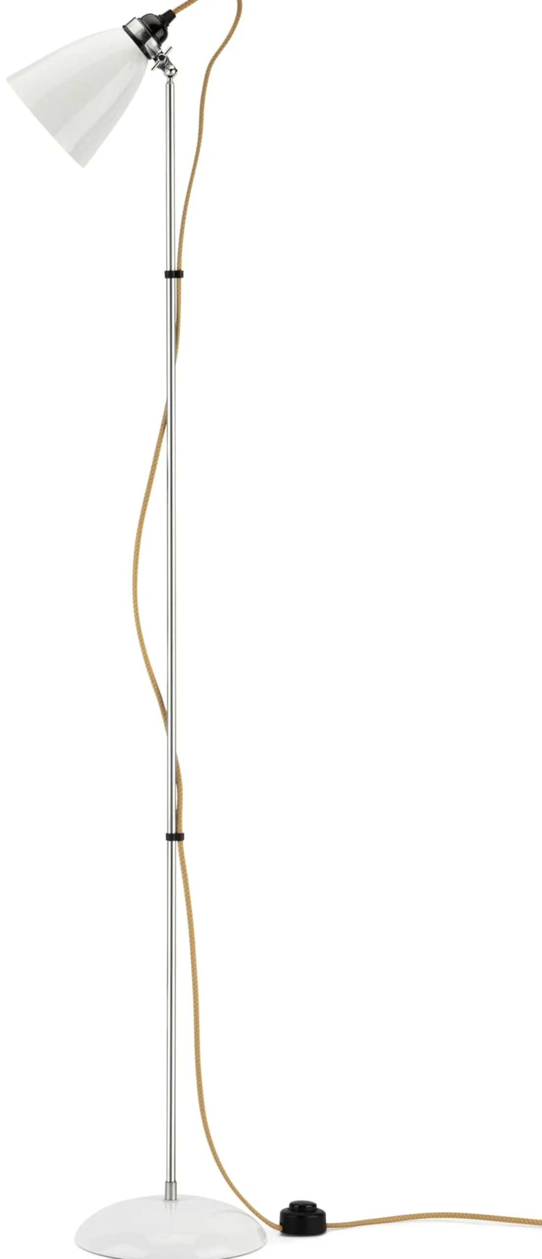 Schirm (Ø 12,5 cm) Bone China, Stativ (Länge 116 cm) Aluminium, Fuß (Ø 20 cm) Porzellan, Stahlgewicht, Filz. Weißes Textilkabel (Länge 200 cm) mit Zwischenschalter und Eurostecker aus Kunststoff. Kunststofffassung E27 (max. 40 W). Höhe 126 cm. Gewicht 3,2 kg. Lieferung ohne Leuchtmittel.