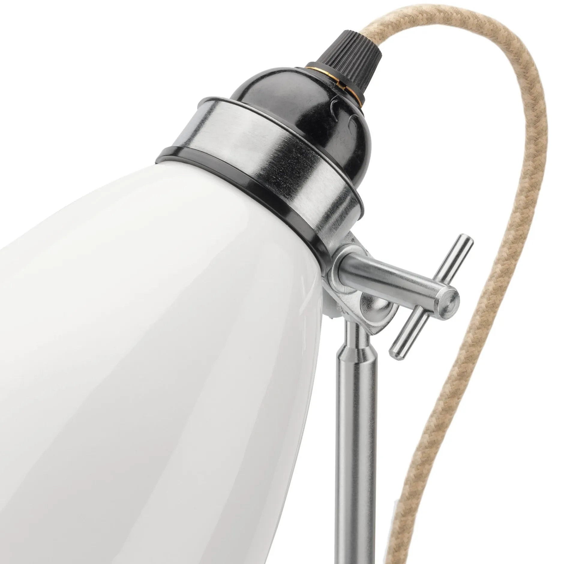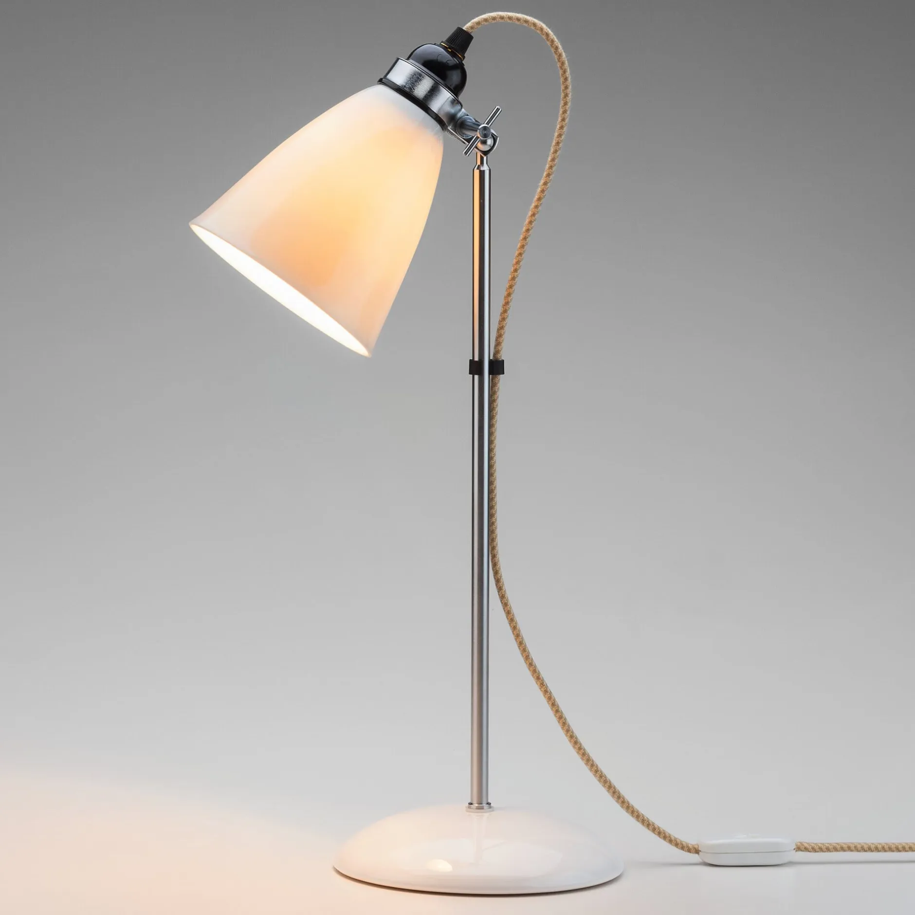 Weiß. Mit weißem Porzellanfuß und beige-grauem Textilkabel.