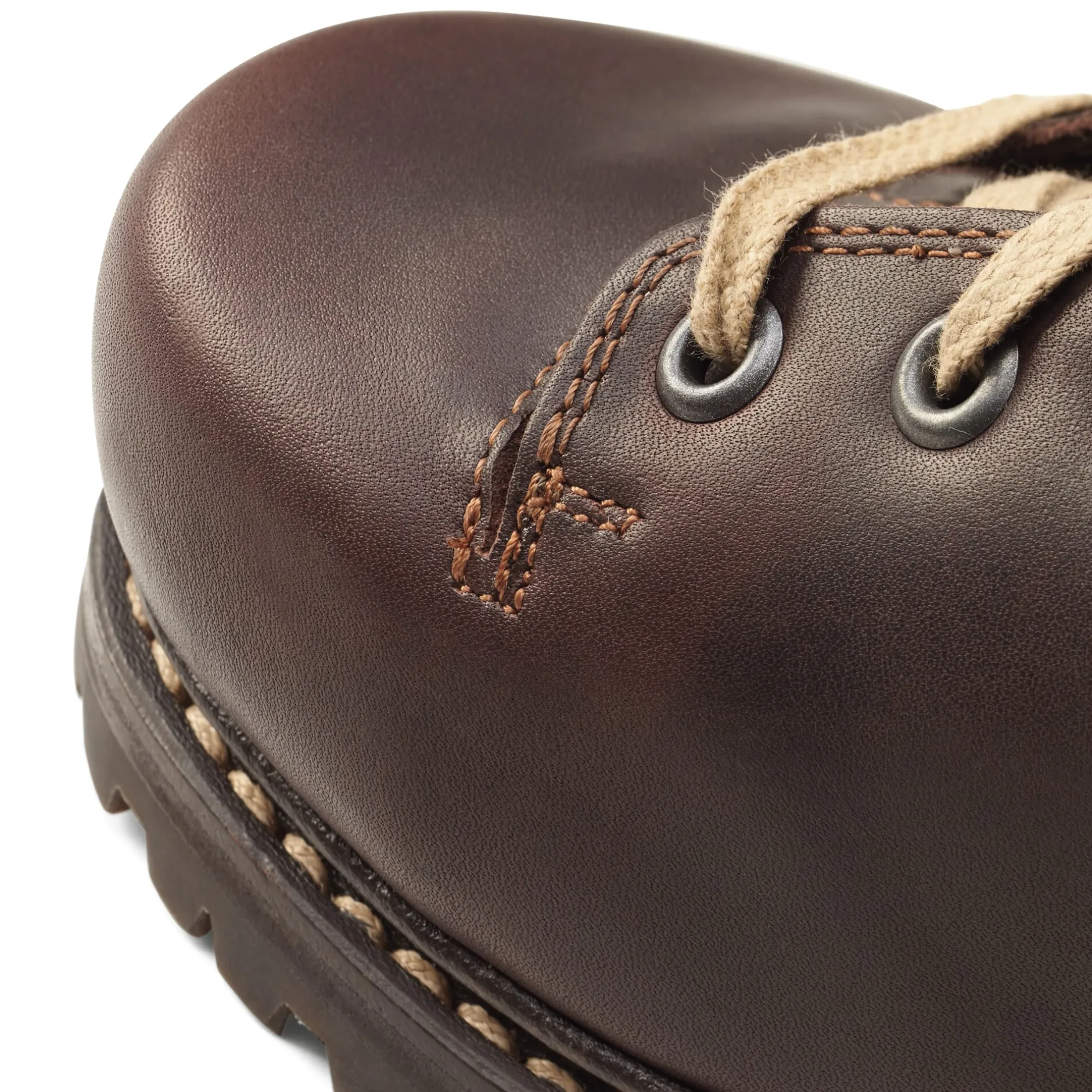 Obermaterial Rindleder, chromgegerbt, Futter Kalbleder, chromgegerbt. Brand- und Decksohle Rindleder. 5 Metallösen- und 2 Metallhakenpaare. Griffige Gummilaufsohle (Vibram®). Hergestellt in Ungarn. Lieferung mit einem zweiten Paar (dunkler) Schnürsenkel. Englische Größen 3-8 in halben Größen.