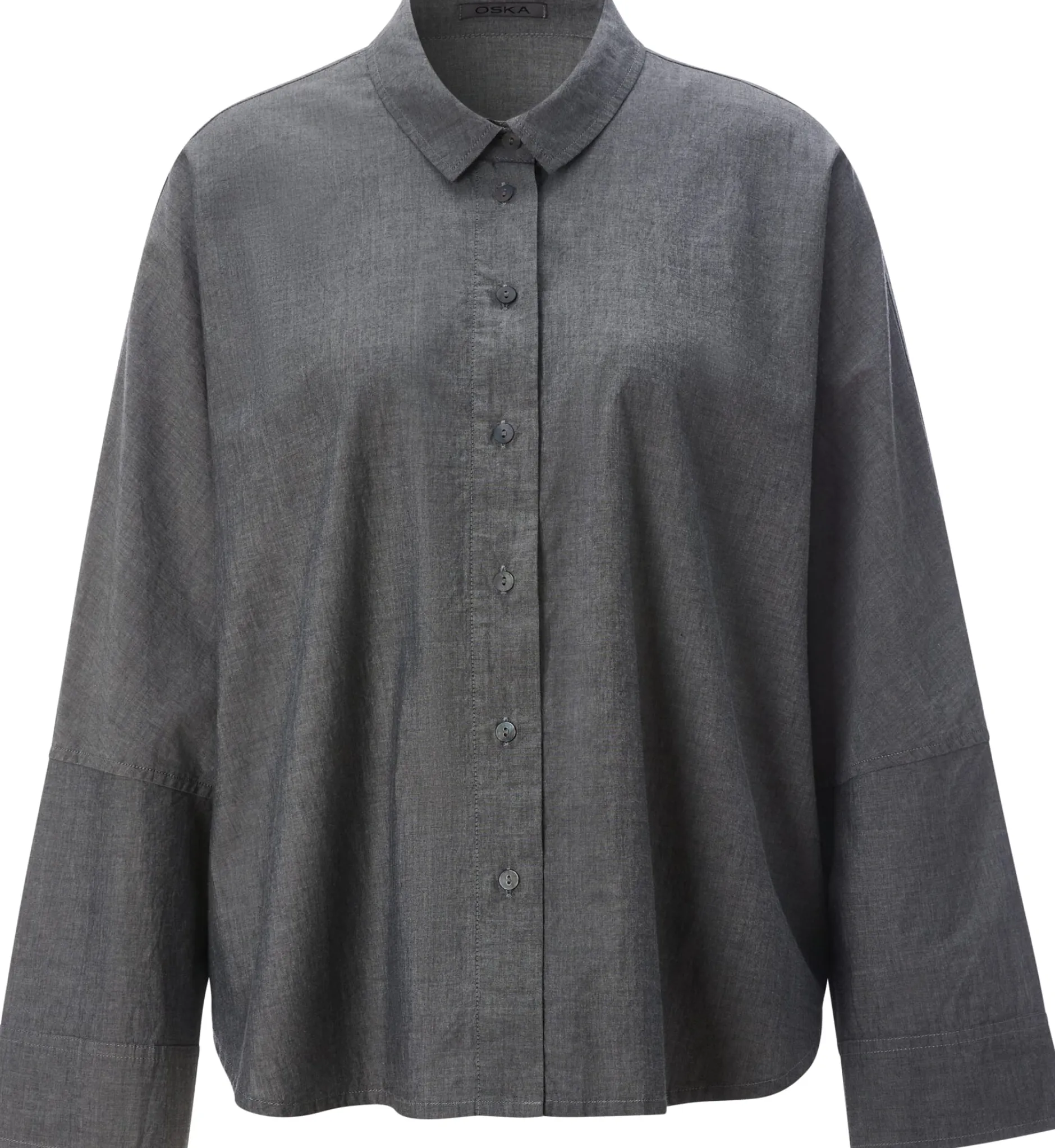 Diese leger geschnittene Bluse konfektioniert Oska aus einem angenehm glatt auf der Haut liegenden Chambray aus reiner, hautsympathischer Baumwolle. Bei Chambray handelt es sich um einen leichten, dicht gewebten Stoff, bei dem Kett- und Schussfaden verschiedenfarbig sind, was ihm den charakteristischen Melangeeffekt verleiht. Gearbeitet ist die durchgeknöpfte Bluse mit Kentkragen, geknöpften Ärmelöffnungen und gerundetem Saum. Die Passform ist Oska-typisch überschnitten – für einen lässigen, entspannten Look. Die Kellerfalte und die gelegten Falten unter der gerundeten Schulterpasse sorgen für einen guten Sitz und noch mehr Bewegungsfreiheit.