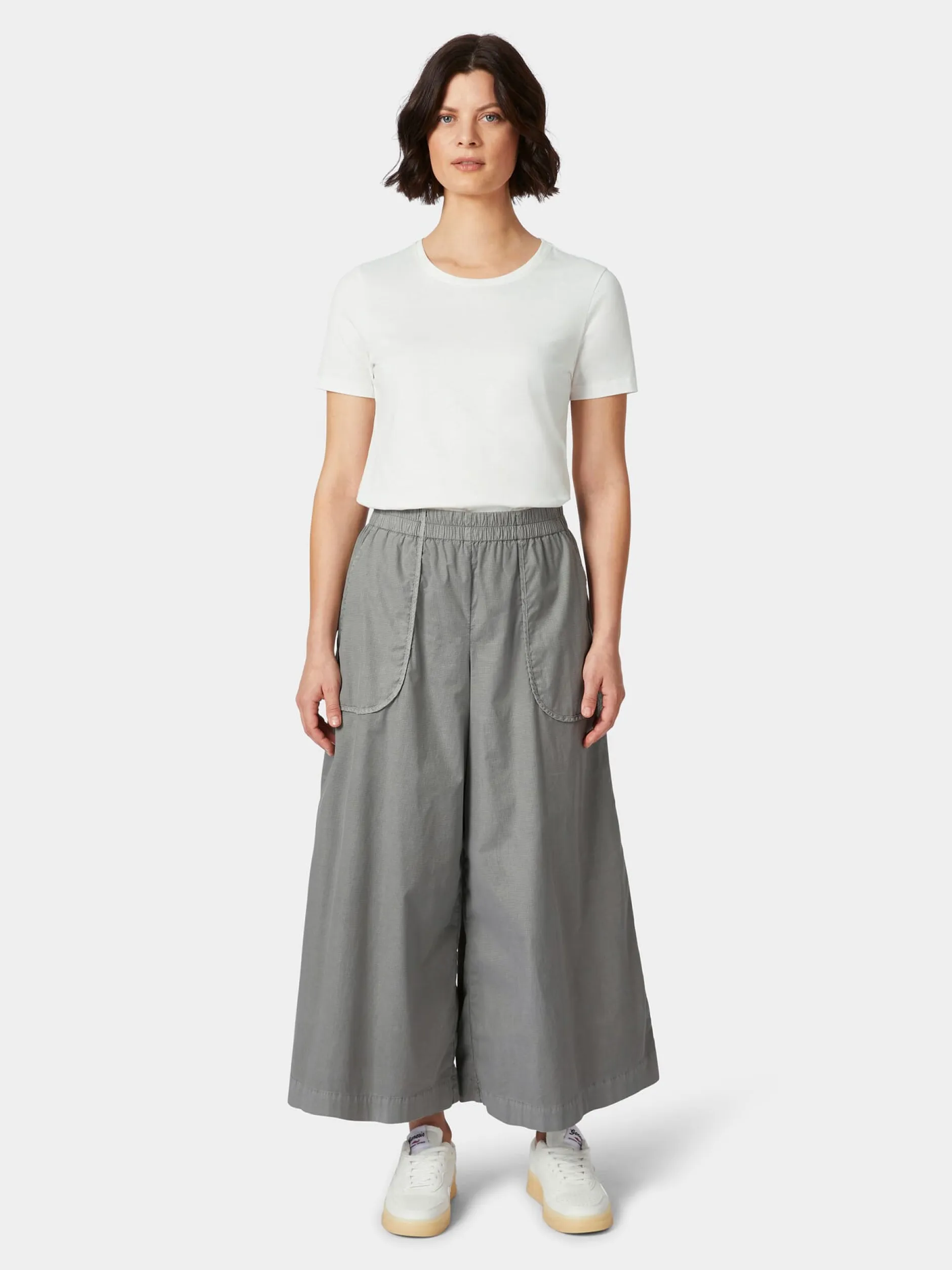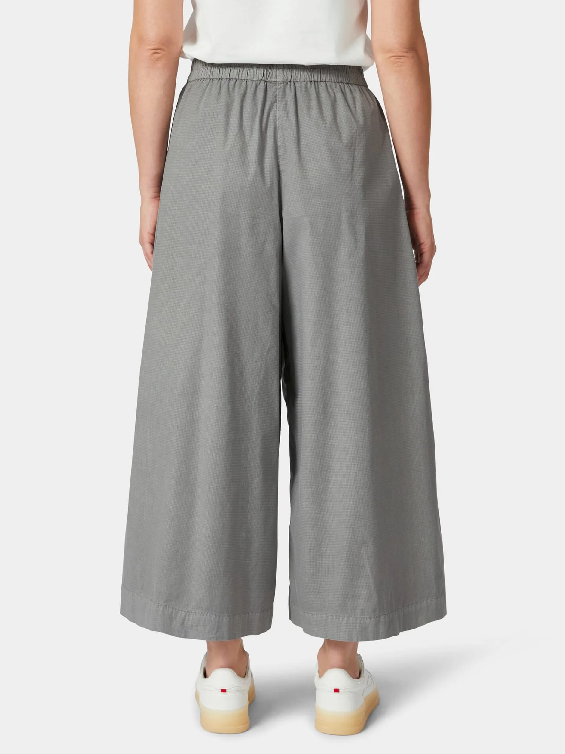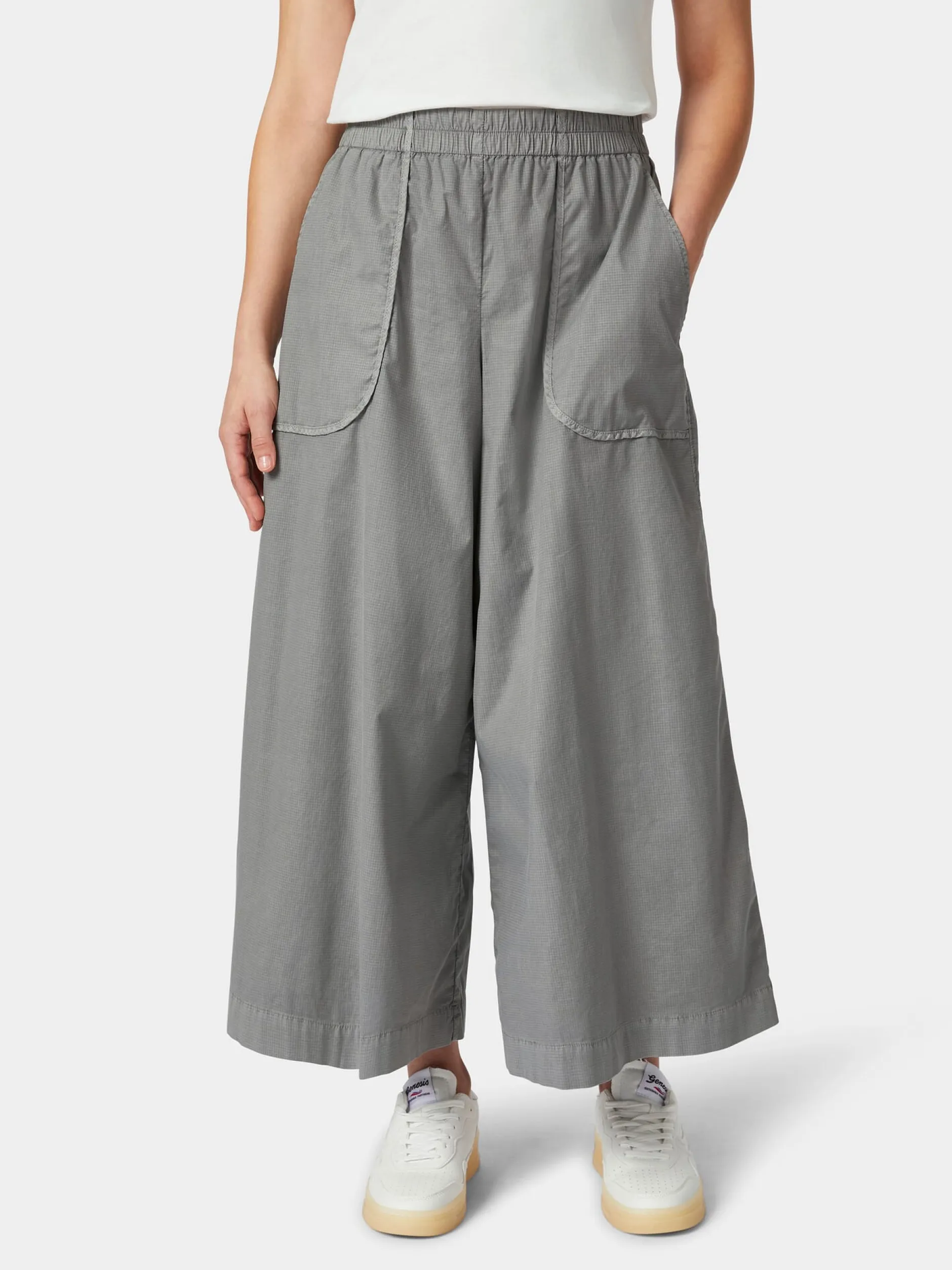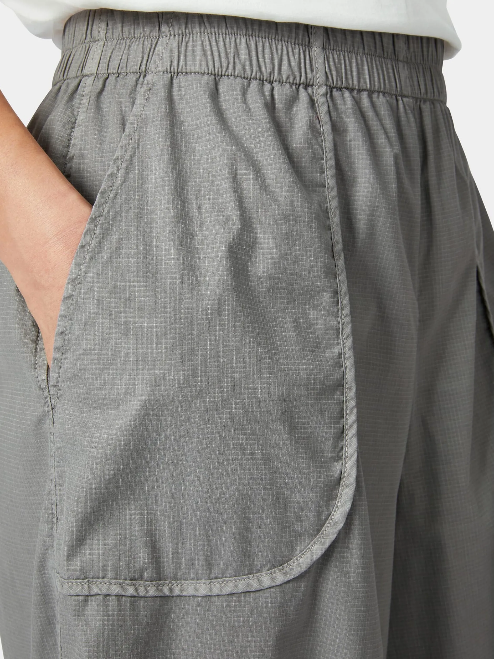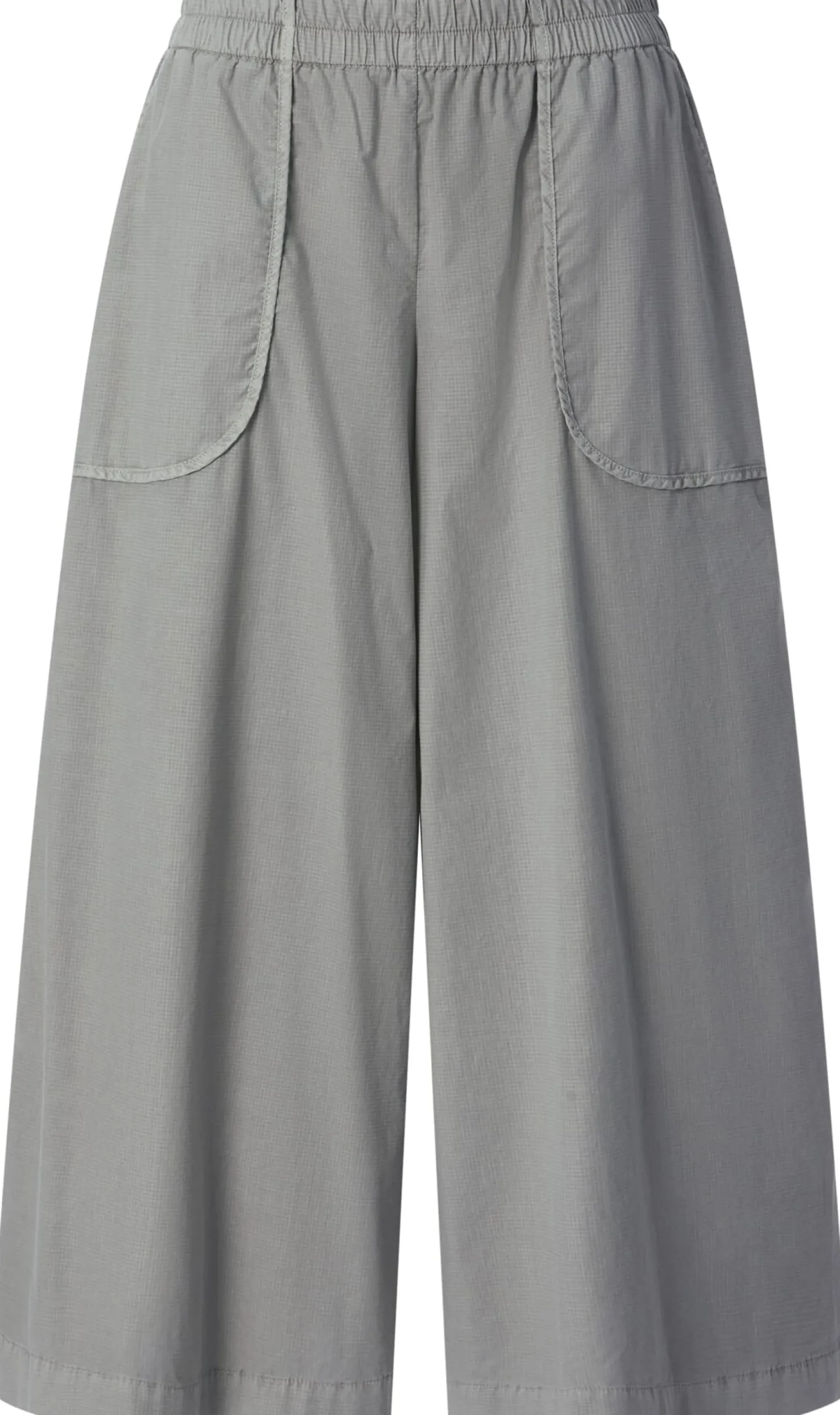 Ripstop ist ein robuster und reißfester Stoff mit charakteristischem Gittermuster, was dadurch entsteht, dass in regelmäßigen Abständen dickere Kett- und Schussfäden in das Gewebe eingearbeitet werden. Meist wird der Stoff, der aufgrund seiner Strapazierbarkeit im Outdoorbereich sehr beliebt ist, aus reinen Kunstfasern hergestellt. Für diesen verschlusslosen Hosenrock verwendet Oska einen Ripstop aus hautsympathischer Baumwolle und einem geringen Anteil Elastan zugunsten der Elastizität. Das Gewebe ist leicht und trägt nicht auf und die bequeme Passform mit geradem, weitem Bein und Gummibund sorgt für viel Bewegungsfreiheit. Die aufgesetzten Seitentaschen sind sauber paspeliert.