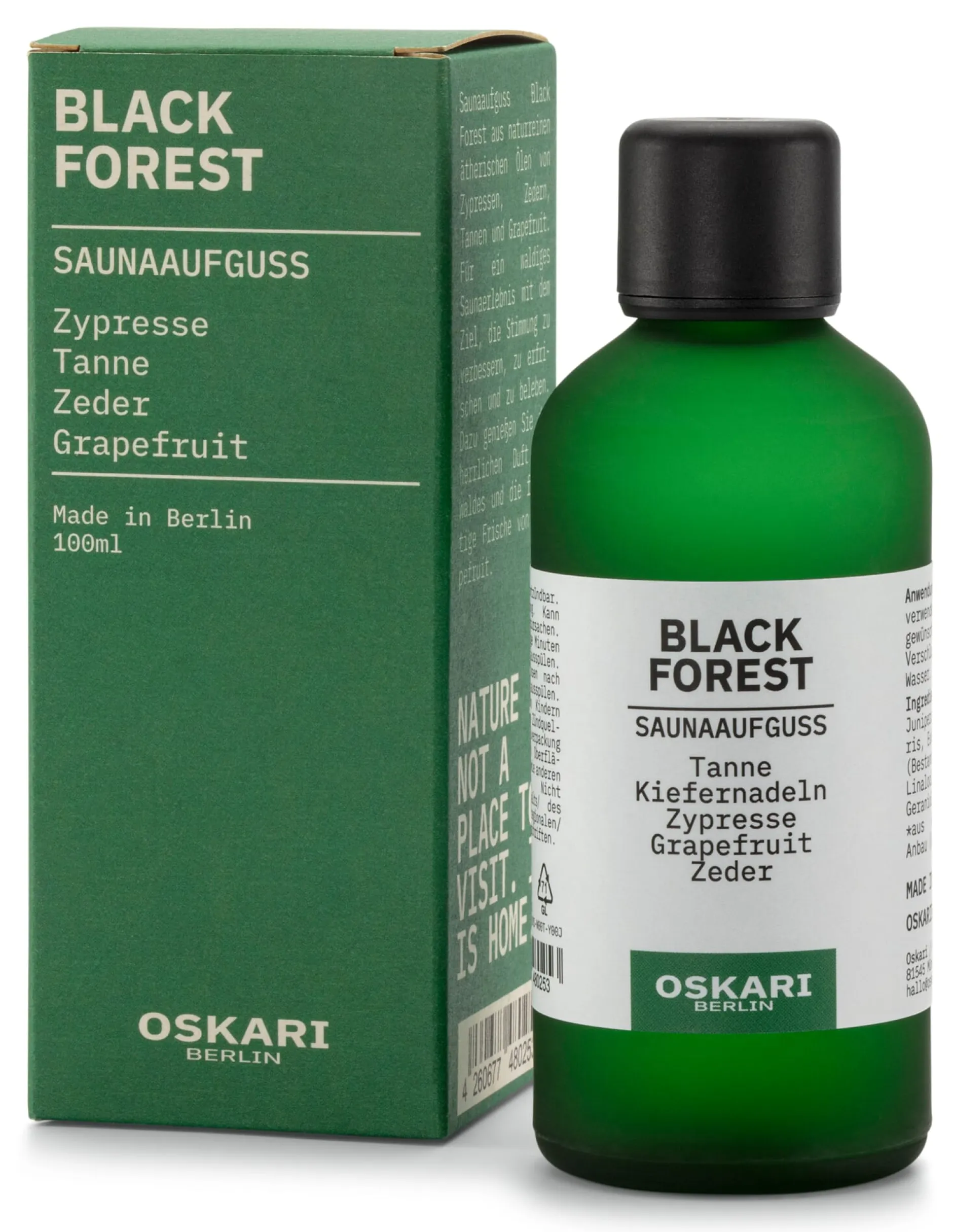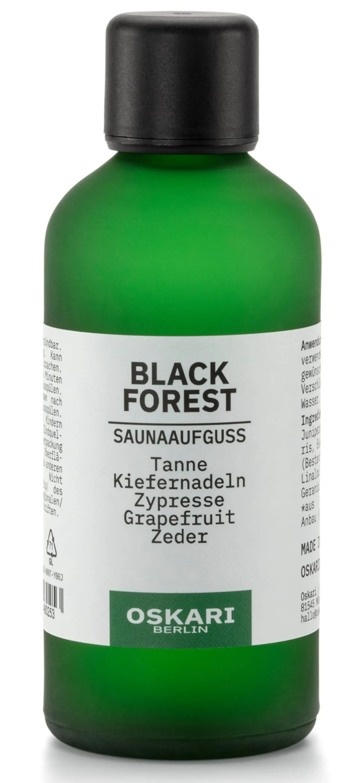 Black Forest: Der Saunaaufguss duftet aromatisch intensiv nach Nadelwald. Mit den ätherischen Ölen von Zypresse, Zeder, Tanne und Grapefruit erfrischt und belebt der Waldduft alle Sinne und hebt die Stimmung, gleichzeitig können Körper und Geist entspannen wie bei einem Waldspaziergang.