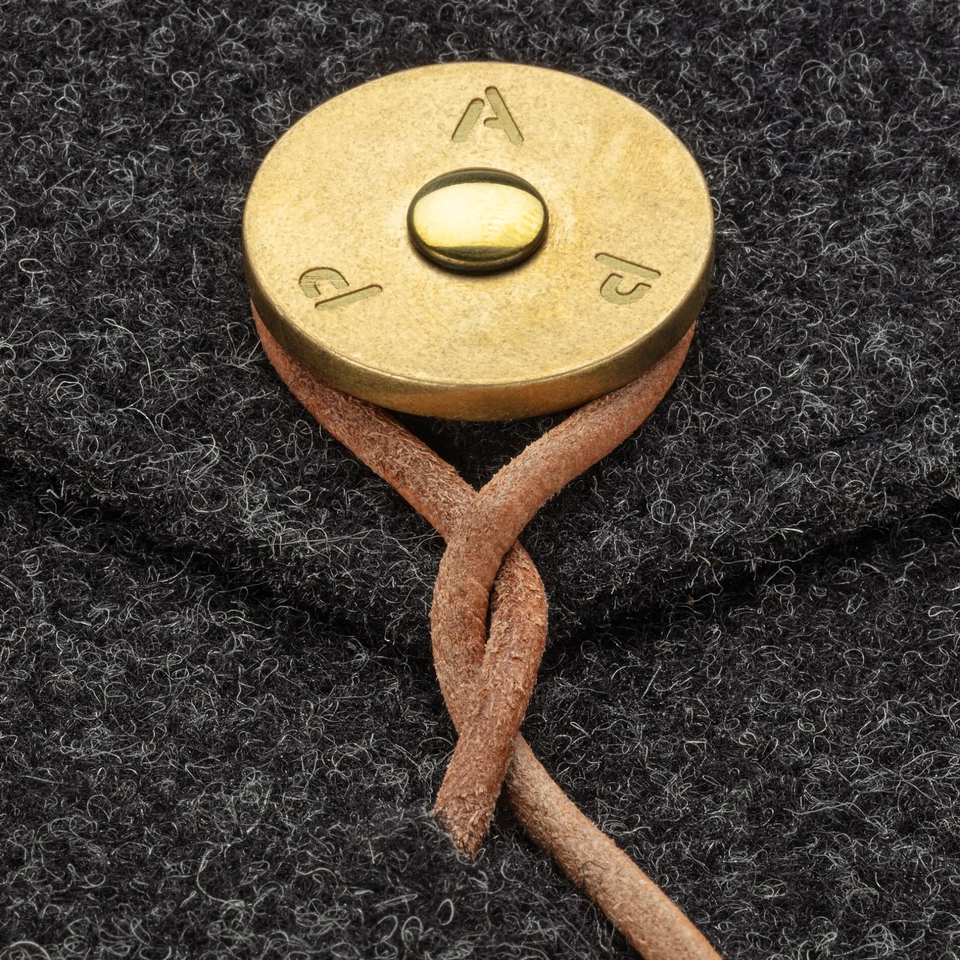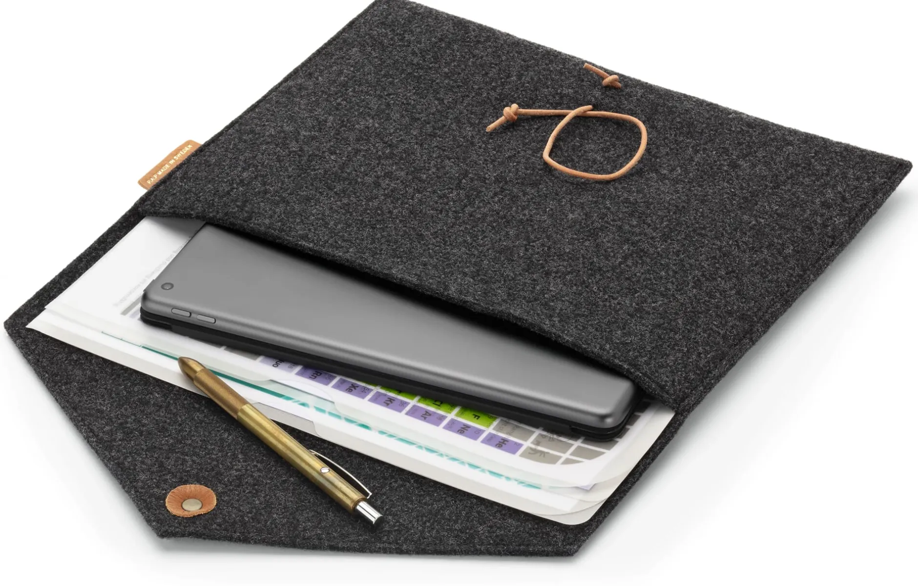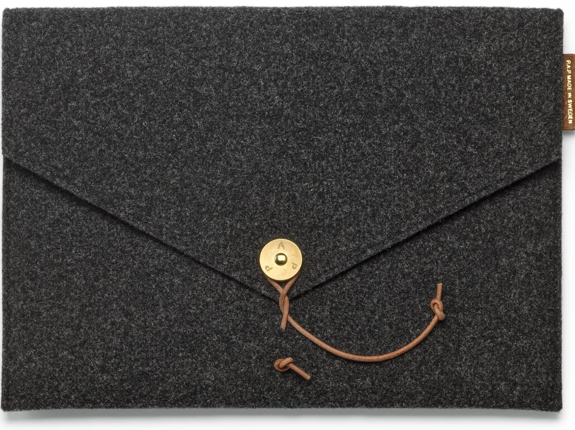 Aus durablem, leicht polsterndem Wollfilz gefertigt, schützt diese Hülle Ihr 13-Zoll-Tablet oder A4-Dokumente. Für längere Haltbarkeit des Materials sorgt ein zehnprozentiger Anteil an Polyester im Wollfilz. Die Kanten sind sorgfältig mit einem Steppstich versehen, was zusätzlich Stabilität verleiht. Im Format ist die Hülle einem Briefumschlag nachempfunden. Auch ihr Verschluss folgt dem papiernen Vorbild, der hier – statt aus Faden und genieteter Pappronde – aus einem soliden Messingknopf und einem Lederbändchen besteht.
