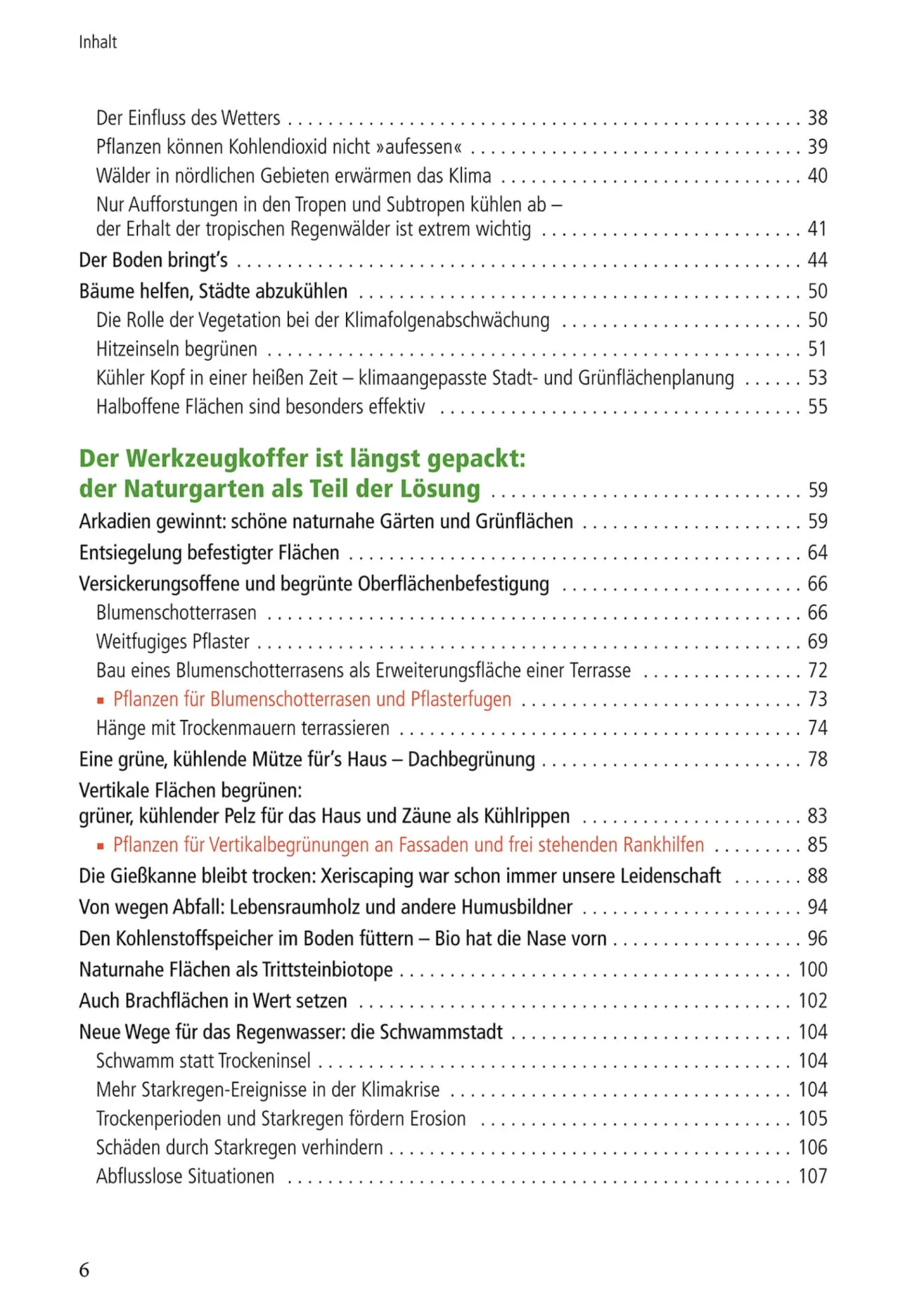 Das verständlich aufbereitete Hintergrundwissen motiviert, im eigenen Garten selbst erfolgreiche Lösungsmöglichkeiten zu entwickeln und die Probleme ganzheitlich anzugehen. Kompetent und praxisnah stellt sie den gut gefüllten Werkzeugkoffer der Naturgärtnerinnen und Naturgärtner vor, um mit den Herausforderungen wie Trockenheit oder Starkregen besser umzugehen. Die Anlage versickerungsoffener und naturnah bepflanzter Flächen gehört ebenso dazu wie die Auswahl klimafester heimischer Pflanzen als Lebensräume für Tiere, die biodiversitätsfördernde Pflege und das Sammeln des Regenwassers.