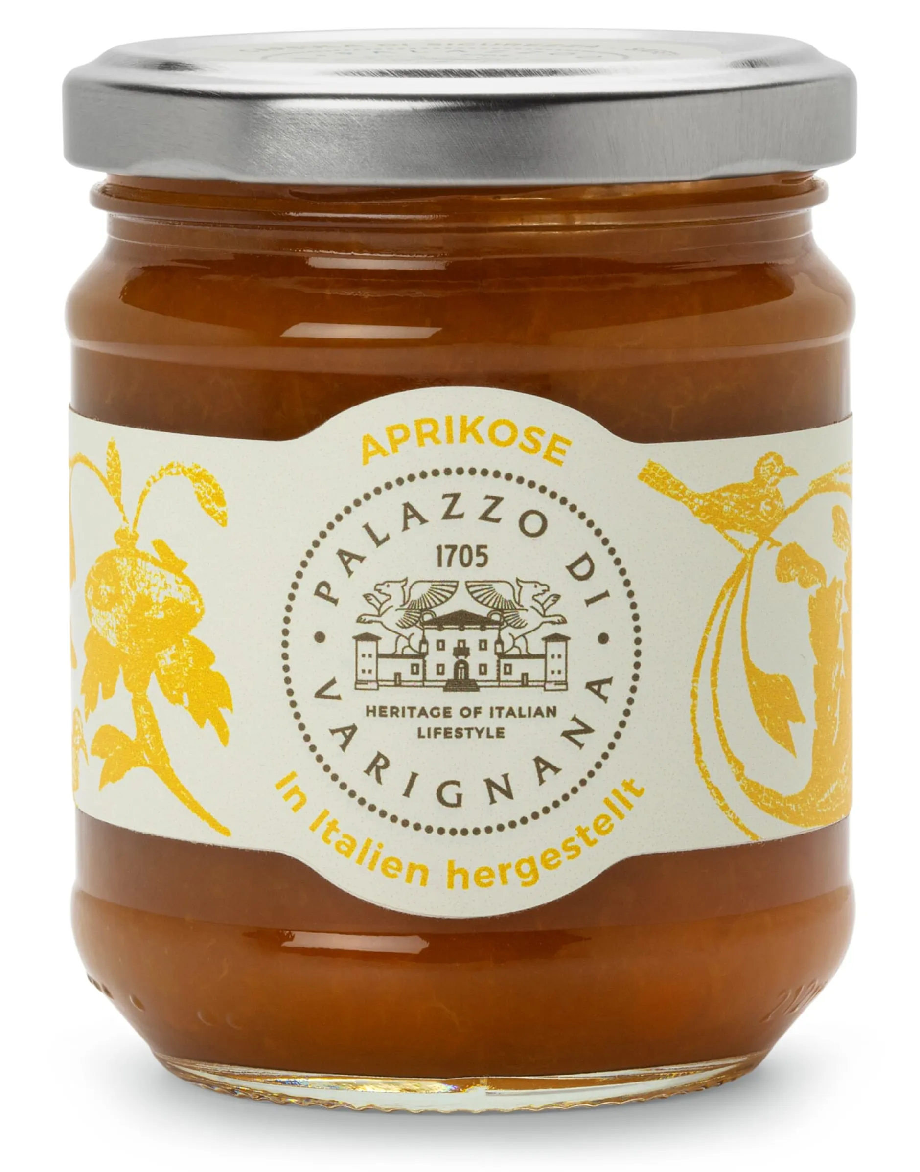 Dieser Fruchtaufstrich wird vom eigenen Landwirtschaftsbetrieb des Palazzo di Varignana hergestellt. Die verwendeten Aprikosen werden in den Gärten der umgebenden Hügel geerntet und traditionell eingekocht. Ins Glas kommen dabei gut 80 Prozent Aprikosen, der Rest ist Zucker, der aus Trauben gewonnen wird. Der Aprikosen-Fruchtaufstrich ist ein echter Gaumenschmaus, der selbstgebackenen Kuchen verfeinert und das Frühstück oder kleine Zwischenmahlzeiten mit allen Brotarten bereichert – auch die Kombination mit Käse lohnt sich.
