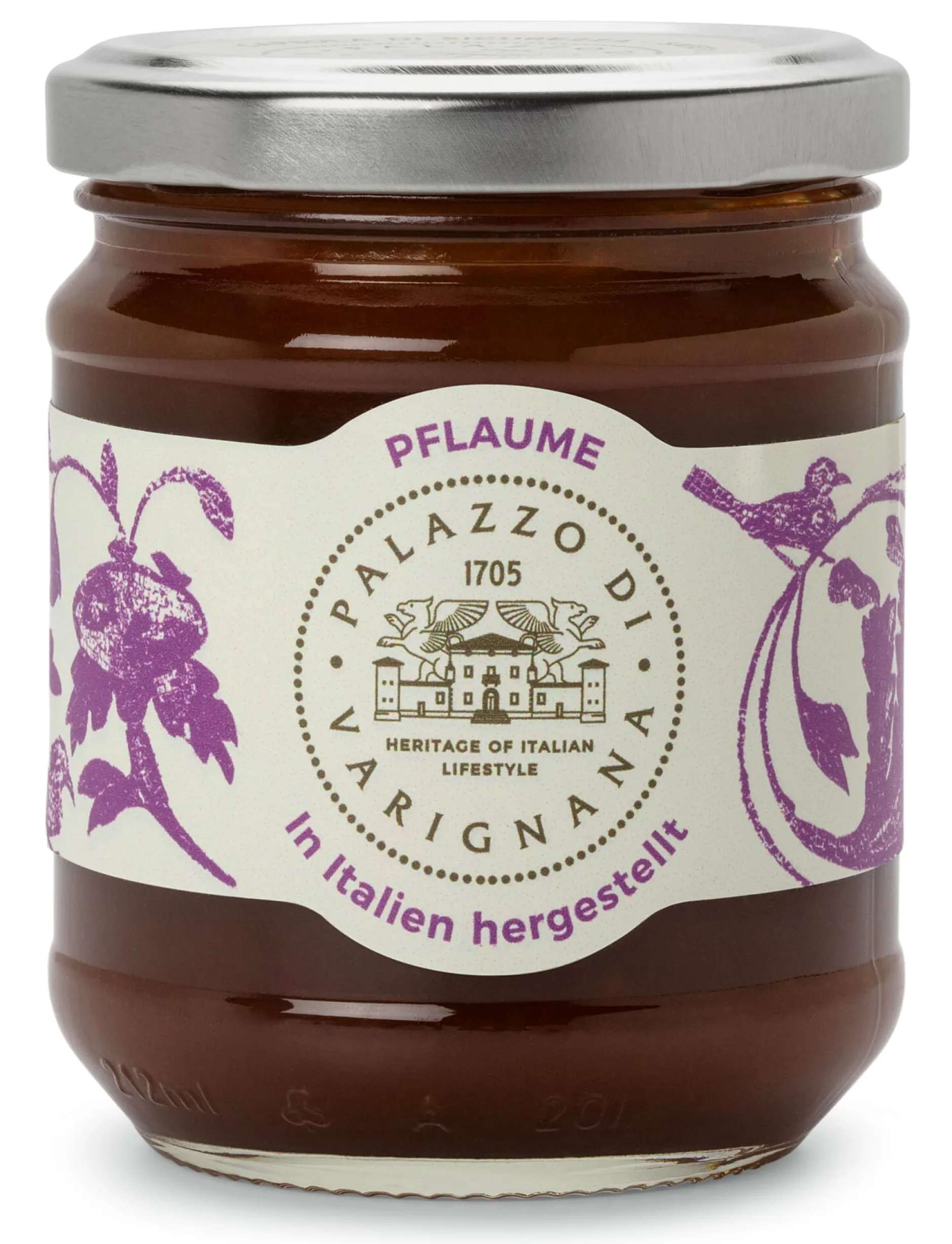 Für diesen Fruchtaufstrich vom eigenen Landwirtschaftsbetrieb des Palazzo di Varignana werden Pflaumen aus den Gärten der umgebenden Hügel geerntet und traditionell eingekocht. Ins Glas kommen dabei fast 85 Prozent Pflaumen, der Rest ist Zucker, der aus Trauben gewonnen wird. Der Pflaumen-Fruchtaufstrich ist ein echter Gaumenschmaus, der selbstgebackenen Kuchen verfeinert und das Frühstück oder kleine Zwischenmahlzeiten mit allen Brotarten bereichert – auch die Kombination mit Käse lohnt sich.