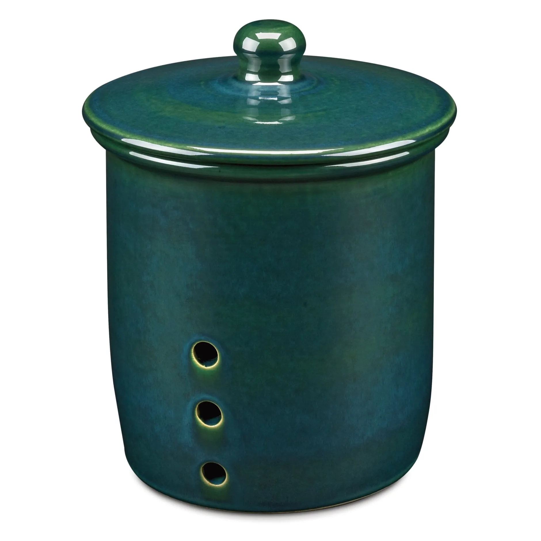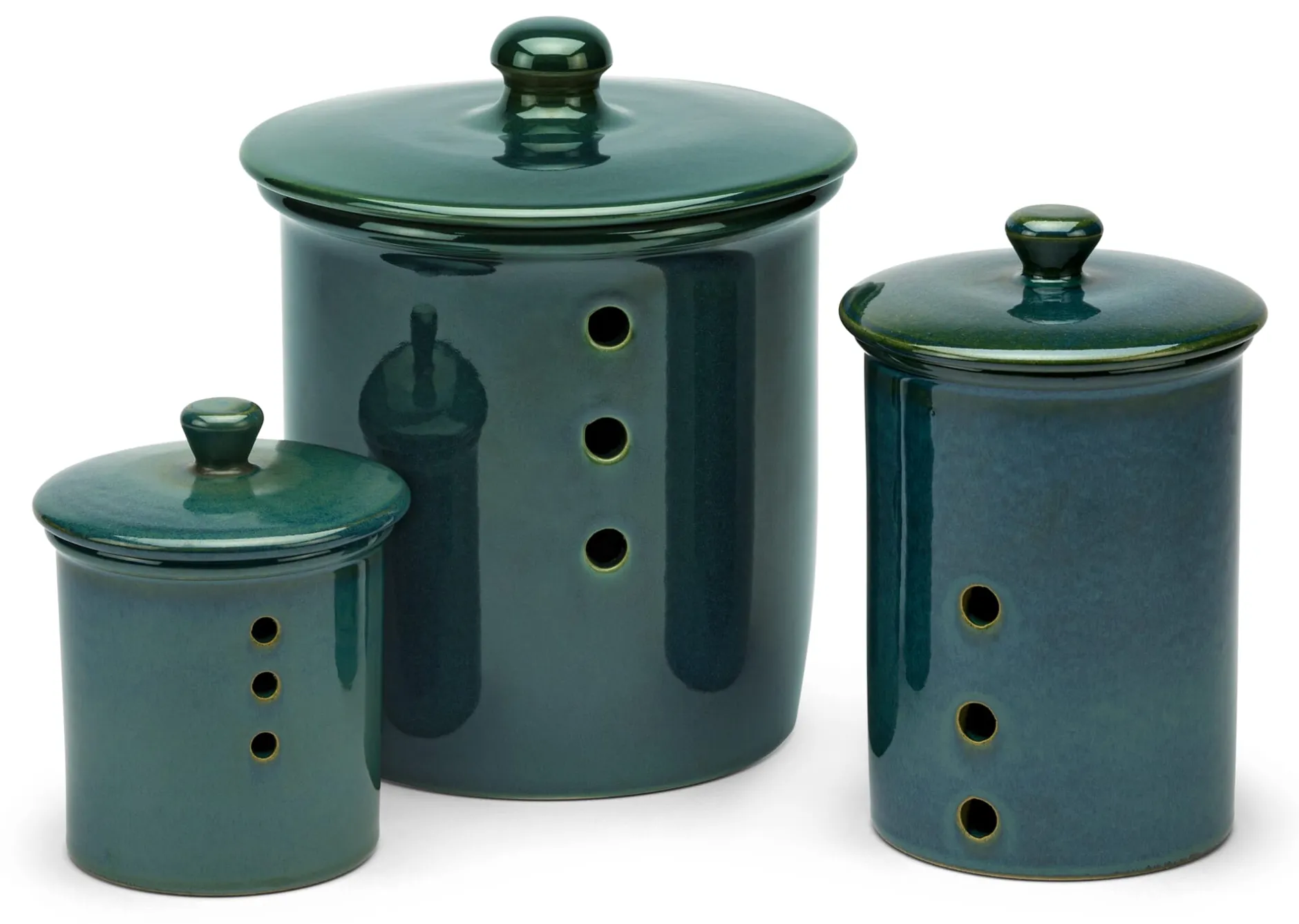 Diese Tontöpfe in bewährter Form halten Gemüse länger frisch, zumal, wenn sie an einem kühlen Ort aufgestellt werden – die Löcher oberhalb des Topfbodens sorgen für eine gute Luftzirkulation, die gut schließenden Deckel schützen vor Licht und der dickwandige Topf verwahrt das Gemüse kühl. Aus Westerwälder Ton ausgeformt, bekommen alle Teile nach einer längeren Zeit der Trocknung ihre schlussendliche Gestalt, werden dann glasiert und im offenen Feuer bei Temperaturen um 1.250 °C glattgebrannt – zu Gefäßen in diesem tiefen, changierenden Grün.