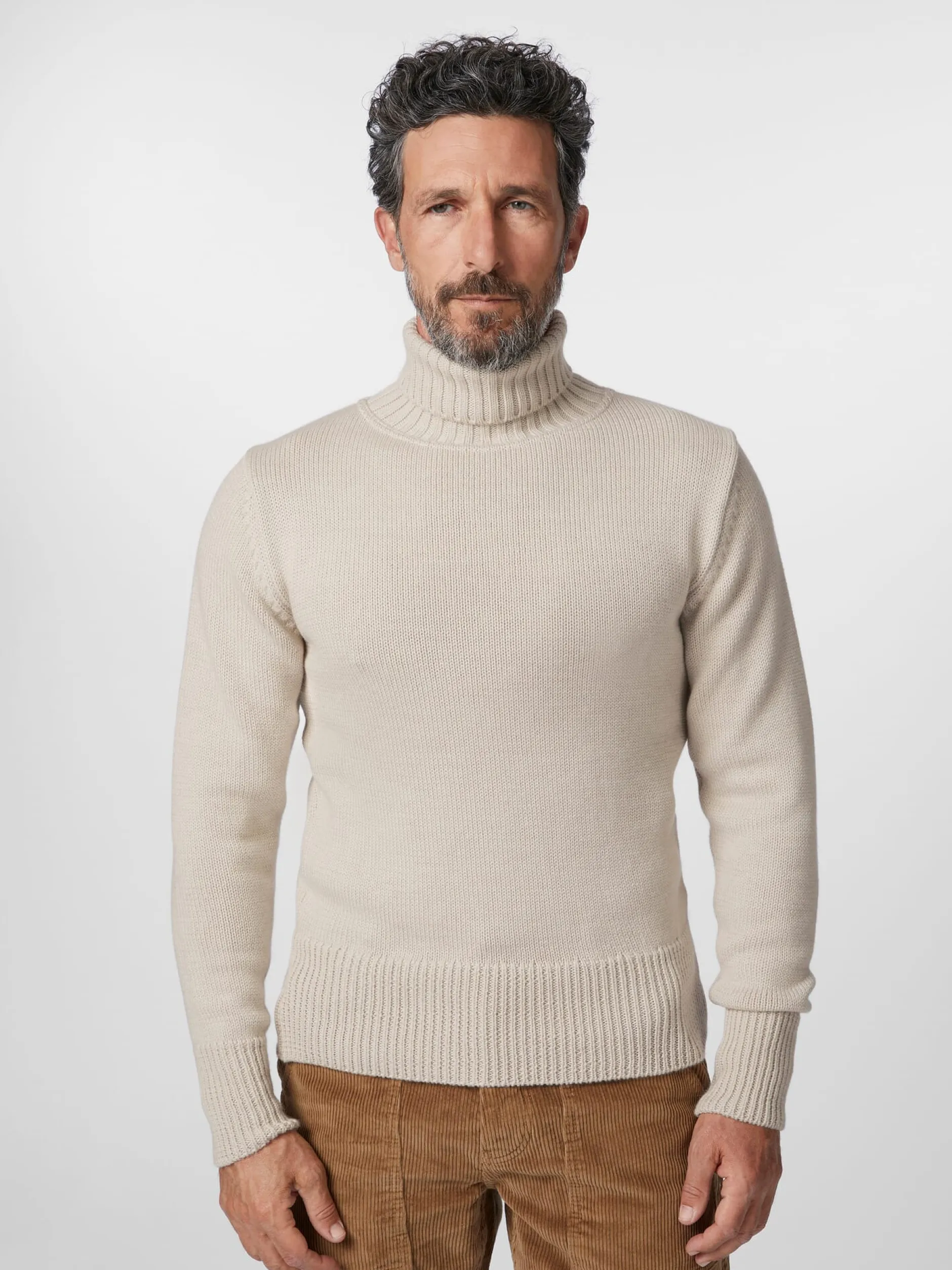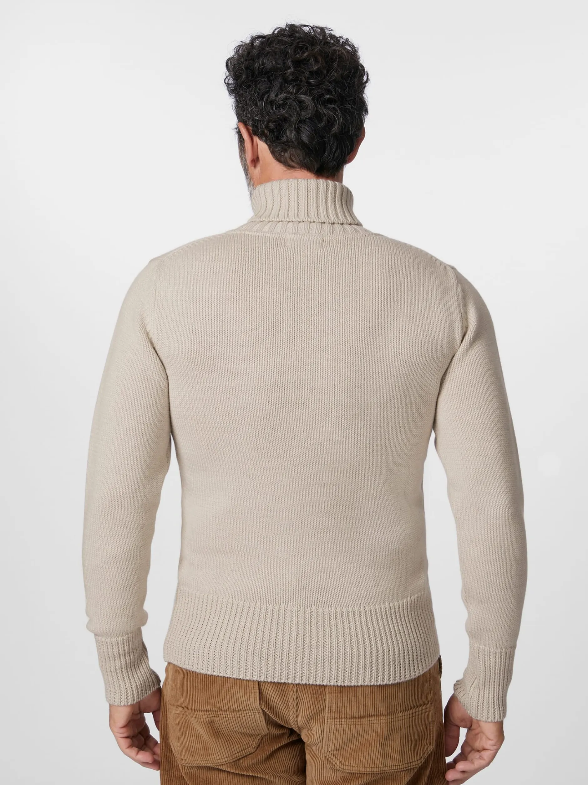 Das Vorbild dieses Pullovers stammt aus der britischen Luftfahrt der 1940er Jahre – und es existiert kaum ein historisches Foto, auf dem er nicht unter der Fliegerjacke hervorlugt. Den Anforderungen der Pilot*innen entsprechend ist er eher körpernah ausgeformt und mit einem üppigen Rollkragen sowie breiten, umlegbaren Rippenstrickbündchen an den Ärmeln ausgestattet, welche die Handgelenke warmhalten. Pike Brothers fertigt den Pullover aus weicher Merinowolle, wodurch er sich sehr angenehm trägt.
