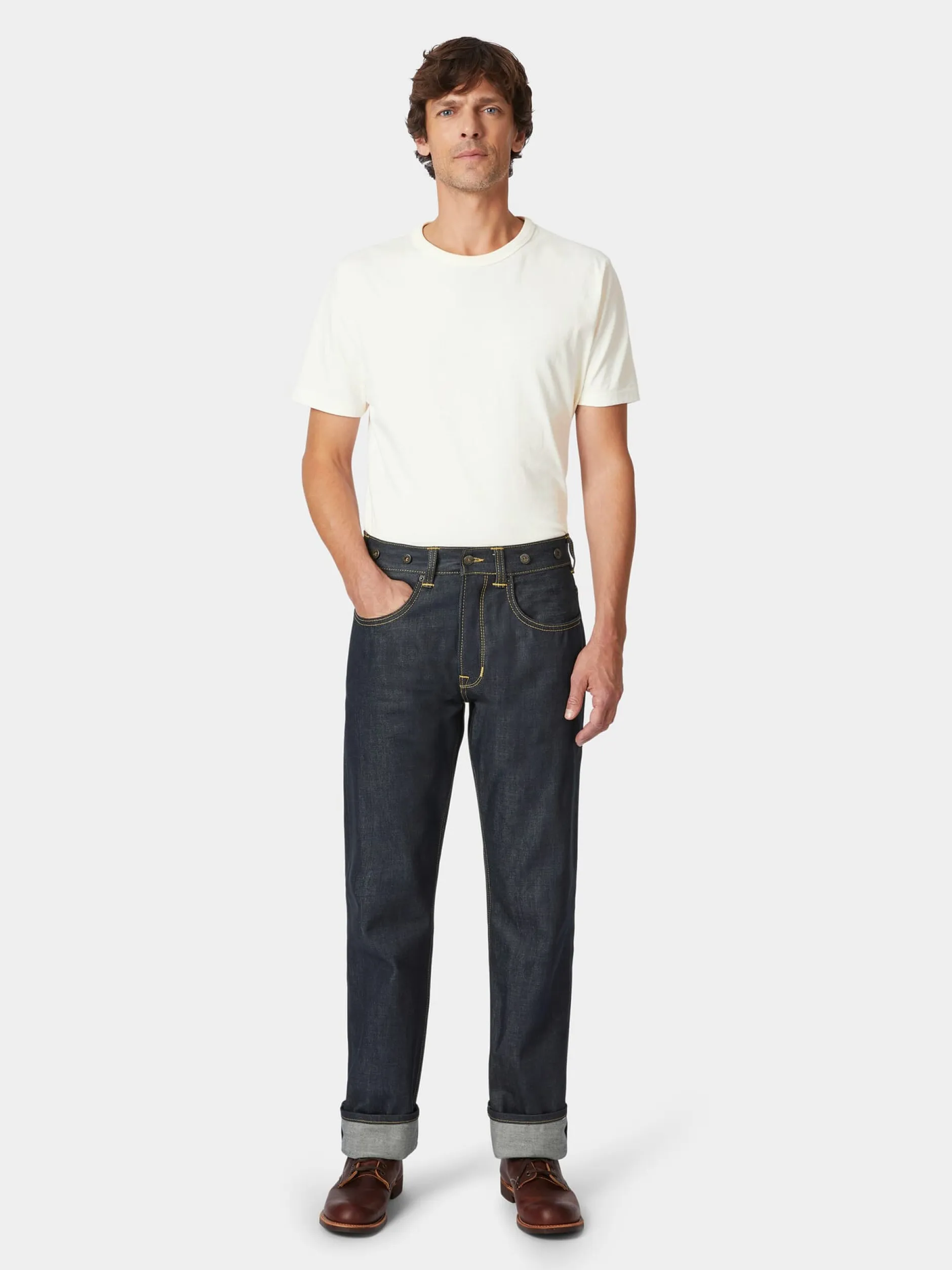 Authentisch in Material und Verarbeitung ist diese gerade geschnittene Jeans mit hohem Bund. Ihre Ursprünge liegen im Amerika der frühen 1930er Jahre, einer Zeit, in der Hosen aus Denim ausschließlich Arbeiterhosen waren. Das sieht man ihr an und merkt es auch: Der Raw Denim fühlt sich zunächst noch rau, fast brettartig an. Er wird auf alten Schützenwebstühlen gewebt, die sichtbaren Webkanten, die „selvages“, sind Ausweis seiner Herkunft. Dass eine solche Jeans eine Zeit des Eintragens erfordert, versteht sich von selbst.