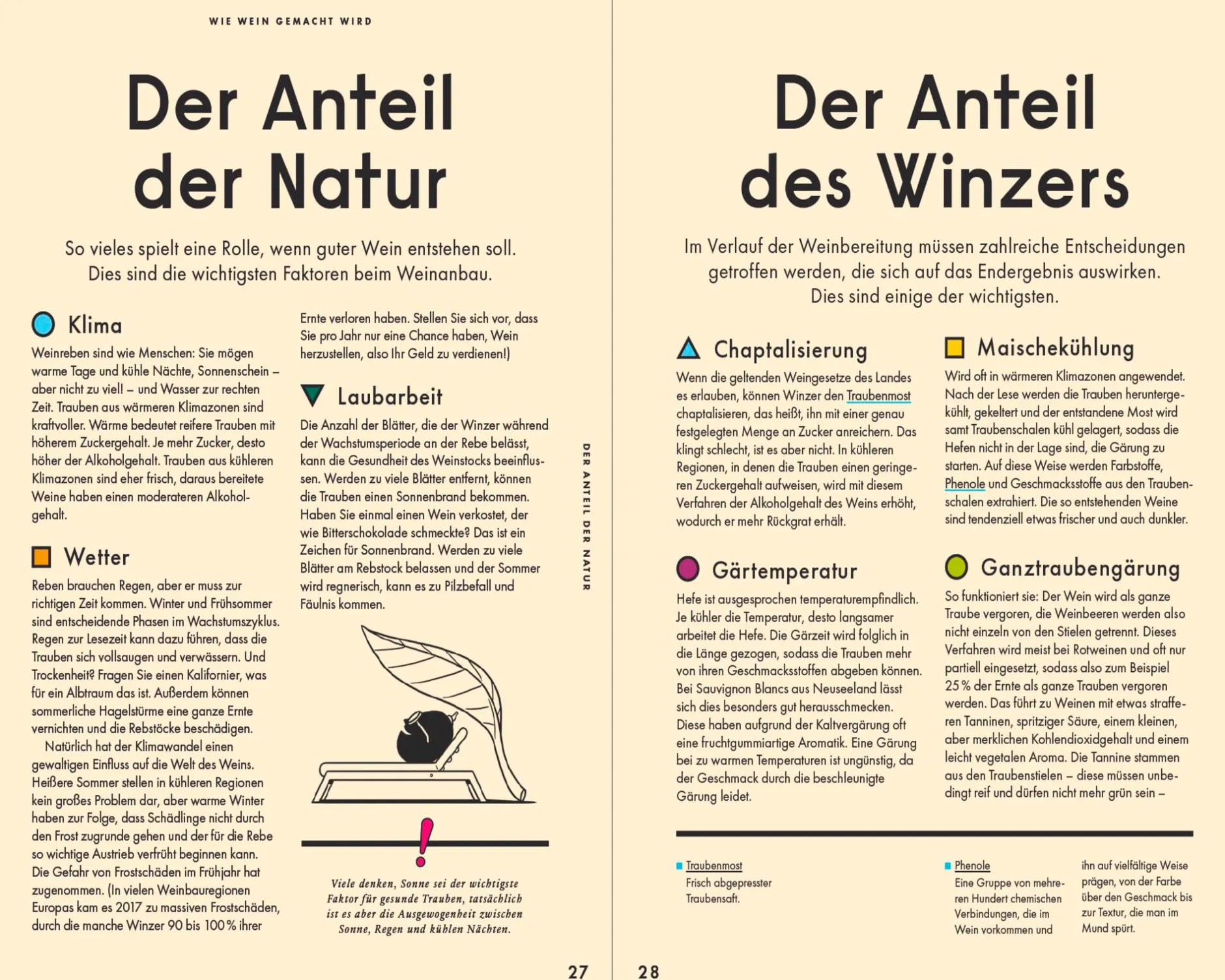 Endlich ein Weinführer ohne Schnickschnack: Der Sommelier Aldo Sohm wählt einen erfrischend anderen Ansatz und bringt das flüssige Kulturgut Einsteigern und Kennern mit gut aufbereiteten Wissenshäppchen, Spickzetteln und einer Geschmacksbibliothek nahe. Schön illustriert und gestaltet bringt das Buch auf den Punkt, worum es geht: ganz einfach Wein!