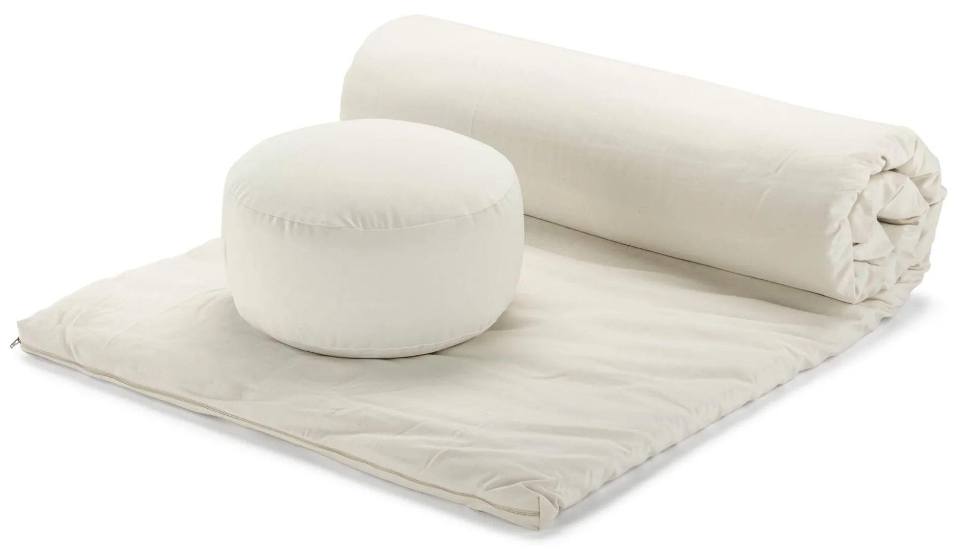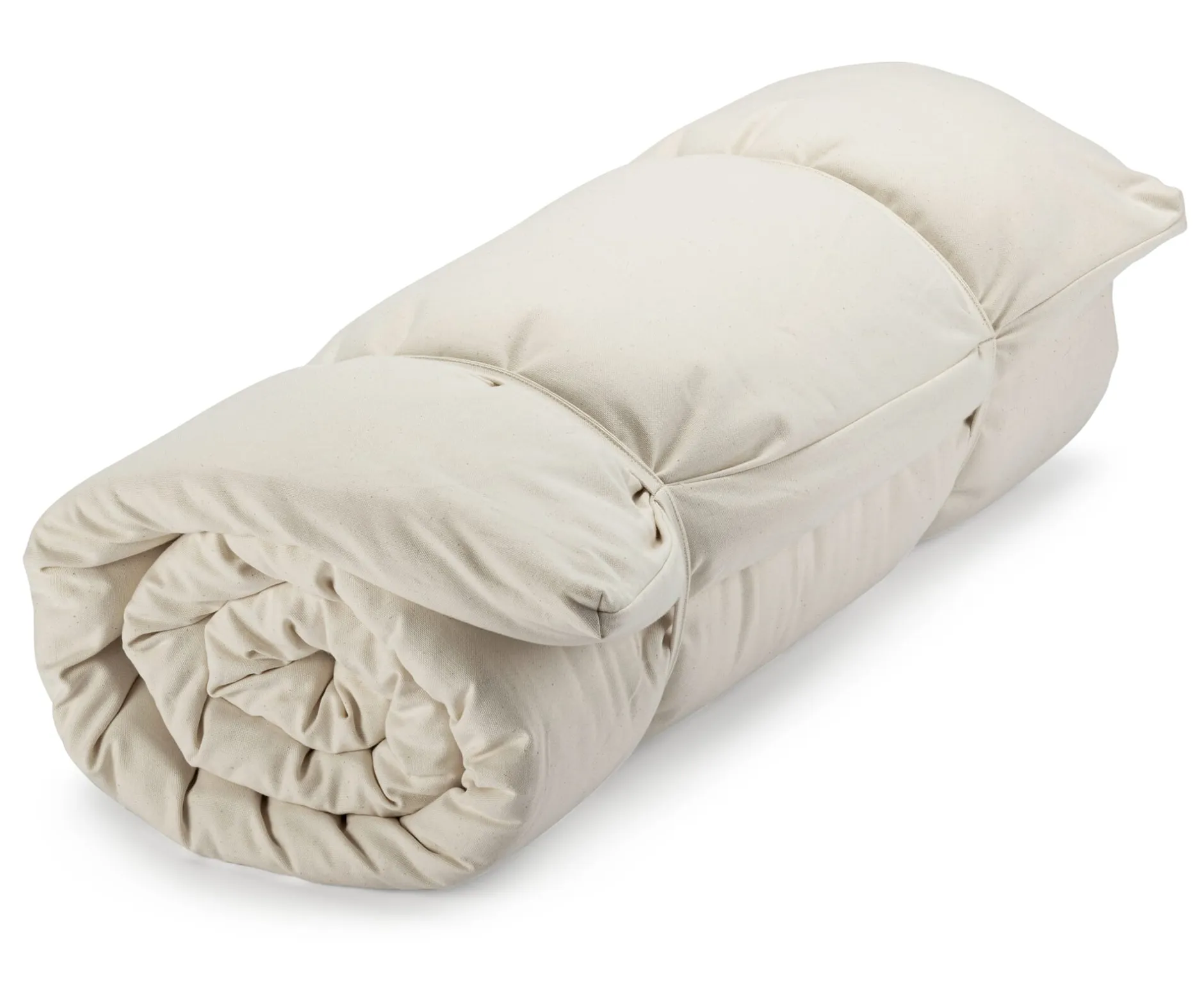 Diese Yoga- und Gymnastikmatte gibt auch ein passables Notbett ab. Ihre Füllung besteht aus einem 4 cm hohen Nadelvlies. Beim Vernadeln wird das Vlies noch mechanisch verfestigt und dadurch sehr dicht, reißfest und dennoch biegsam. Und da es außerdem punktversteppt ist, behält es auch langfristig seine Form. Der Außenbezug ist als kräftiges, strapazierbares Halbpanama-Gewebe gefertigt und bis 40 °C waschbar. Die Baumwolle für Bezug, Füllung und Inlett stammt aus kontrolliert biologischem Anbau.