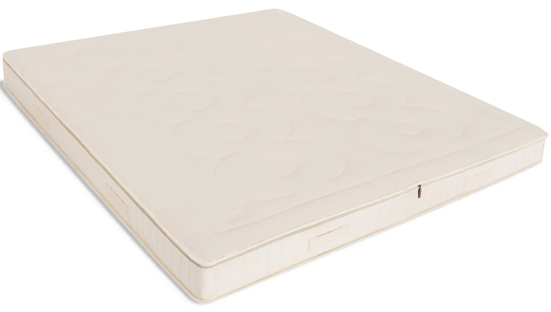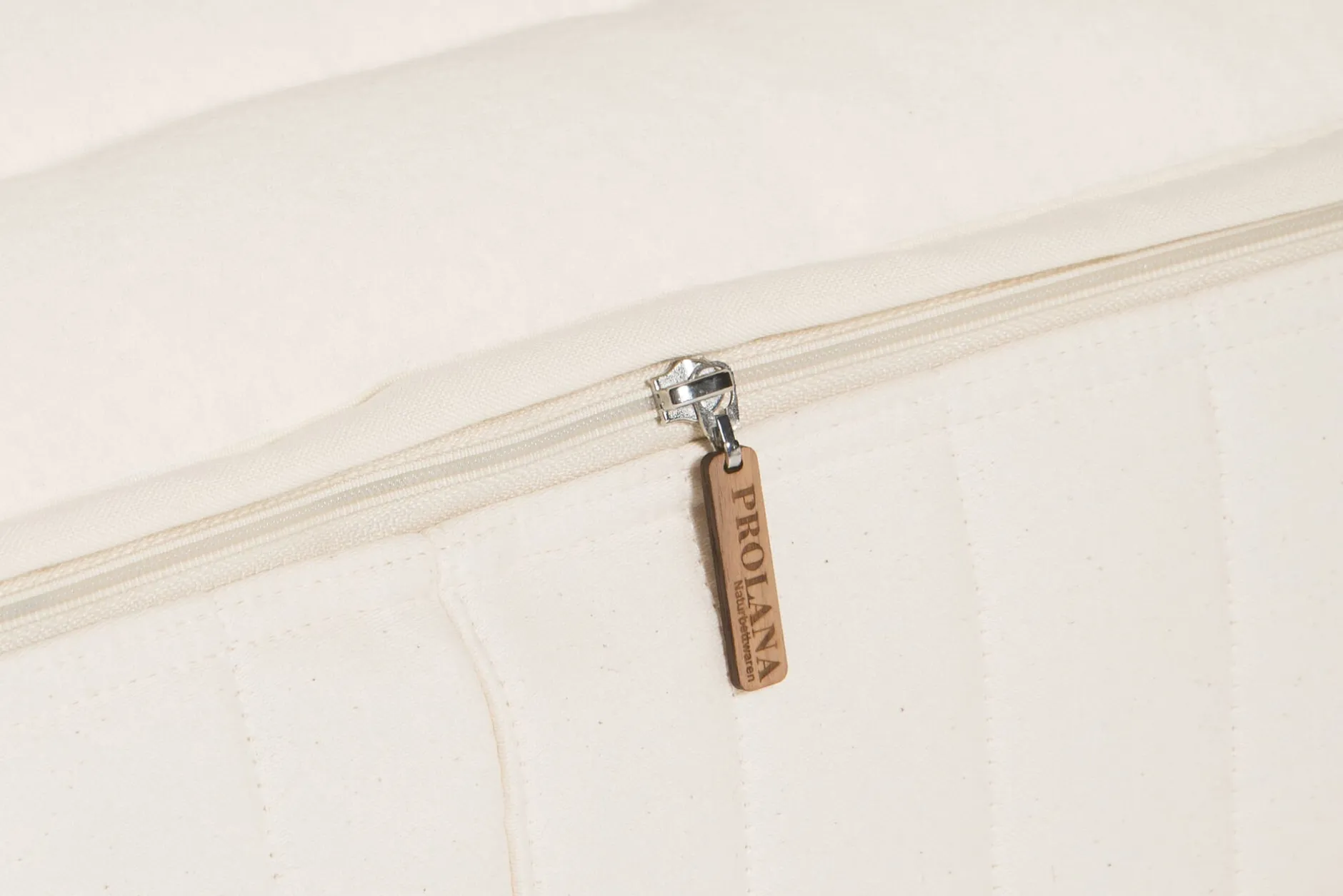 Die Hülle: Der Matratzenbezug ist zweiteilig als Wanne aus einem strapazierbaren Drellstepp und einem Deckel aus elastischem Doppeljersey (jeweils aus kbA-Baumwolle) gearbeitet. Ein umlaufender, passgenauer Reißverschluss verbindet beide Teile. Die Liegeflächen sind mit reiner, temperatur- und feuchtigkeitsausgleichender Schurwolle (kbT) versteppt. Sie nimmt die unter der Bettdecke entstehende Feuchtigkeit auf, die dann durch die Naturlatex-Matratze zur Unterseite diffundieren kann, wo die Schurwolle sie schließlich an die Umgebung ableitet. Aufgrund des großen Temperaturunterschiedes zwischen dem Mikroklima unter der Bettdecke (um die 30 °C) und der kühleren Luft unter der Matratze wird dieser Effekt noch verstärkt. Für den optimalen Feuchtigkeitsausgleich ist es daher wichtig, dass der Bezug nicht nur ober-, sondern auch unterseits mit Schurwolle versteppt ist. Zwei zusätzliche Lagen faserdicht gewebten Satins halten die feinen Wollfasern sicher in der Hülle. Der Bezug ist mit Tragegriffen an den Seiten versehen, sodass Sie die Matratze leichter bewegen können.