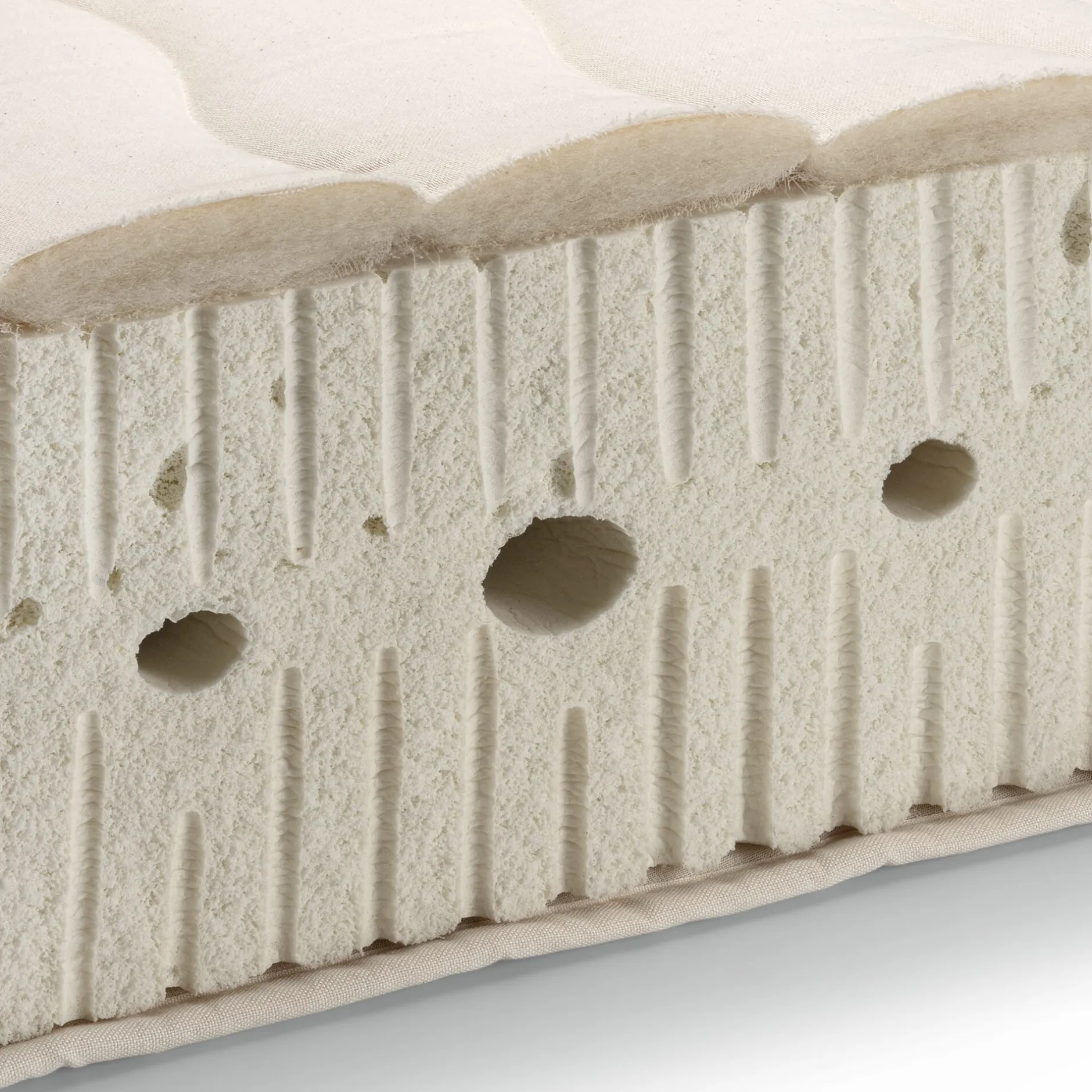 Die sehr weiche, die weiche und die mittlere Matratze sind aus reinem Naturlatex, deren jeweiliger Festigkeitsgrad über die unterschiedlichen Raumgewichte des Latexschaums erreicht wird. Sie verfügen außerdem über symmetrische Zonen und speziell für den Schulterbereich eingearbeitete Querkanäle.