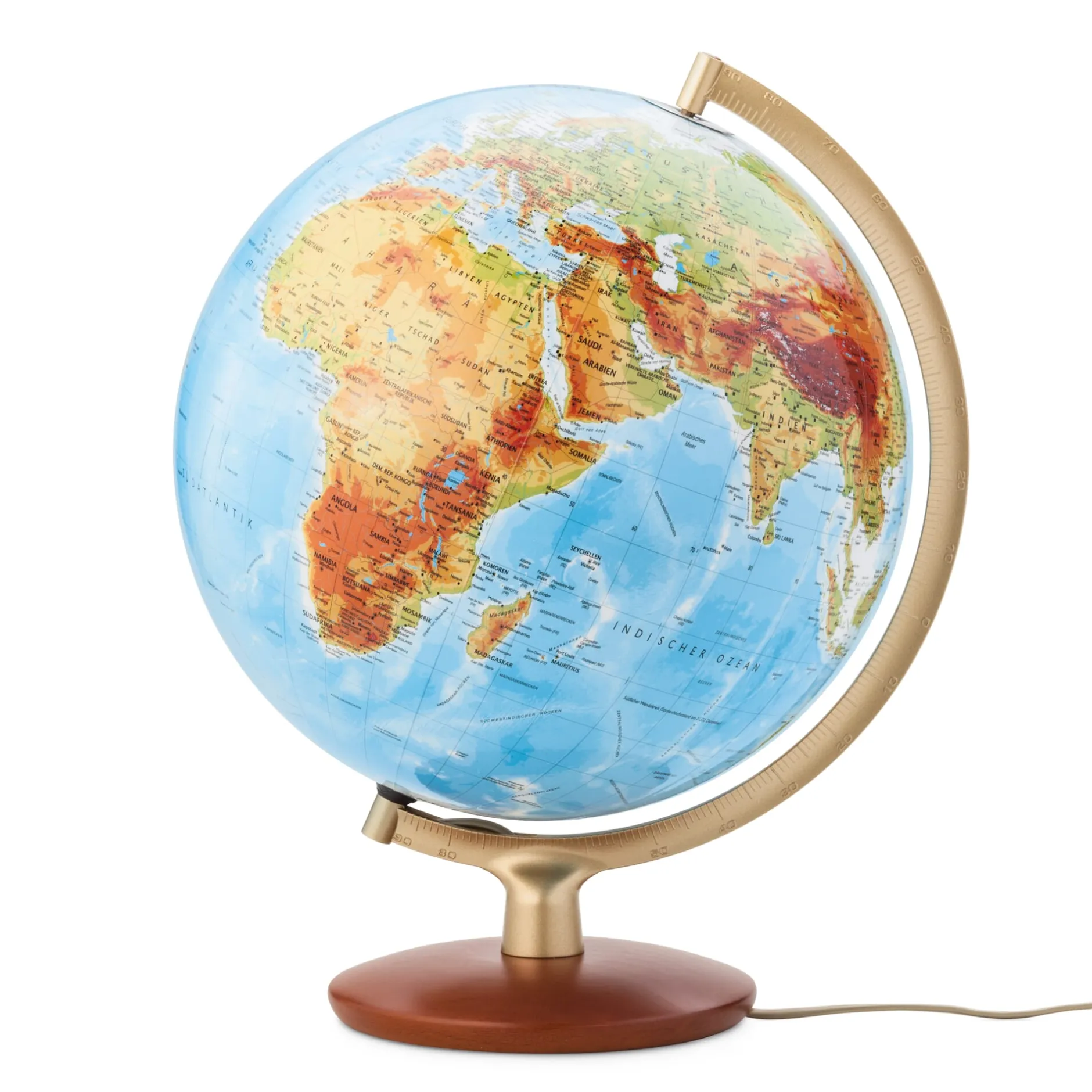 Glaskugel Ø 30 cm. Goldfarben lackierter Meridian aus Zinkdruckguss. Kirschbaumfarben gebeizter Holzfuß, Ø 18 cm. Kunststoffkabel mit Eurostecker, Länge 1,15 m.