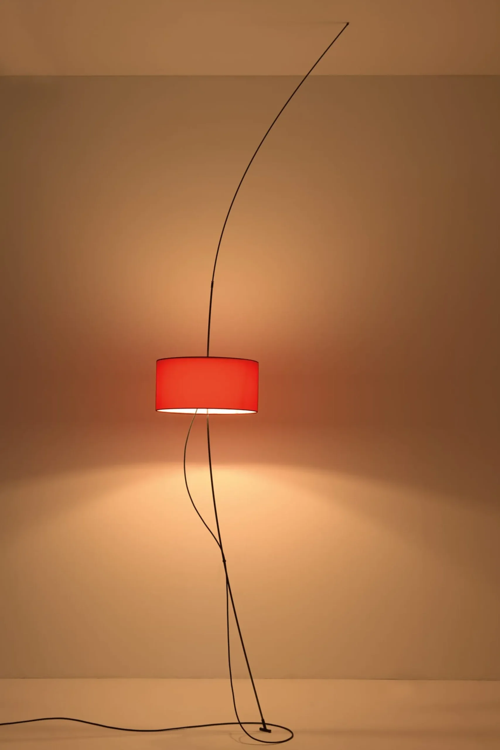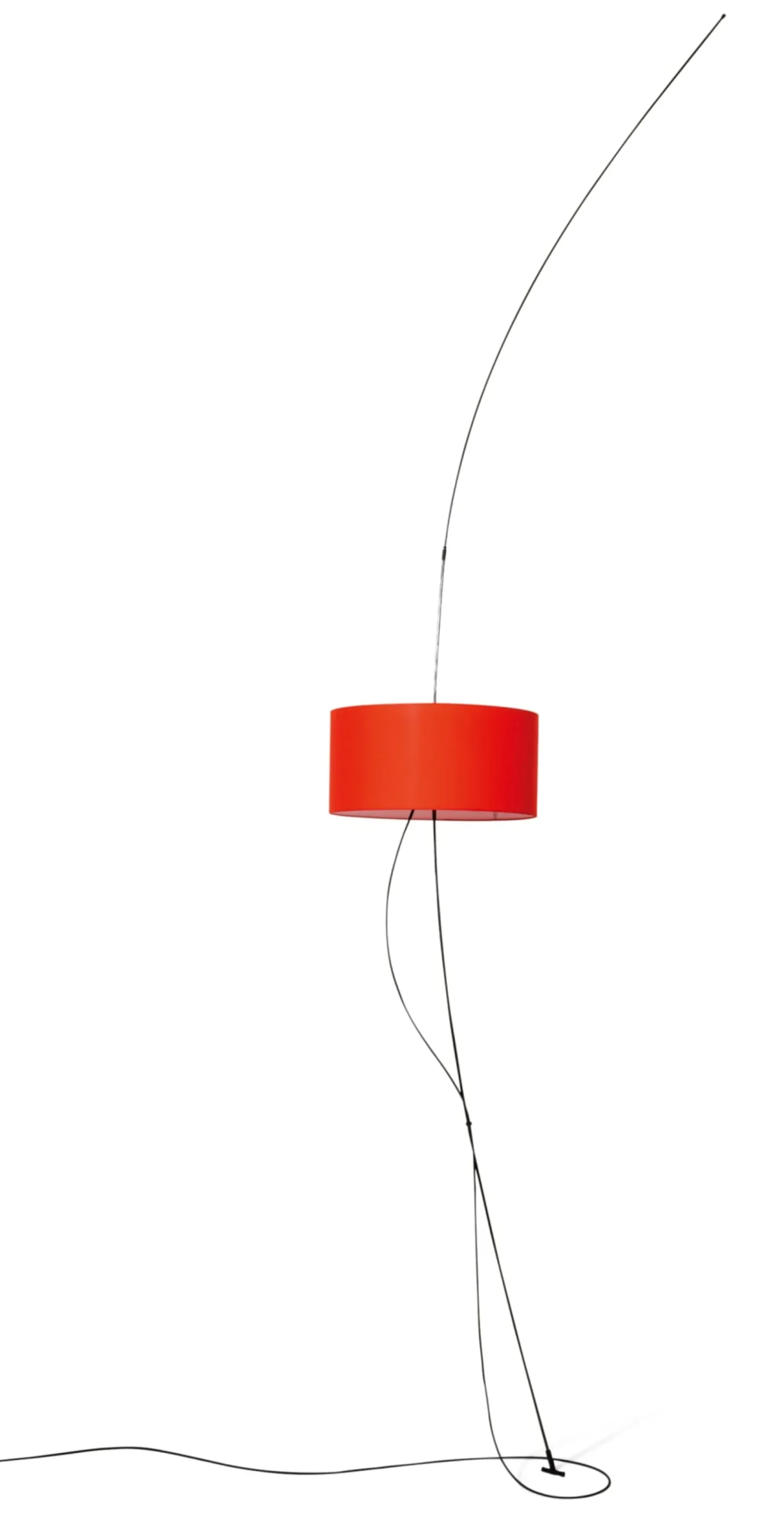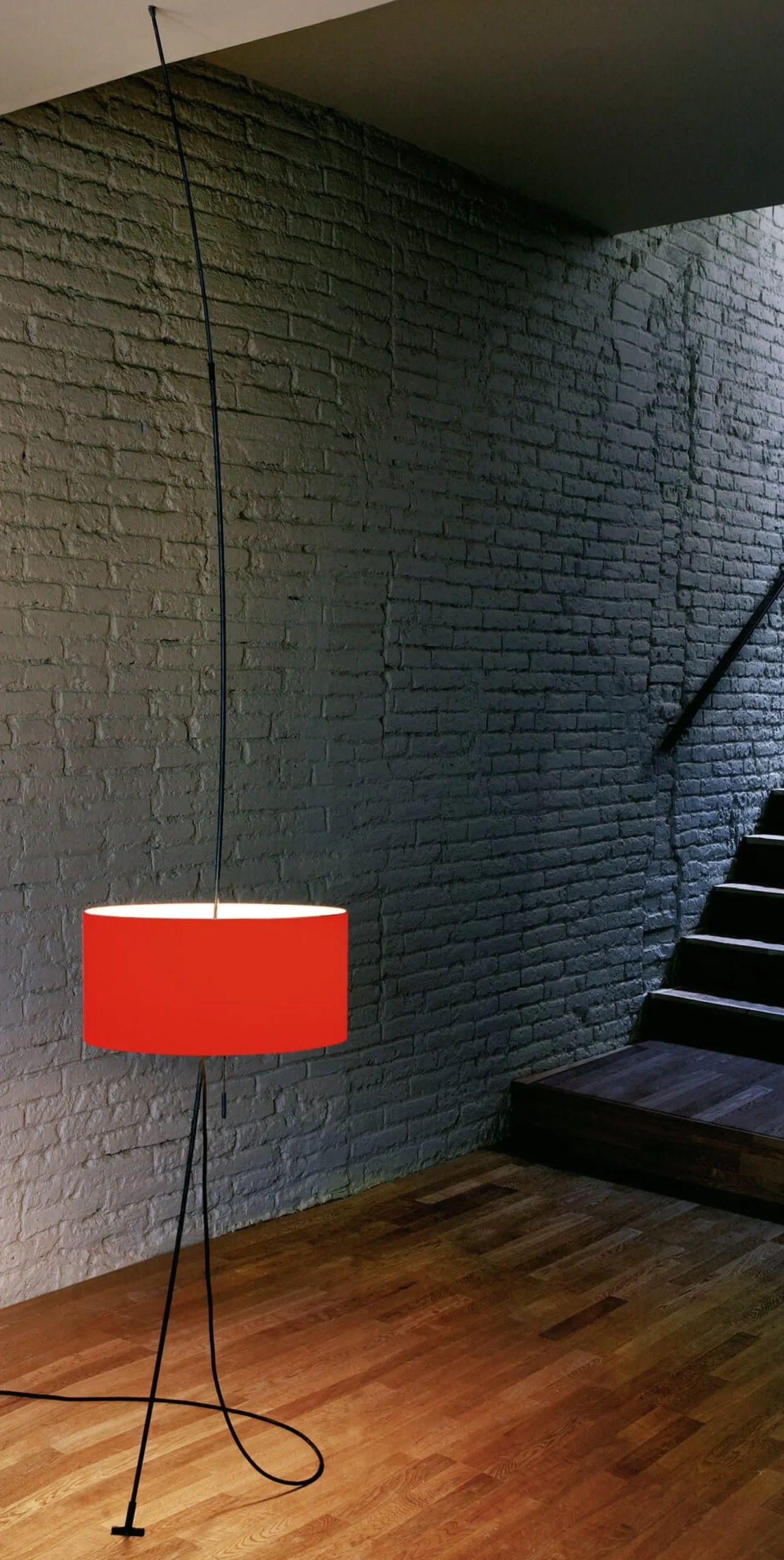 Das teleskopisch verschiebbare Tragstativ dieser Leuchte aus einem Kohlefaserstab wird zwischen Boden und Decke gespannt. Eine sehr filigrane und technisch raffinierte Lösung, die dem stufenlos höhenverstellbaren Schirm einen schwebenden Eindruck verleiht. Der Schirm ist nach oben mit einer transluzenten Scheibe aus Acrylglas geschlossen. Für Raumhöhen zwischen 220 und 330 Zentimetern mit Deckensicherung. Der Zugschalter befindet sich im Schirm der Leuchte. Fassung: 2 × E27. Leuchtmittel im Lieferumfang nicht enthalten. Leistungsaufnahme: max. 2 × 100 W. Eurostecker.