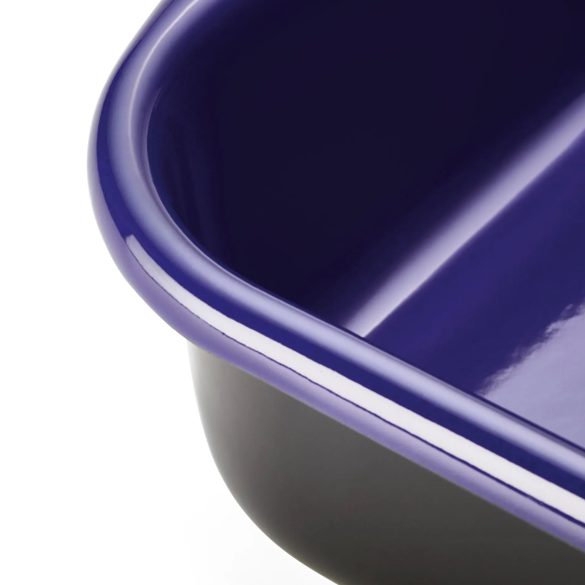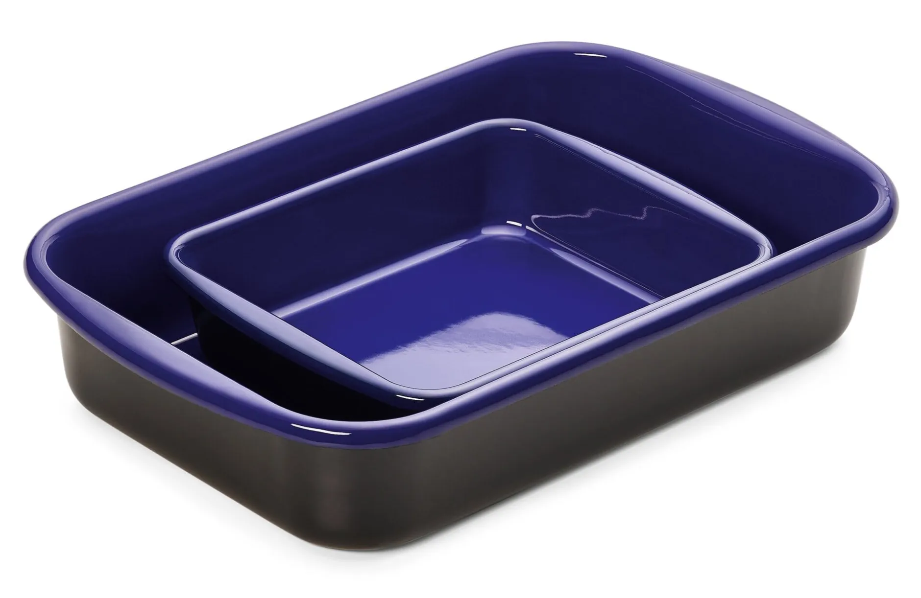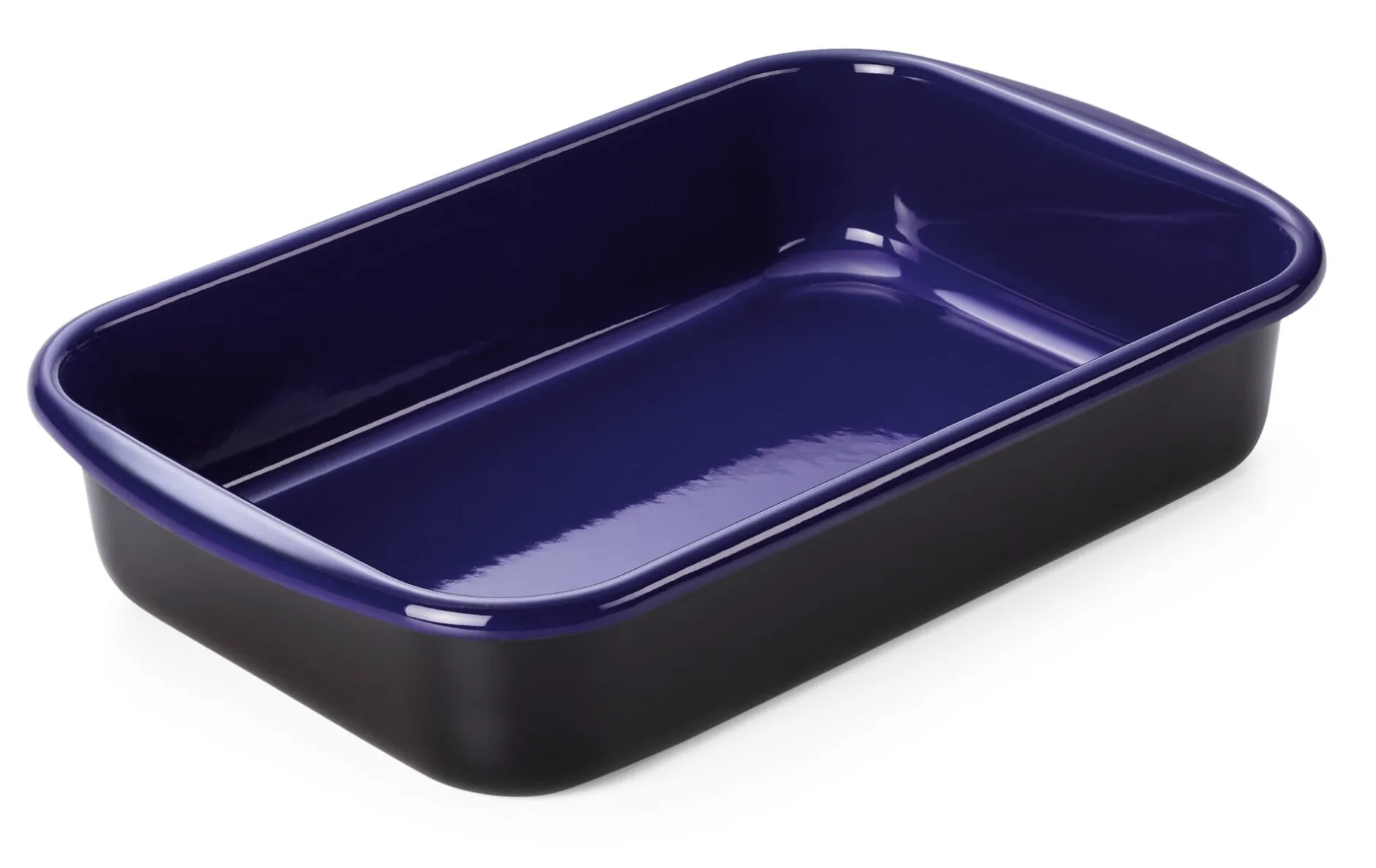 Professionelles Kochgeschirr, außen schwarz, innen kobaltblau emailliert. Tiefgezogen. Die große, rechteckige Bratrohrpfanne kann als Back- und Auflaufform genauso genutzt werden wie als Bräter. Ohne Deckel.