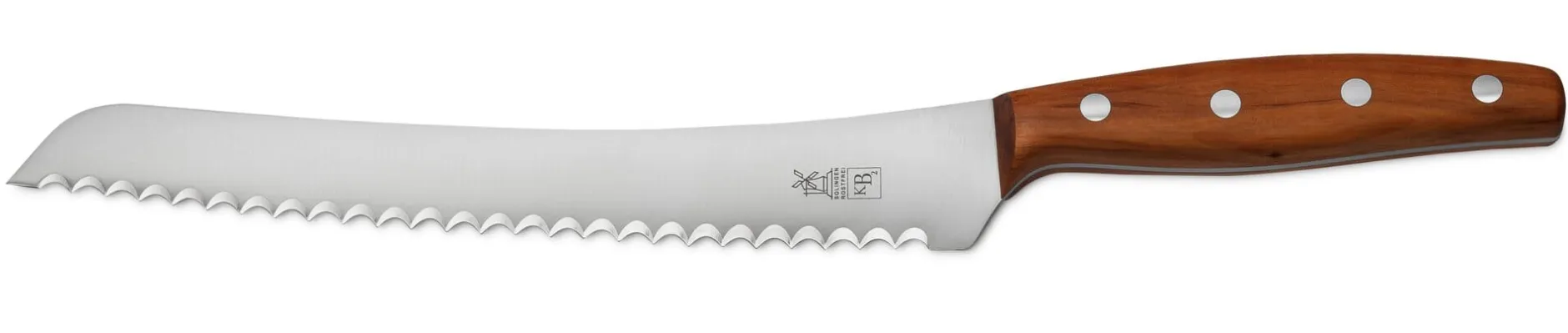 Im Verhältnis zum ergonomisch geformten Messergriff steht die Schneide leicht angewinkelt. Das erleichtert den Schneidvorgang deutlich, bis zur Unterkante auch eines größeren Brotes mit knackender Kruste geht die Klinge glatt durch. Der Messermacher sagt: Das Messer bleibt in der Schneidflucht.