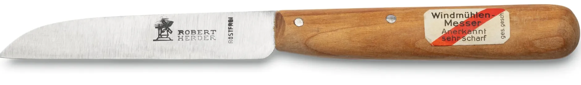 Dass mit dem Ende des Krieges längst nicht alle Gemüsemesser herausgegeben worden waren, stellte sich jedoch erst jüngst heraus, als in der Manufaktur Umbauarbeiten anstanden und die Mitarbeiter*innen sich ans Aufräumen machten. Denn über Umwege waren einige Schatzkisten hinter dem großen Ofen im ehemaligen Holz-Trockenraum gelandet – gut versteckt, gerieten sie dort in Vergessenheit. So kommt es, dass wir Ihnen hier ein Herder-Gemüsemesser anbieten können, das aus Originalbeständen aus der Zeit vor 1940 stammt. Da unbenutzt, ist die Klinge dieses „Hümmelkens“ aus rostfreiem Messerstahl noch so scharf wie am ersten Tag. Wie zum Beweis für seine Geschichte finden sich gelegentliche Spuren der Alterung nur an den Eisennieten, mit denen die Heftschalen aus fein beschliffenem Kirschbaumholz fixiert sind. Und ob Sie darin einen Gebrauchsgegenstand sehen oder ein Sammlerstück – voll funktionsfähig ist dieses Messer in jedem Fall. Eine weitere Besonderheit: Es zählt zu den ersten Messern, die in der Windmühlenmesser-Manufactur mit rostfreier Klinge hergestellt wurden.