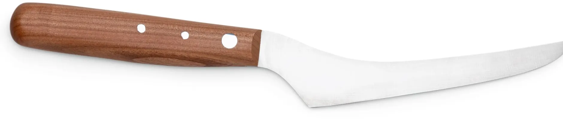 Nicht ohne Stolz wird dieses Käsemesser bei Herder „Meisterstück“ genannt. Es bringt eine schmale, scharf geschliffene und von Hand blaugepließtete Klinge mit, die sowohl über die nötige Flexibilität wie Stabilität verfügt, die es braucht, soll unterschiedlichen Käsesorten mit dem richtigen Schnitt zu „Laibe“ gerückt werden. Die leicht gebauchte Schneide geht mühelos durch weiche wie festere Käse, und selbst härtere Käserinden lassen sich beim „Abrollen“ des Messers einfach durchwiegen. Die Klinge steht zudem zum Griff in einem Winkel von rund 35°, so ergibt sich unter dem Griff und über dem Schneidbrett viel Raum: Das ermöglicht eine natürliche Handhaltung, verbessert die Kraftübertragung und erleichtert insbesondere das Käseschneiden bei Tisch, da die Hand, die das Messer führt, nicht auf dem Schneidbrett anstößt.