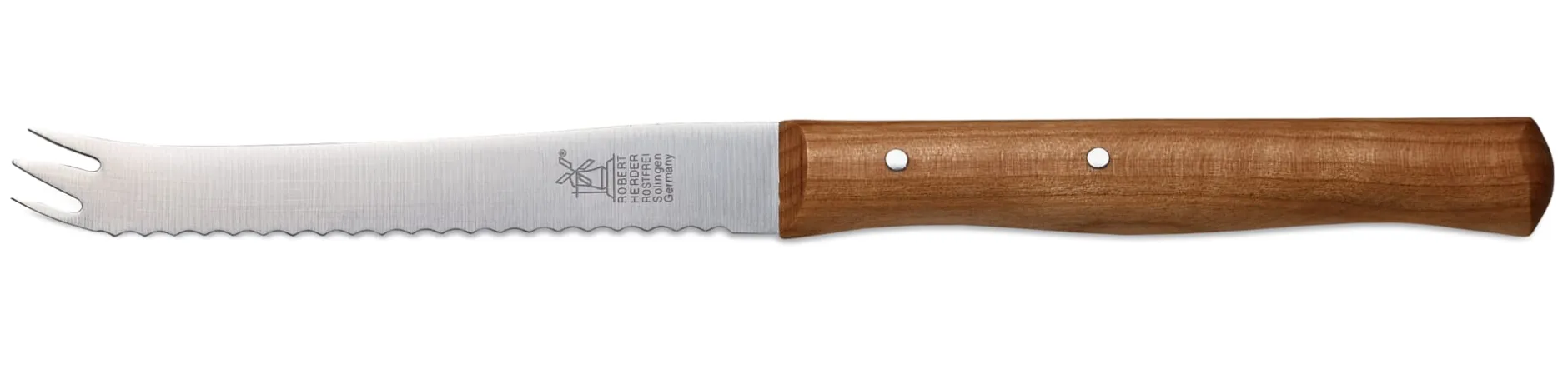 Ein Windmühlenmesser von Robert Herder in Solingen. Feingepließte Wellenschliffklinge mit Gabelspitze aus Chrom-Molybdän-Vanadium-Stahl, rostfrei. Griffe aus gedämpftem und poliertem Kirschholz.