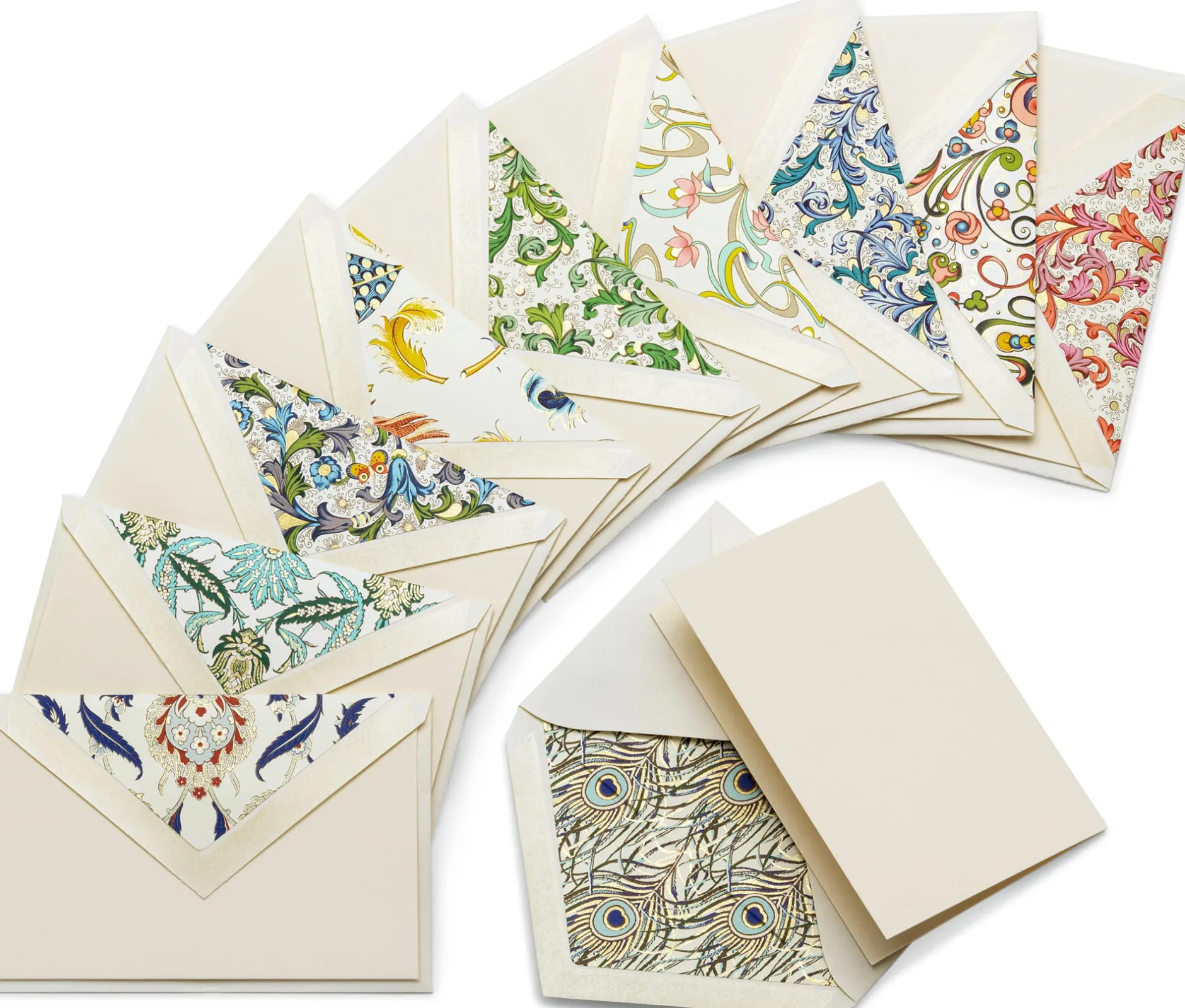 10 Grußkarten aus Baumwollpapier (240 g/qm) im Format 8,5 × 13 cm (geklappt) mit 10 passenden Baumwollpapier-Kuverts (120 g/qm) im Format 11,5 × 16,5 cm. Die Kuverts sind mit 10 verschiedenen Florentiner Papieren gefüttert. Hergestellt in Italien.