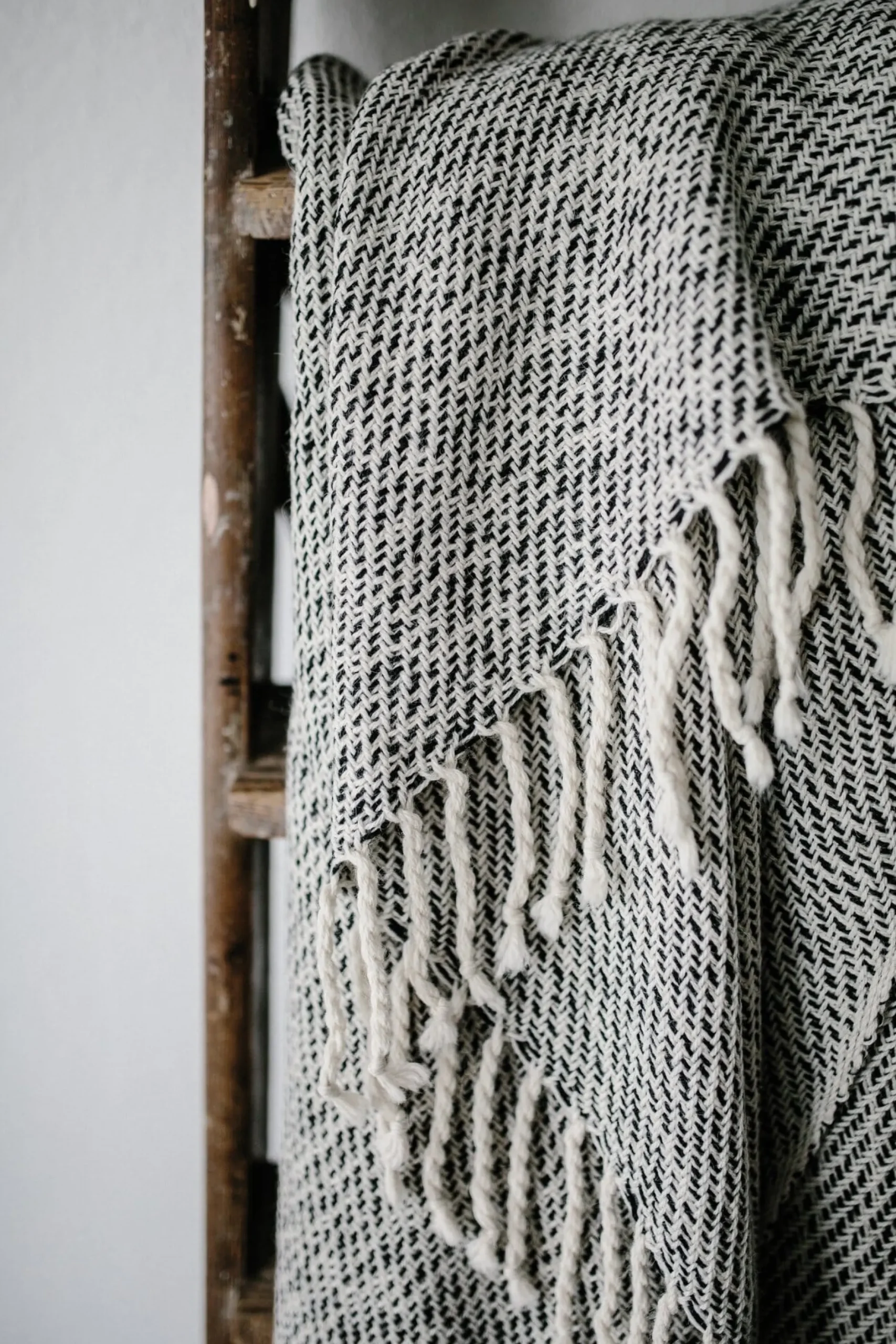 Aus weichem, leichtem Babyalpaka ist diese Decke gewebt. Babyalpaka stammt häufig von den Jungtieren aus der ersten Schur, aber auch das Haar der adulten Tiere wird Babyalpaka genannt, wenn die Faserfeinheit zwischen 19 und 21,9 Mikrometern liegt, es also äußerst fein ist. Im Schuss werden hier zwei Fäden, einer in Schwarz, der andere in Weiß, eingesetzt, die sich beim Weben leicht verdrillen und so der Decke die lebendige Oberfläche verleihen.