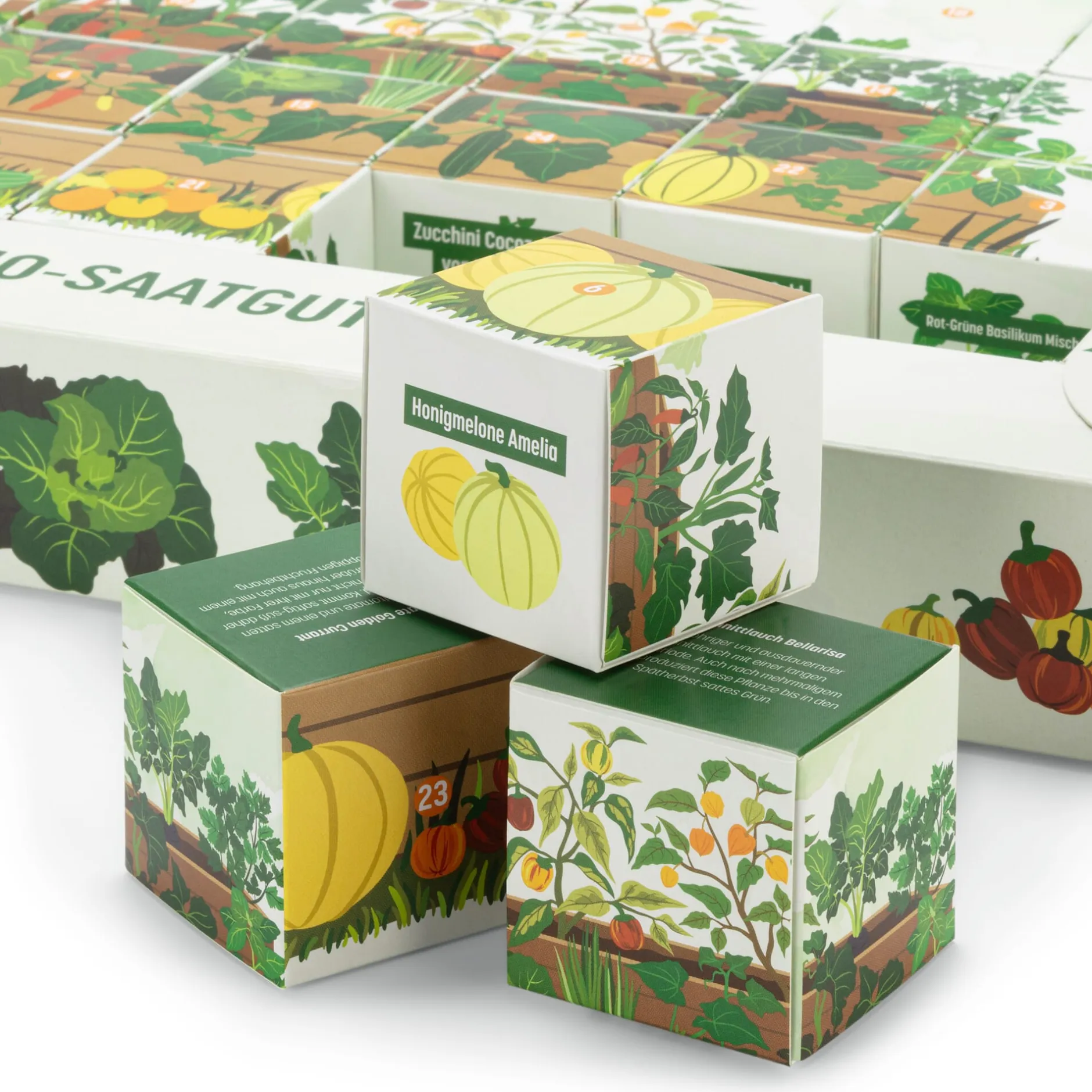 Kalender aus Papier und Karton zum Aufstellen. Mit 24 nummerierten Saatgut-Würfeln. Enthalten ist jeweils ein Papiertütchen aus Graspapier mit Saatgut und einer kurzen Pflanz- und Pflegeanleitung. Gesamtformat 32,3 × 24,5 × 4,3 cm. Gewicht (mit Inhalt) 290 g.