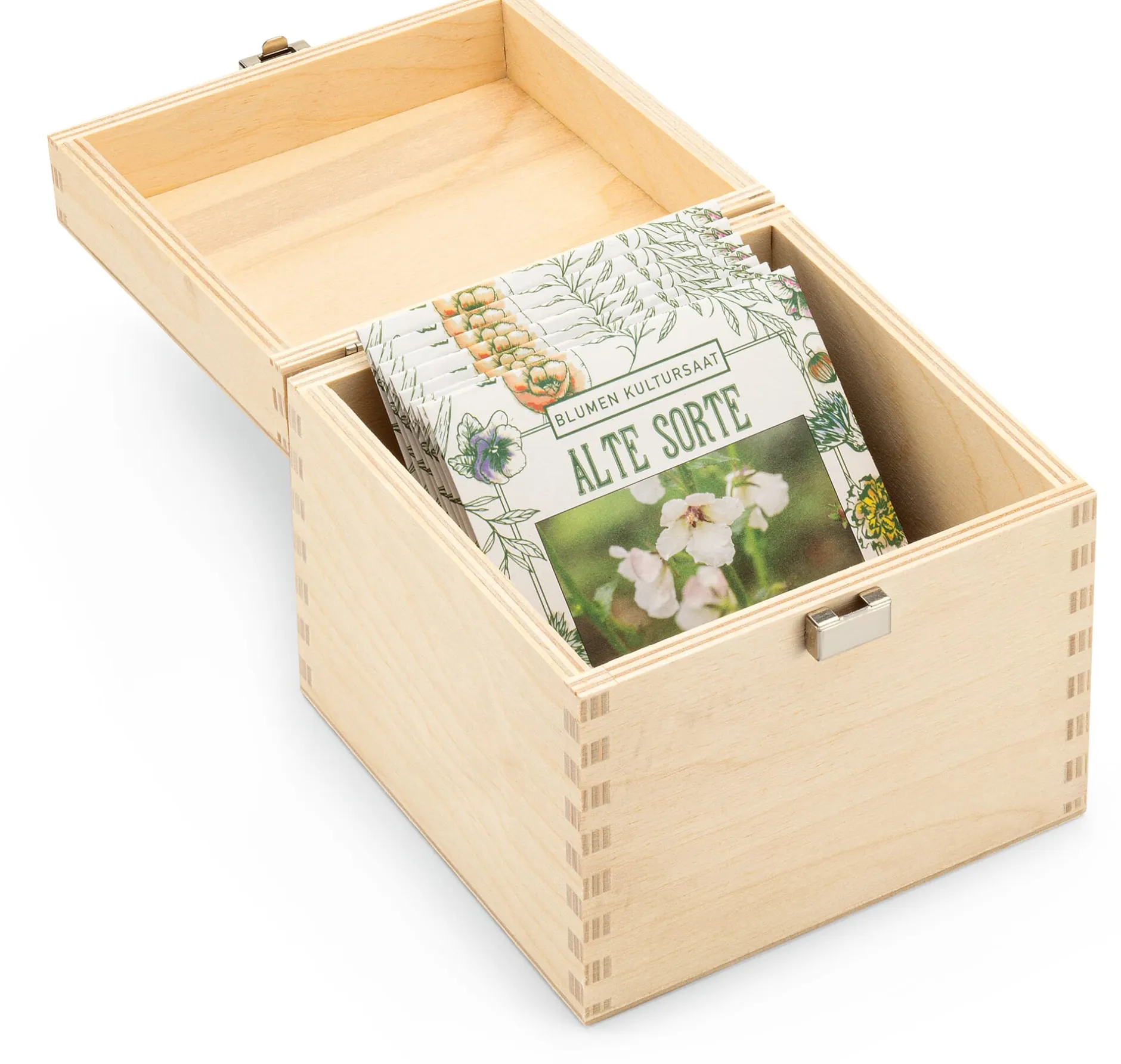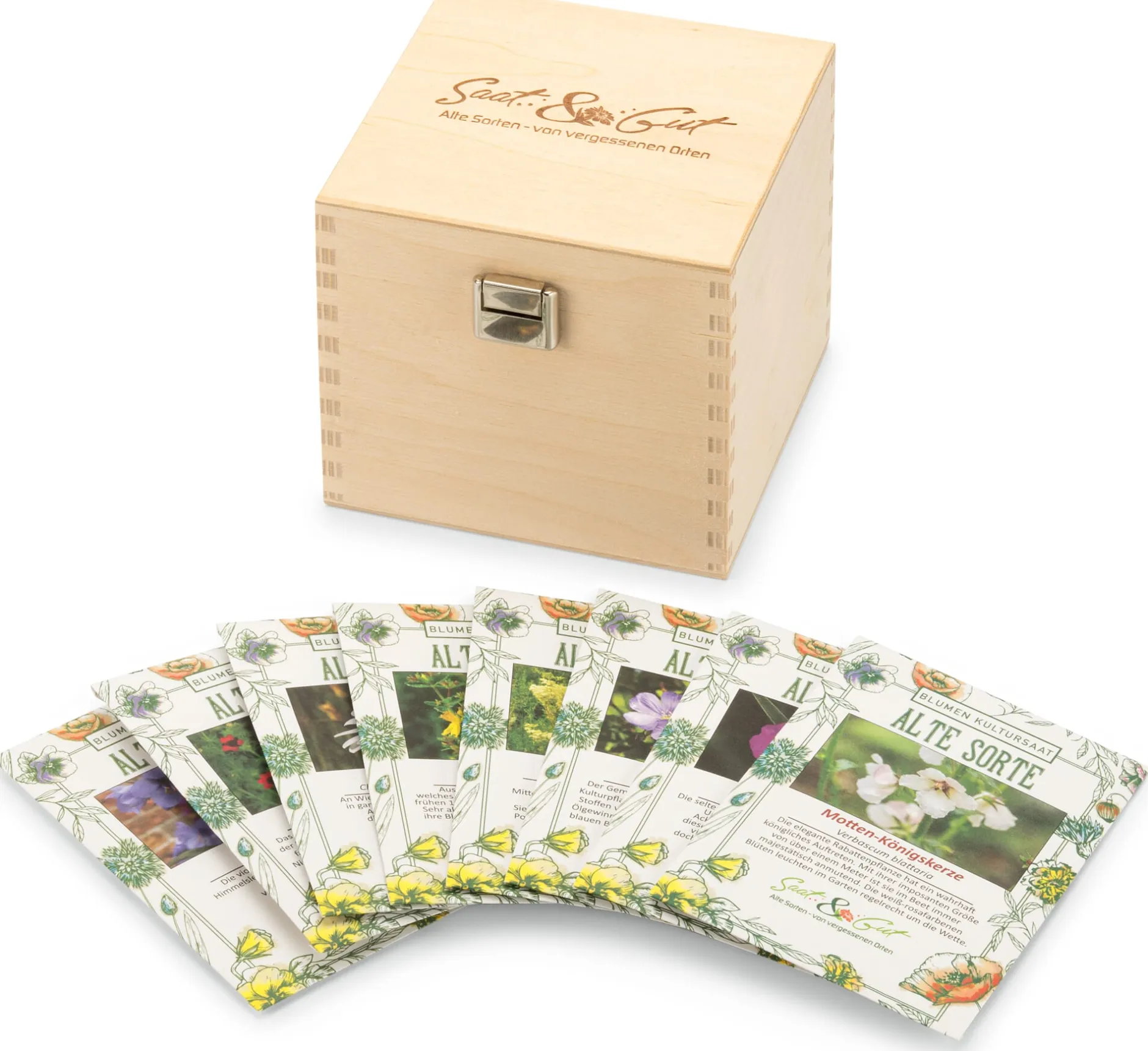 Je 8 Saatguttütchen in einem Kästchen aus Birkensperrholz (Herkunft Österreich/Europa). 11,2 × 10,6 × 11,2 cm. Gewicht (mit Inhalt) 265 g. Die Angaben zu Standort, Aussaat und Pflege befinden sich auf den Samentütchen.