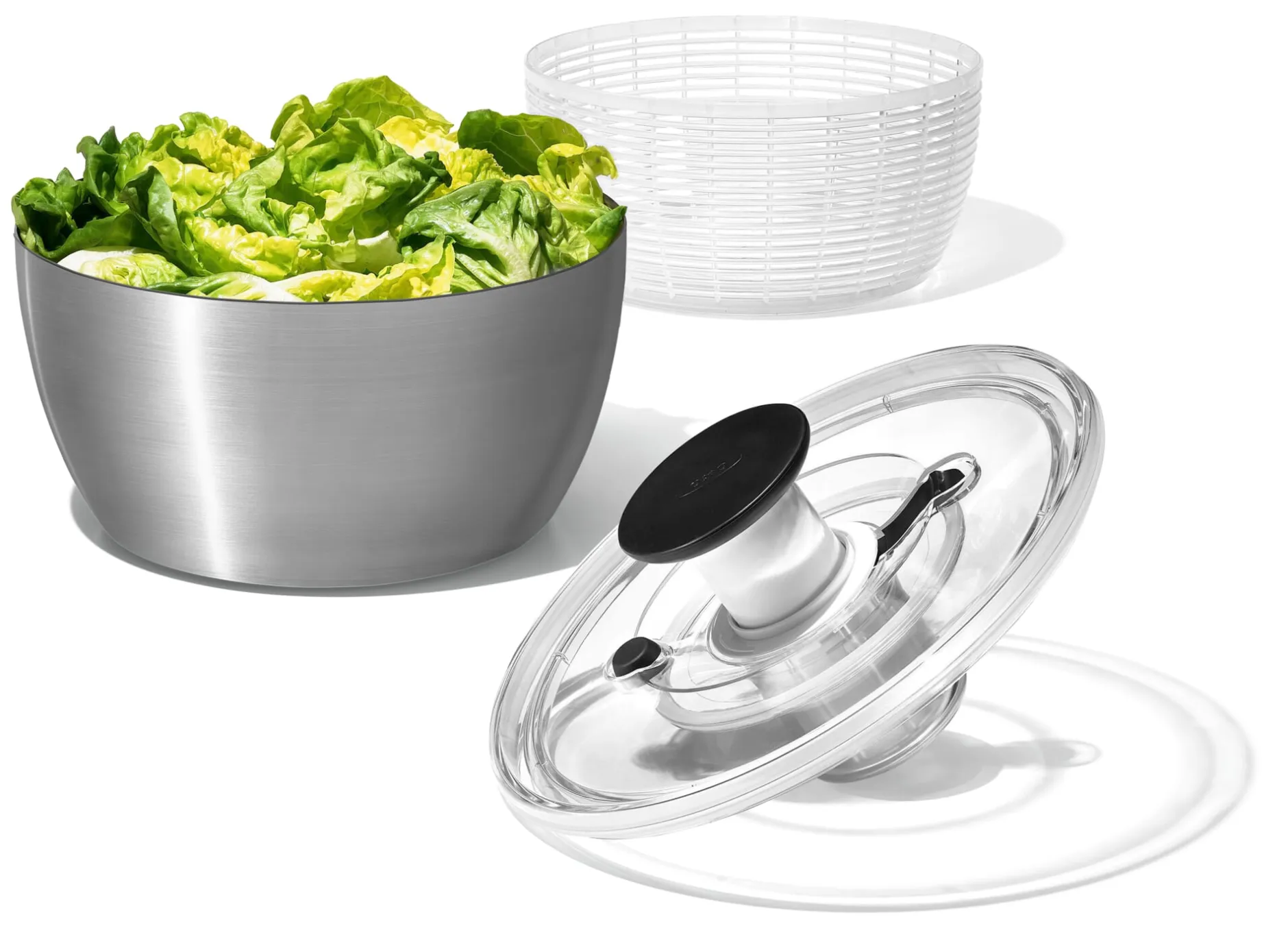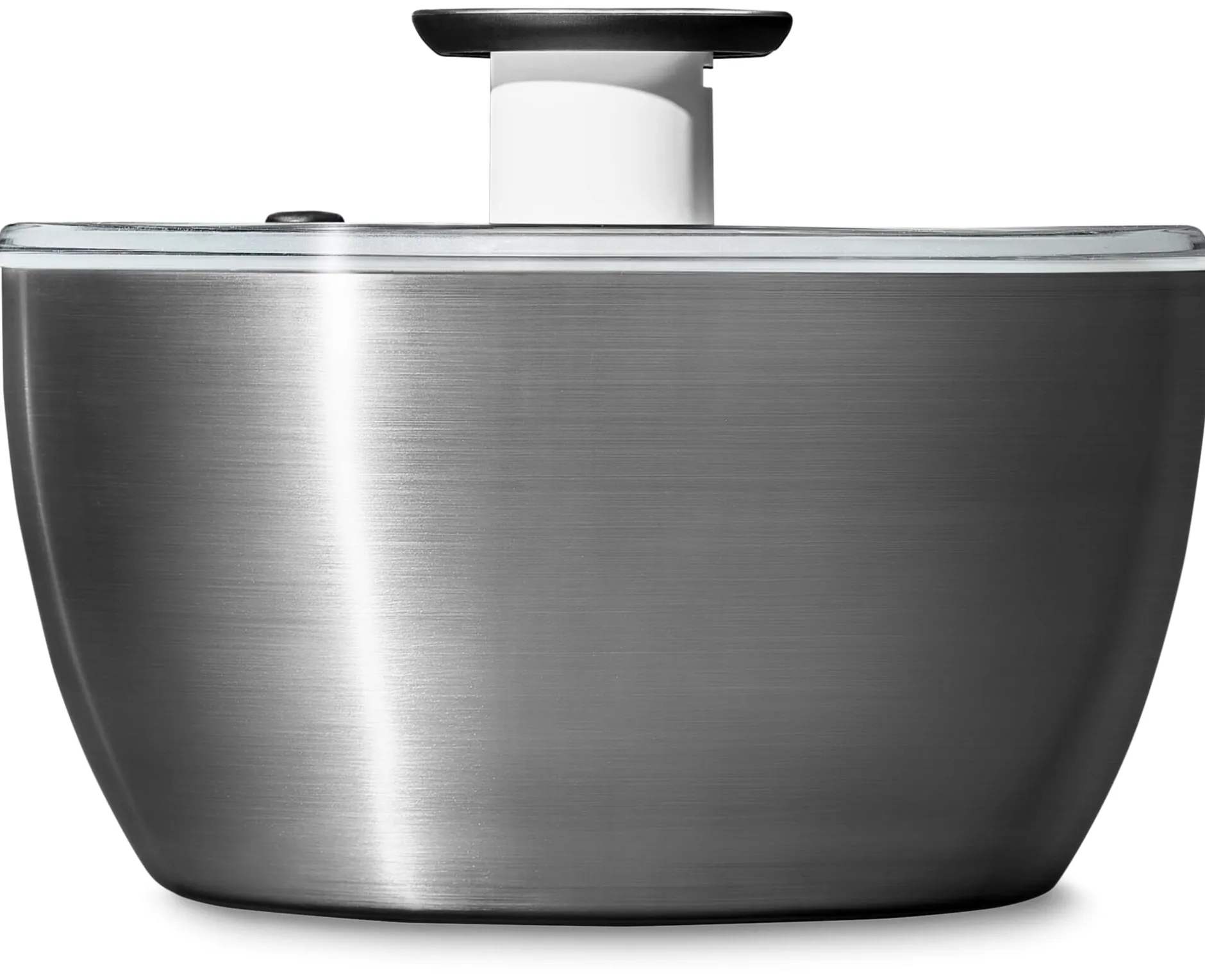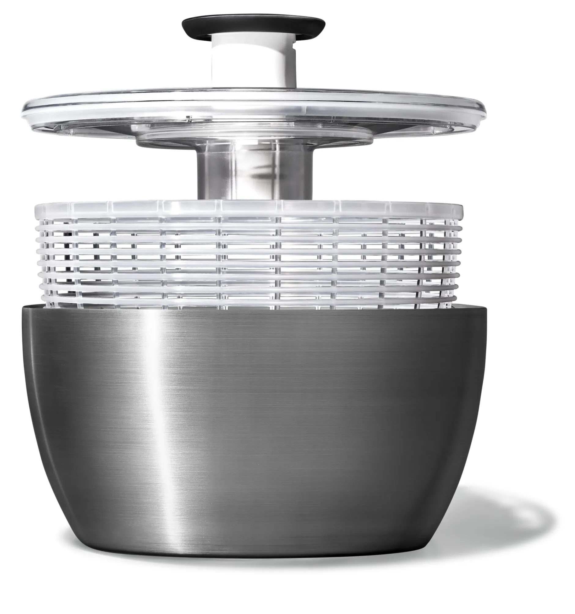 Große Salatschleuder mit Glas- oder Edelstahlschüssel: ROTOR 2.0 ist ausgestattet mit einem patentierten Pumpmechanismus – der Innenbehälter wird durch Drücken des Softgrip-Knopfs in Rotation versetzt. Die patentierte Bremse stoppt den Korb sofort mit einem einfachen Druck. Mühelos mit einer Hand zu bedienen und als Arbeitsgerät wie als Servierschüssel gleichermaßen nutzbar. Der zentral sitzende Knopf der Mechanik wird in der unteren Position zum platzsparenden Verstauen verriegelt. Der transparente Deckel lässt sich zum einfachen Reinigen demontieren. Für die Spülmaschine geeignet.