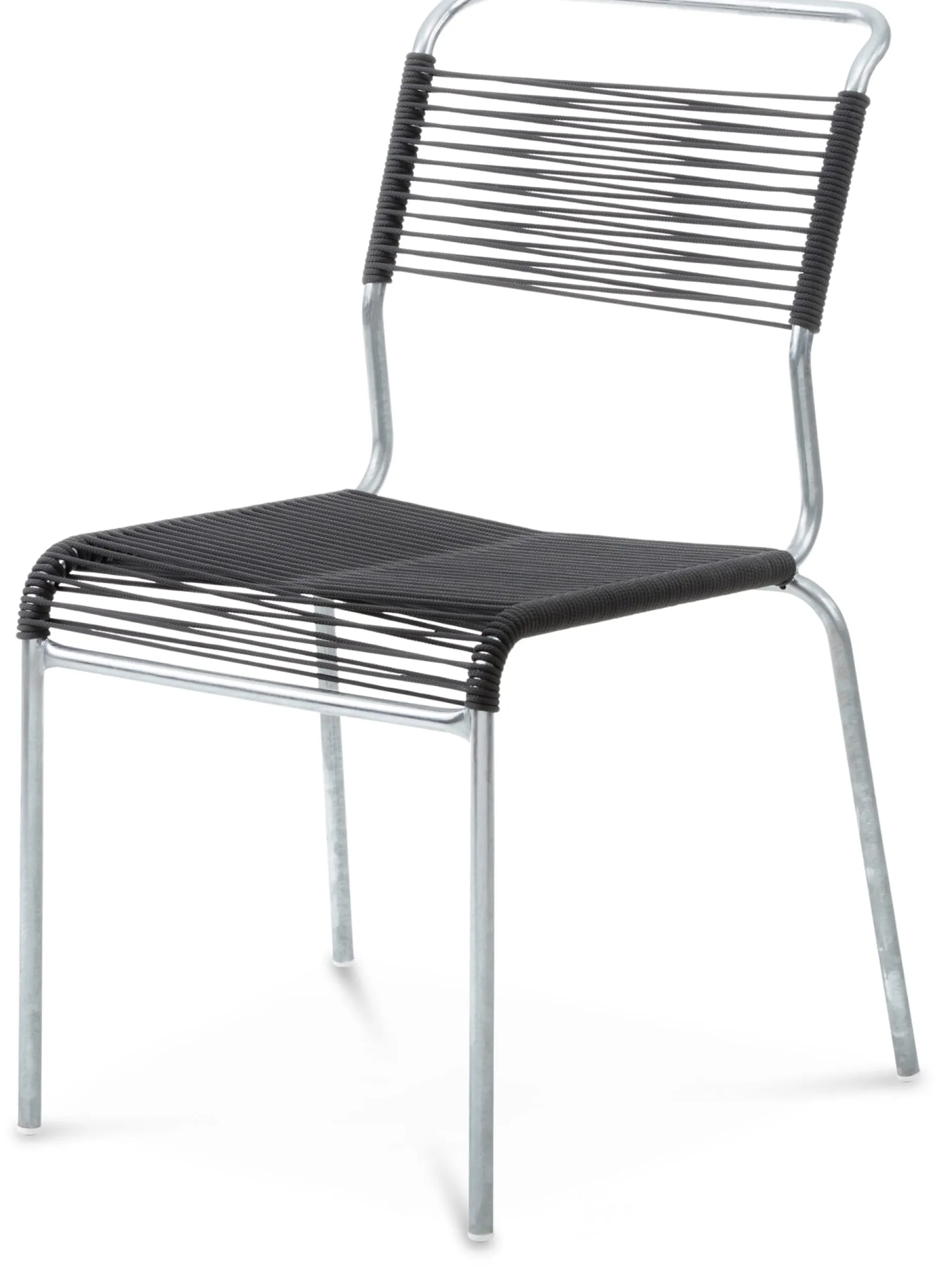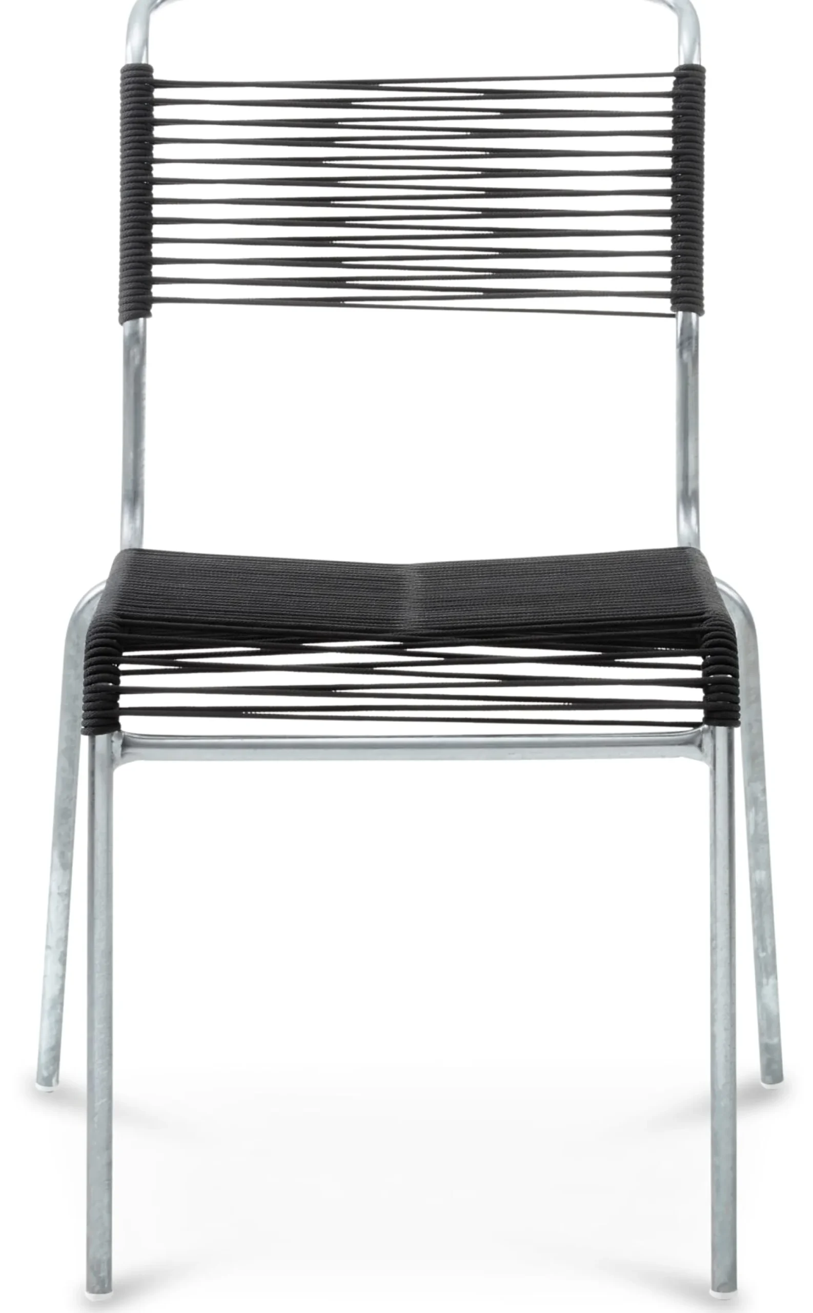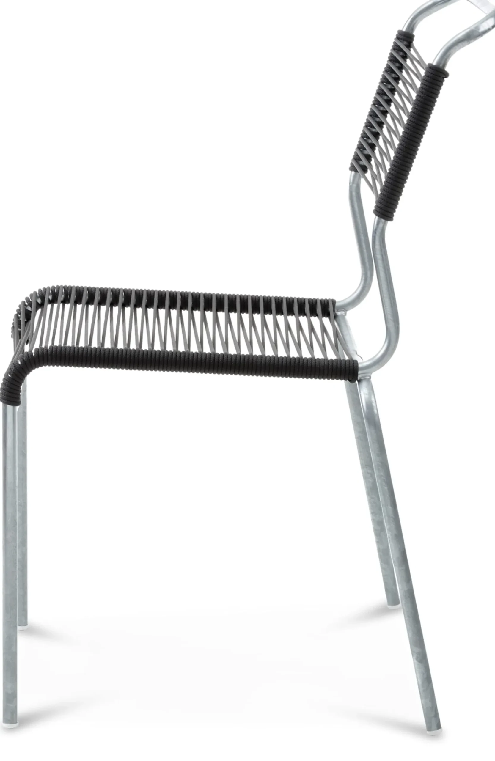 Robuster, feingliedriger, stapelbarer Stuhl – in dieser Version mit einer aus OceanYarn® produzierten Seilbespannung. Diese ist elastisch, was für besonderen Sitzkomfort sorgt, da sie sich der individuellen Belastung durch Körpergewicht (max. Belastungsgewicht 120 kg) und Sitzhaltung anpasst. Das hochwertige Seilmaterial besitzt eine textile Struktur. Das feuerverzinkte Stahlrohrgestell ist sehr robust und gegen alle Witterungsbedingungen gefeit.