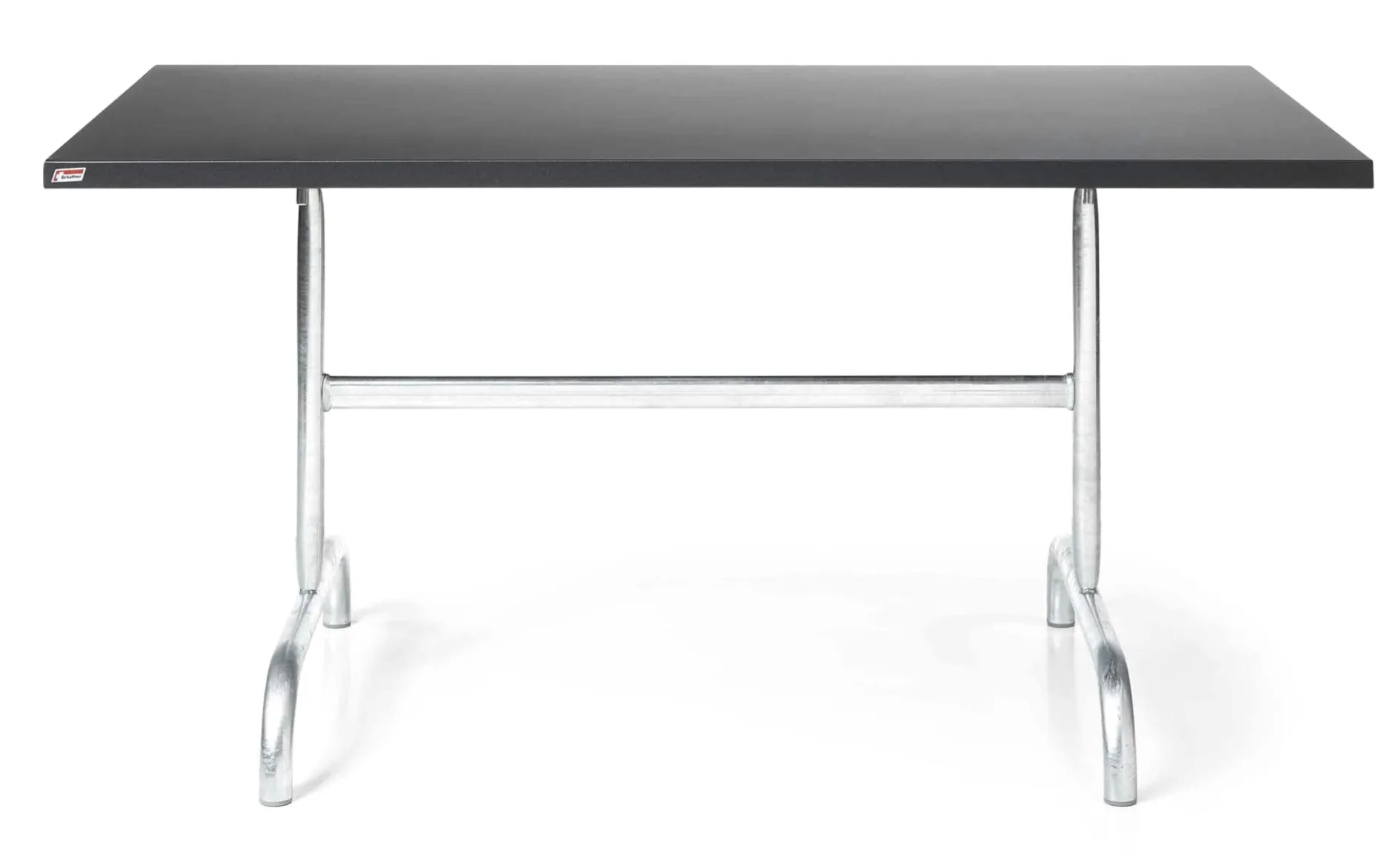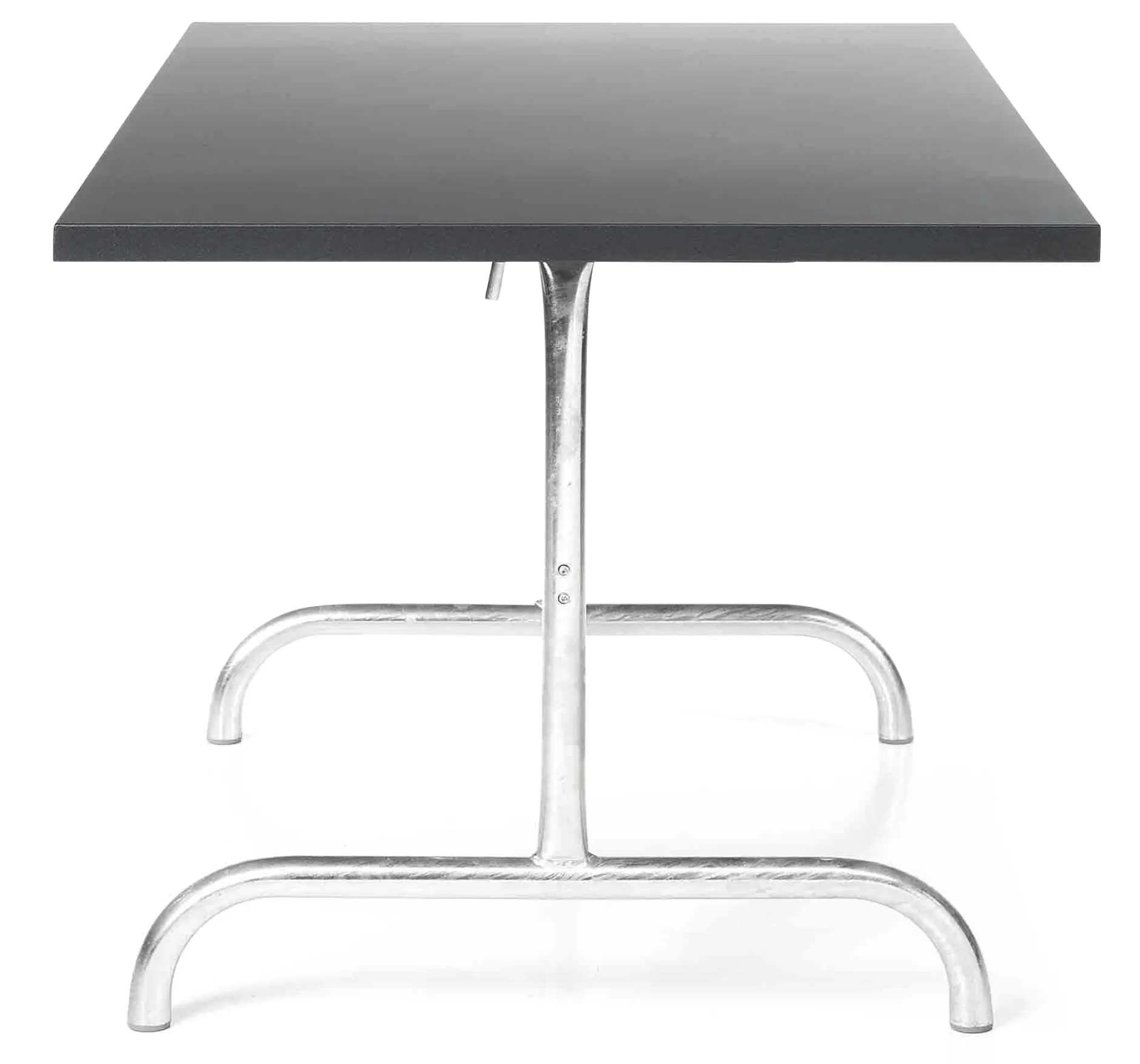 Robuster rechteckiger Tisch für den Außenbereich. Der mit einem feuerverzinkten Gestell ausgestattete Tisch stammt aus einem Schweizer Familienbetrieb, der sich in 3. Generation auf die Fertigung von hochwertigen Möbeln für die Außenmöblierung spezialisiert hat. Die Platte ist abklappbar, besitzt eine Schutzarretierung und ist bei Bedarf zur platzsparenden Unterbringung mit einem Handgriff abnehmbar. Höhenverstellbare Stellfüße aus Kunststoff schützen empfindliche Untergründe. Der Tisch kommt demontiert und lässt sich mit geringem Aufwand montieren.