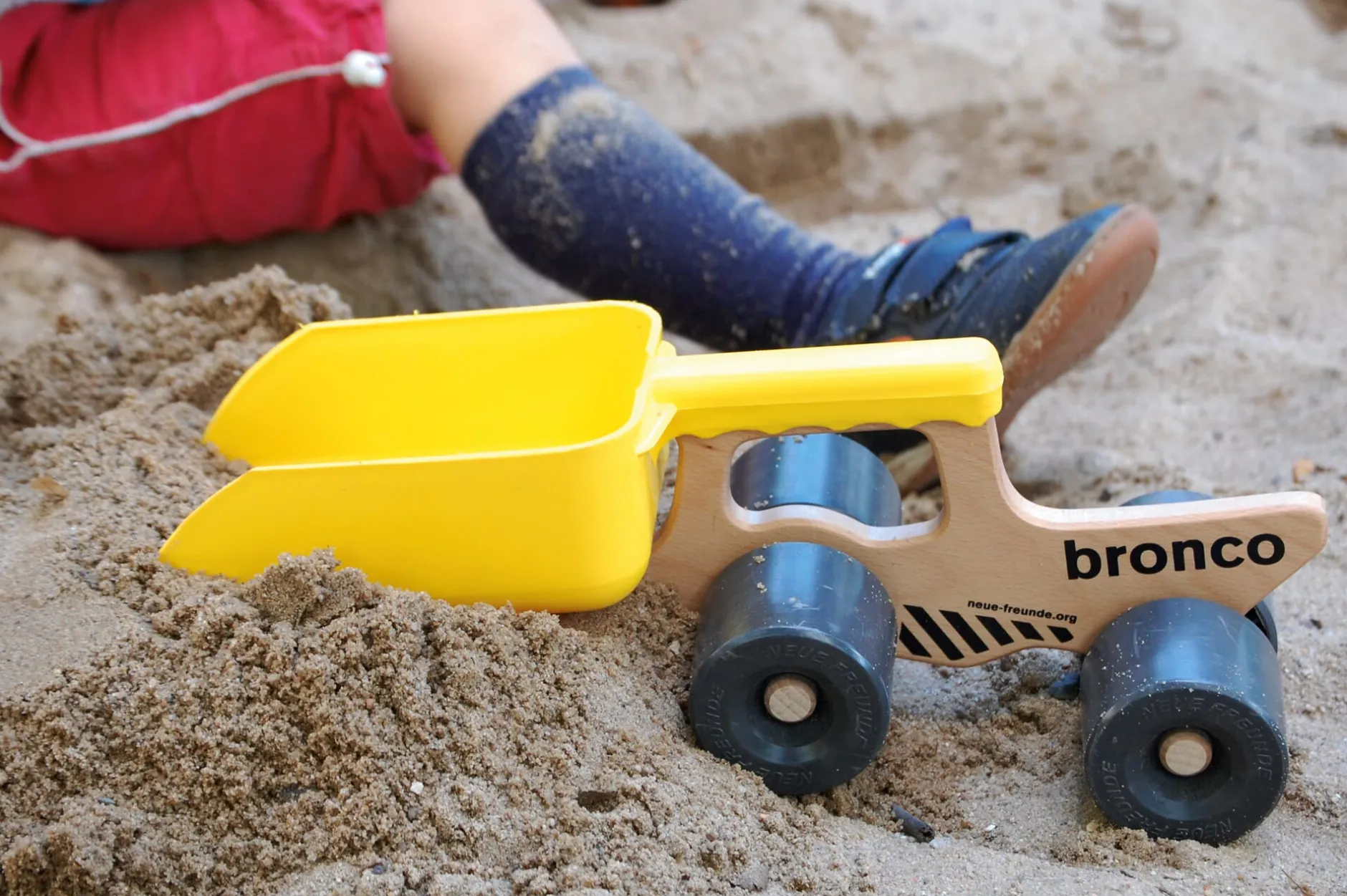 BRONCO besteht aus einem Mittelteil aus Buchenholz und einer abnehmbaren Kunststoffschaufel, die mit ihrem Griff oben auf das Holzteil aufgesteckt wird. Der besondere Clou: Durch eine 180 Grad-Drehung der Schaufel lässt sich Bronco vom Muldenkipper zum Radlader umbauen. Schön für Kinder: gut zu greifen, vielseitig zu bespielen – schön für Eltern: leise Rollen und fein zu säubern.