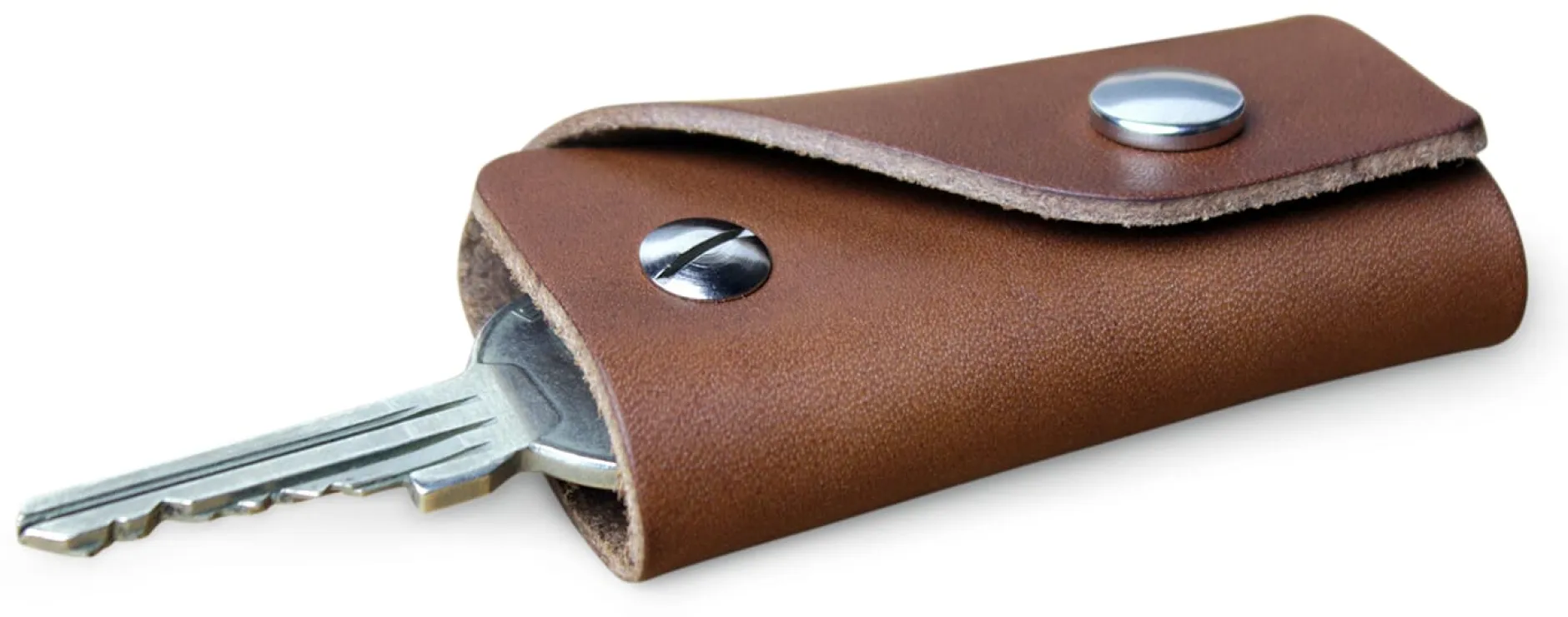 Zusammenfassend schön: Das kompakte Schlüsseletui für bis zu 5 Schlüssel verwandelt den unförmigen Schlüsselbund in ein geordnetes, kleines Paket. Eine Buchbinderschrauber nimmt Schlüssel ab einem Lochdurchmesser von 4 mm auf und sichert sie im Inneren des Lederumschlags. Dessen Leder kommt aus der Toskana und ist zu 100% pflanzlich gegerbt.