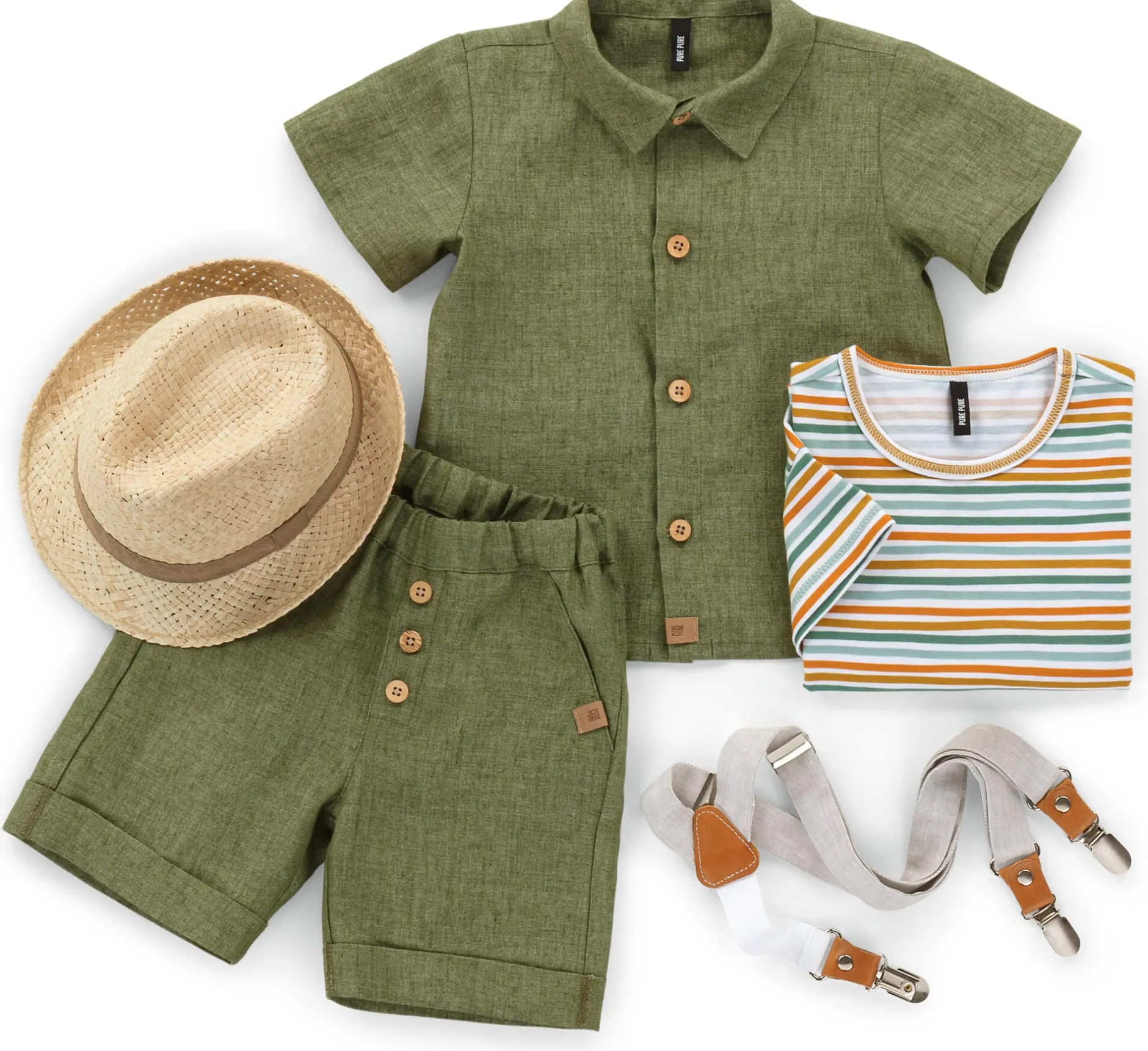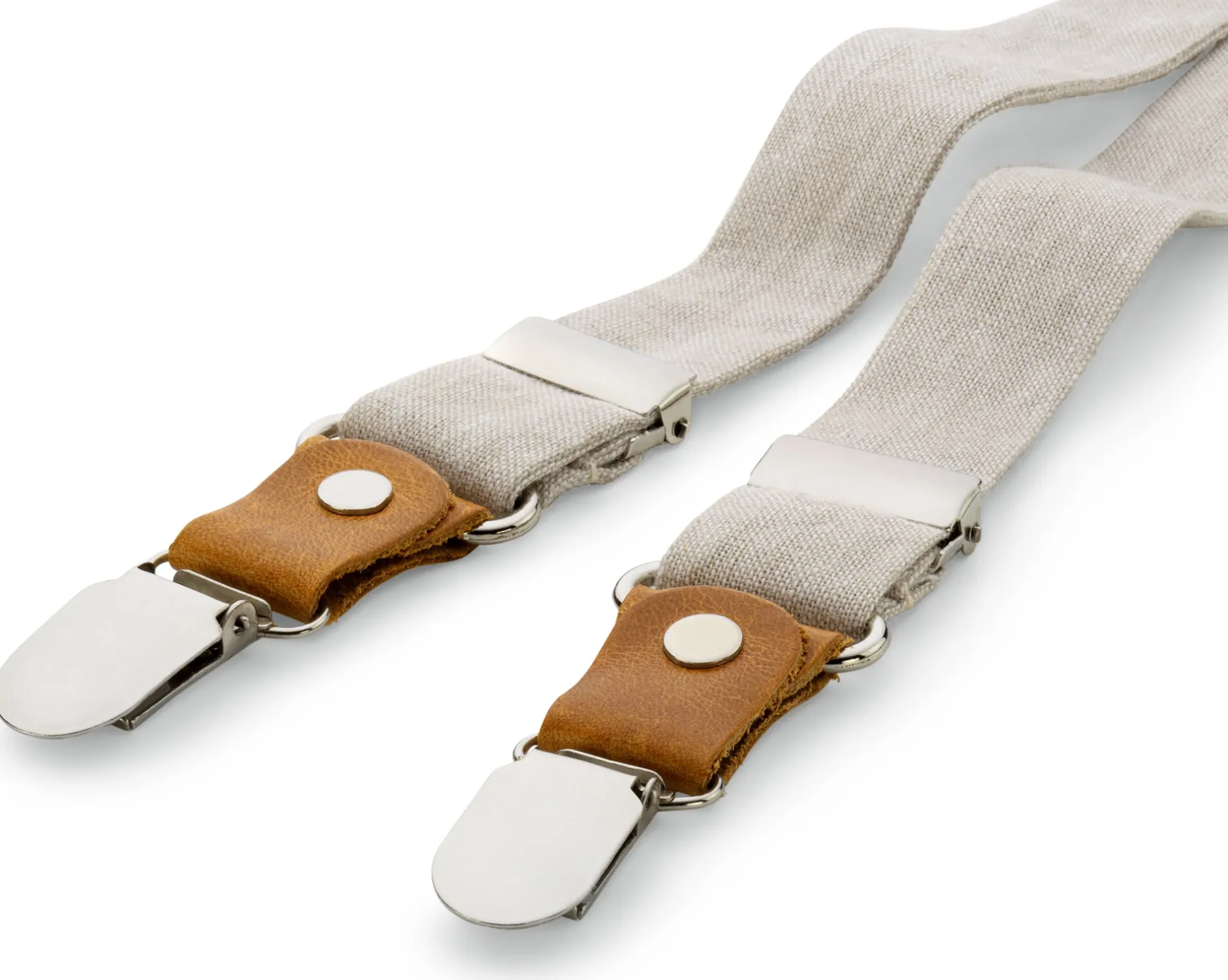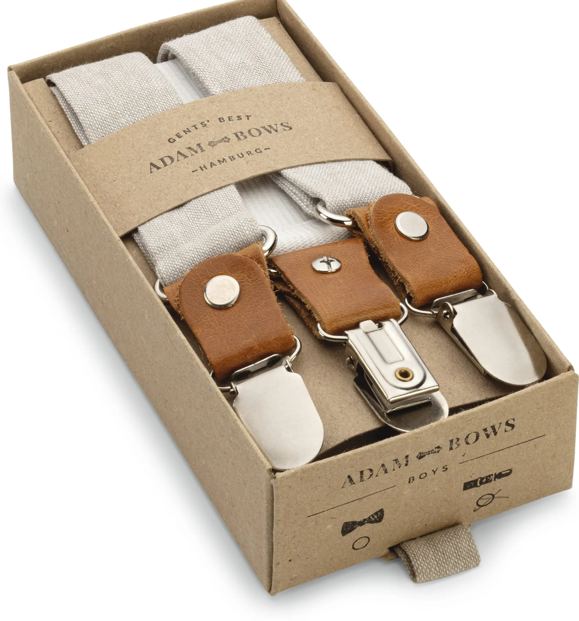 Hosenträger verleihen dem Outfit Ihres Kindes nicht nur dieses gewisse Etwas verwegener Lässigkeit, sie sind vor allem überaus praktisch. Auch wenn Ihr Sprössling ausgelassen Wald, Wiese und Welt erforscht, sorgen sie für den guten Sitz von Hose oder Rock. Damit die Hosenträger Ihr bewegungsfreudiges Kind weder bedrängen noch gar beengen, kommen diese mit Bändern aus reinem Leinen daher: kindgerecht strapazierbar und natürlich in der Länge verstellbar. Für die Patten wird robustes, vegetabil gegerbtes Rindleder verarbeitet, die silberfarbenen Metallclipverschlüsse – mit Kunststoffzähnen, um den Stoff zu schonen – halten die Hosenträger in bewährter Manier am Rock- oder Hosenbund. Dabei sorgt das rückseitige, solide Gummiband zusätzlich für hohen Tragekomfort – selbst beim Purzelbaum- und Radschlagen, Bocksprung oder Hindernislauf.