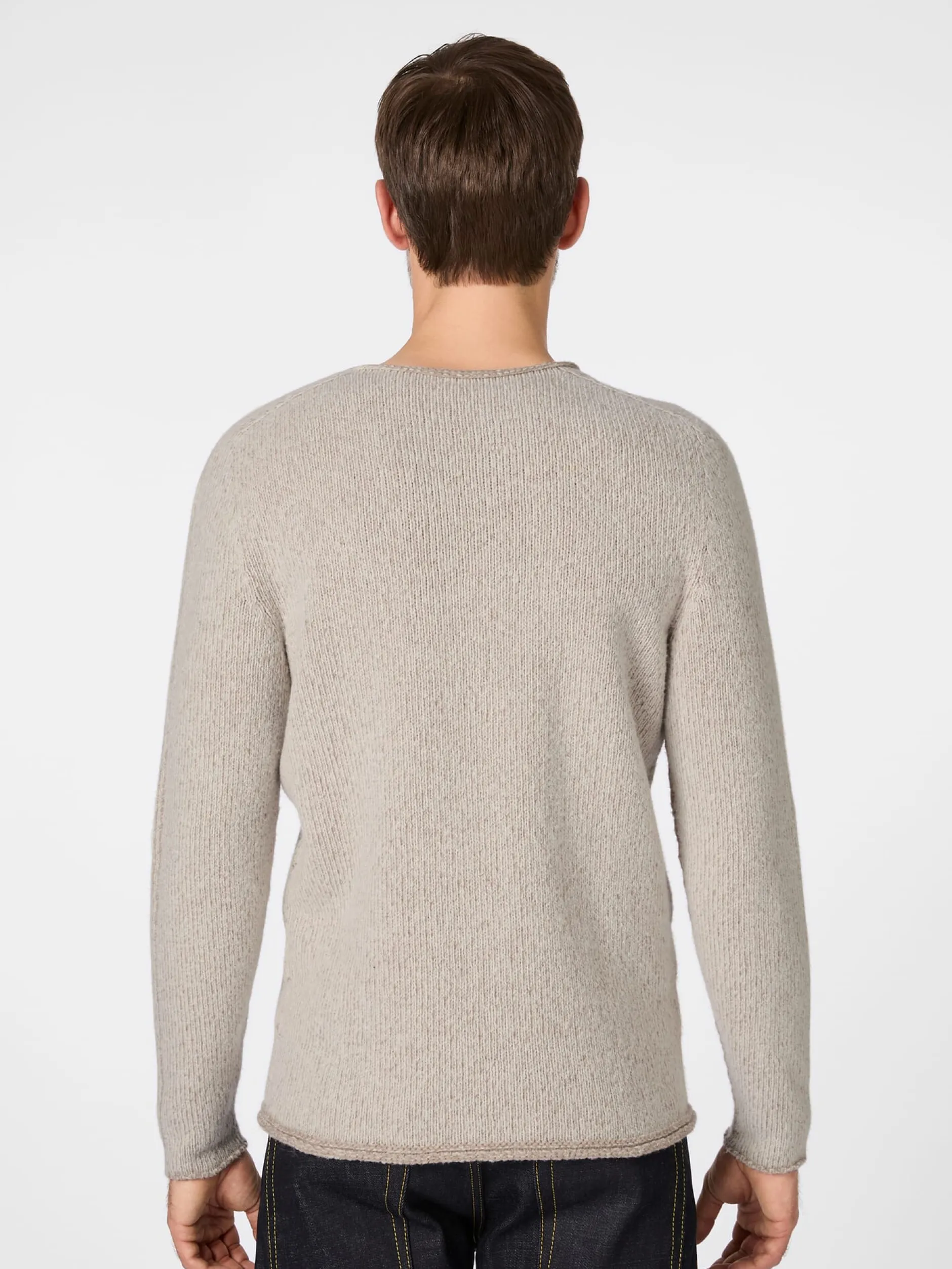 Aufgrund seine nahtlosen Machart ist dieser Pullover wendbar, durch die Plattiertechnik zeigt er dabei zwei unterschiedliche Farben. Seldom nennt diese Kombination „Two Faces“. Das weiche Gestrick besteht zu 60 Prozent aus Wolle (die Hälfte davon aus Recyclingbeständen), zu 30 Prozent aus kontrolliert biologisch angebauter Baumwolle und zu 10 Prozent aus Polyamid. Die Ärmel sind als Raglanärmel gearbeitet, was den Tragekomfort erhöht, Rollsäume bilden den Abschluss an Hals, Ärmeln und Rumpf.