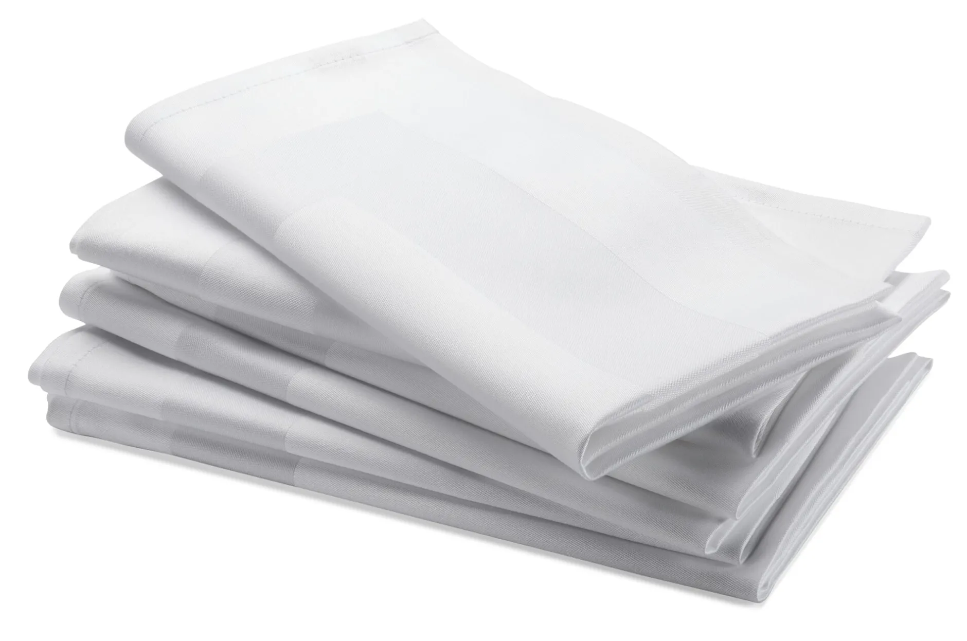 Stoffservietten in Gastronomiequalität – reinweiß, griffig, unverwüstlich und natürlich kochfest. Aus merzerisierter Baumwolle und mit Atlaskante verarbeitet – jedem Papiertuch himmelhoch überlegen.
