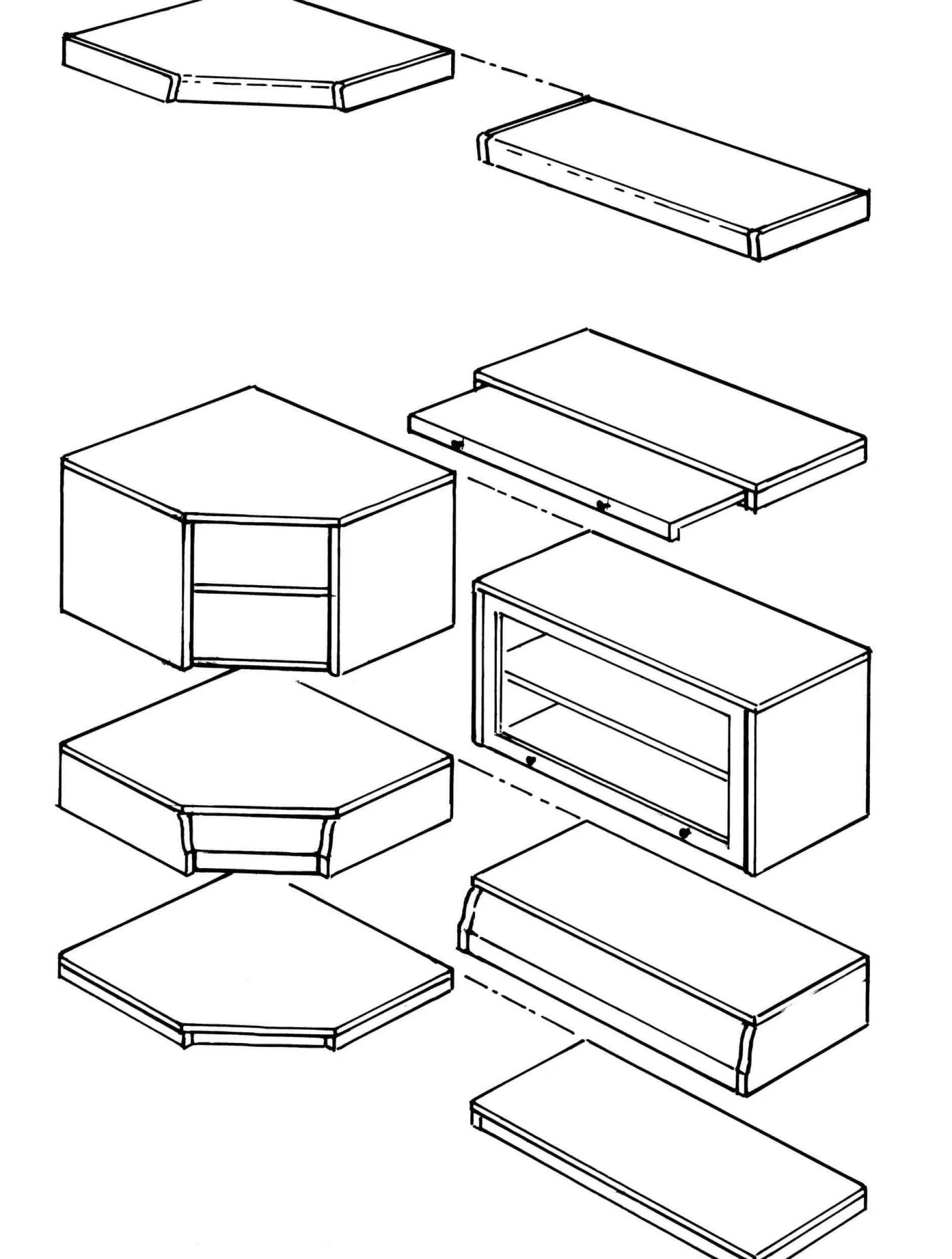 Der Grundaufbau des Systems folgt wenigen einfachen Prinzipien: auf ein – flaches oder hohes – Sockelelement werden ein oder mehrere Korpuselemente (drei Tiefen: 40, 34 und 28 cm) übereinandergeschichtet. Den oberen Abschluss bildet ein optionales Kranzelement. Die so entstehenden Segmente lassen sich sowohl einzeln als auch in beliebiger Menge nebeneinander anordnen und sogar über Eck aufstellen. Herzstück des Systems sind die Korpuselemente in unterschiedlichen Funktionen, Maßen und Ausführungen. Klassisches Korpuselement ist das vielseitig nutzbare Schrankelement in drei Tiefen (28, 34, 40) und Höhen, dem wir als funktionale Erweiterung Schubkastenelemente (40) und Regalelemente in jeweils einer Tiefe (28) an die Seite gestellt haben. Für Ecklösungen gibt es spezielle Eckelemente. Die Korpuselemente liefern wir in unterschiedlichen, aufeinander bezogenen Höhenmaßen. Die Maße sind so angelegt, dass der Aufbau eines Gesamtmöbels aus mehreren Segmenten sowohl in einheitlicher als auch in unterschiedlicher Höhe gestaltet werden kann. Sie können einzelne Segmente wie auch das Gesamtmöbel in einheitlicher oder in unterschiedlicher Tiefe aufbauen. Bei der Tiefe können Sie zwischen 28, 34 und 40 cm wählen. In seiner klassischen Form wird der Registrator mit Schrankelementen verschiedener Tiefe – also nach oben zurückspringend – aufgebaut. Die durchgängige Verwendung von Elementen mit gleicher Tiefe ist ebenso möglich.