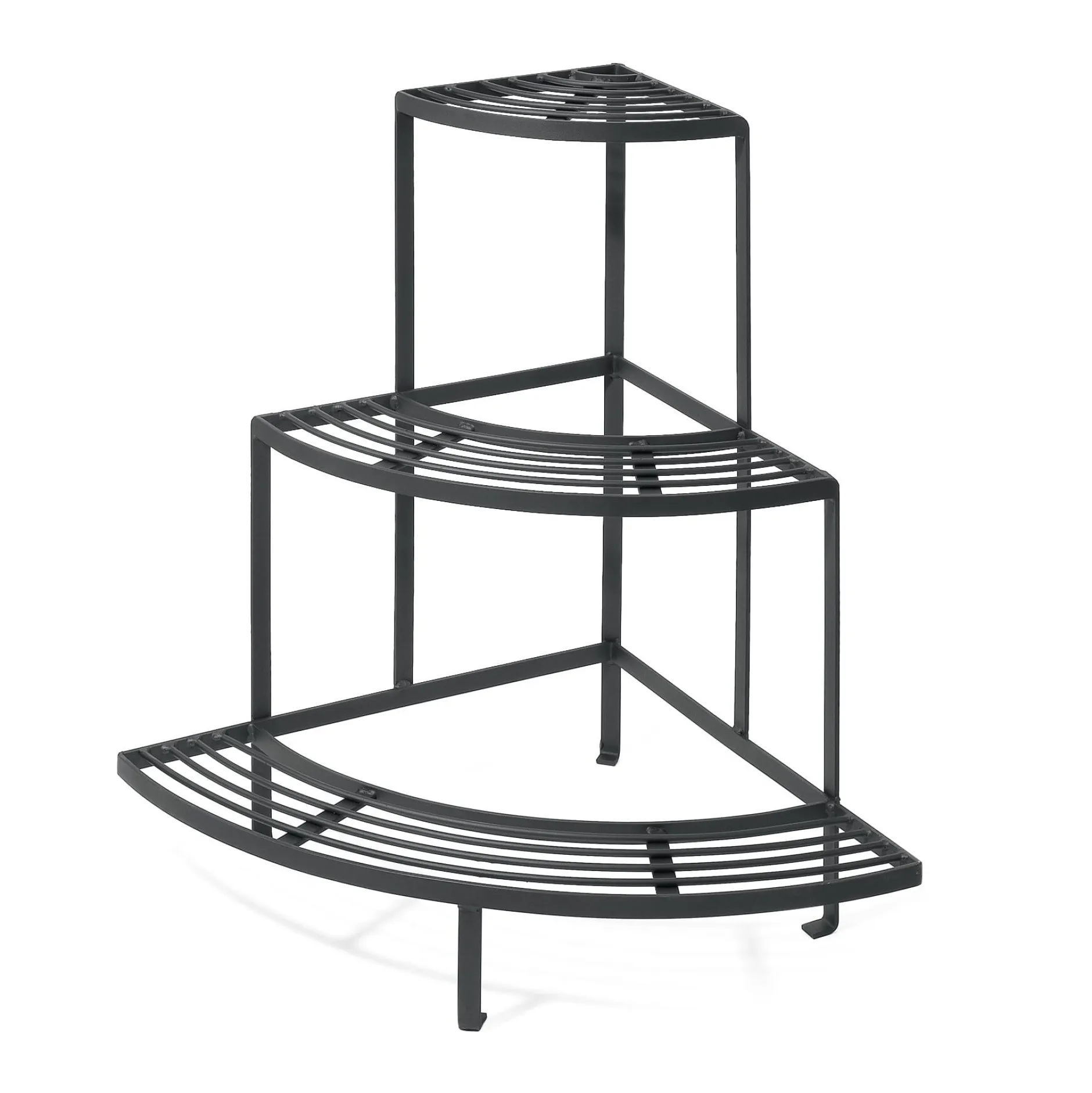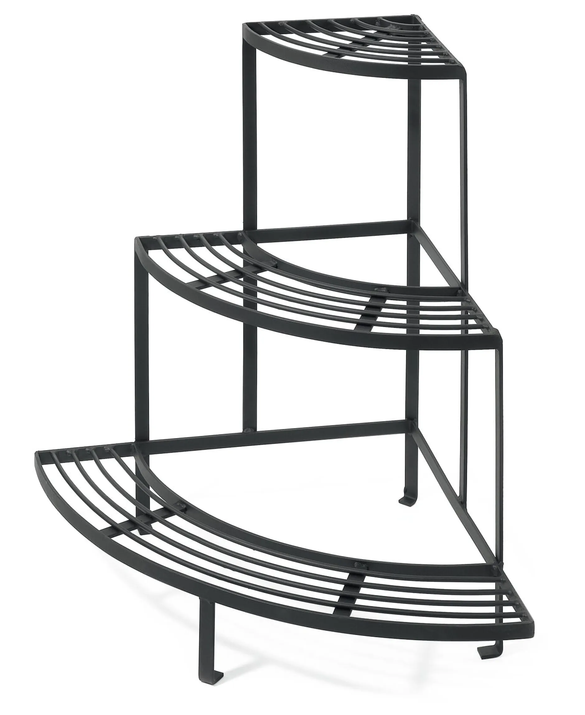 Wirklich stabil und ein schöner Blickfang auf jedem noch so kleinen Balkon ist diese Blumentreppe in Form eines Viertelkreises. Das Eckregal ist aus einem Stück Stahl von ordentlicher Stärke geschweißt und steht schon aufgrund seines Eigengewichts fest und sicher, ohne zu kippeln. Auf Hof und Terrasse lassen sich aus zwei oder vier Regalen Halb- oder Vollkreise zusammenstellen; auf der untersten Etage finden auch größere Blumentöpfe Platz.
