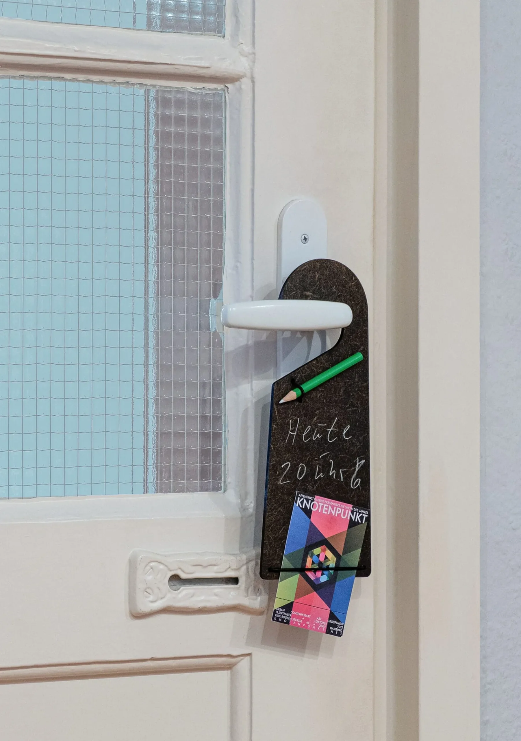 Soziales Netzwerk analog: Die kleine Tafel hängt am Türgriff und übermittelt die wichtigen Infos an Familie und Freunde. Das schwarze Gummiband hält den Tafelstift, aber auch Briefe oder die Eintrittskarten für den Abend.