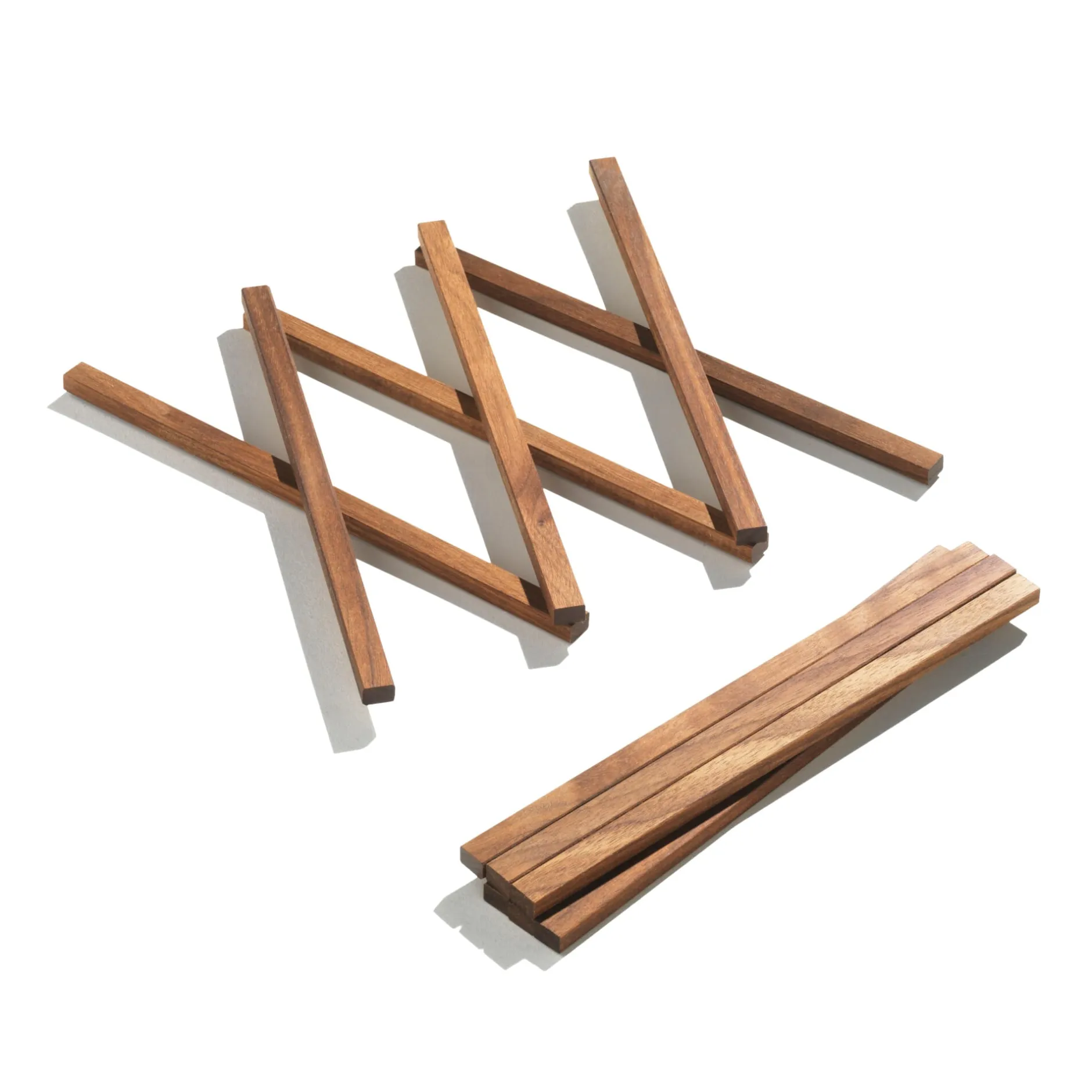 Schöne Konstruktion aus feinem Holz: Der Untersetzer ist in seinem beiden Versionen spielerisch leicht vergrößerbar, der größere der beiden bis zum imposanten Maß von 80 cm.