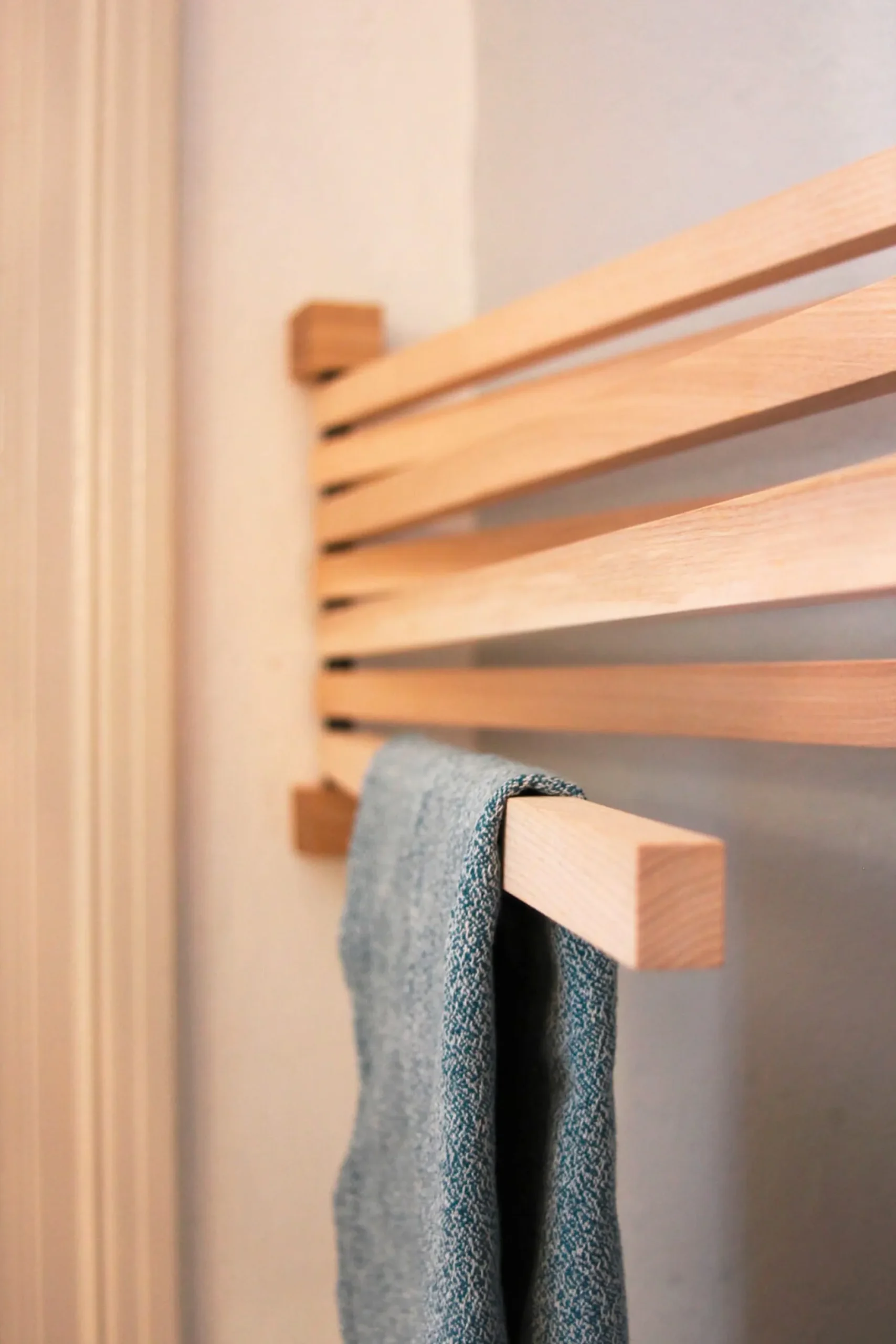 Nützlicher Stummer Diener – wie eine wandelbare Skulptur an der Wand. PAVO ist nutzbar als Garderobe oder Ablage für Bekleidung, als Handtuchhalter in Küche und Bad, für Kochgerätschaft oder als Stativ für Zeitschriften. Interpretierbar in seiner Zweckverwendung und schmuckvolles, handwerklich gearbeitetes Objekt. Lieferbar in zwei verschiedenen Größen.