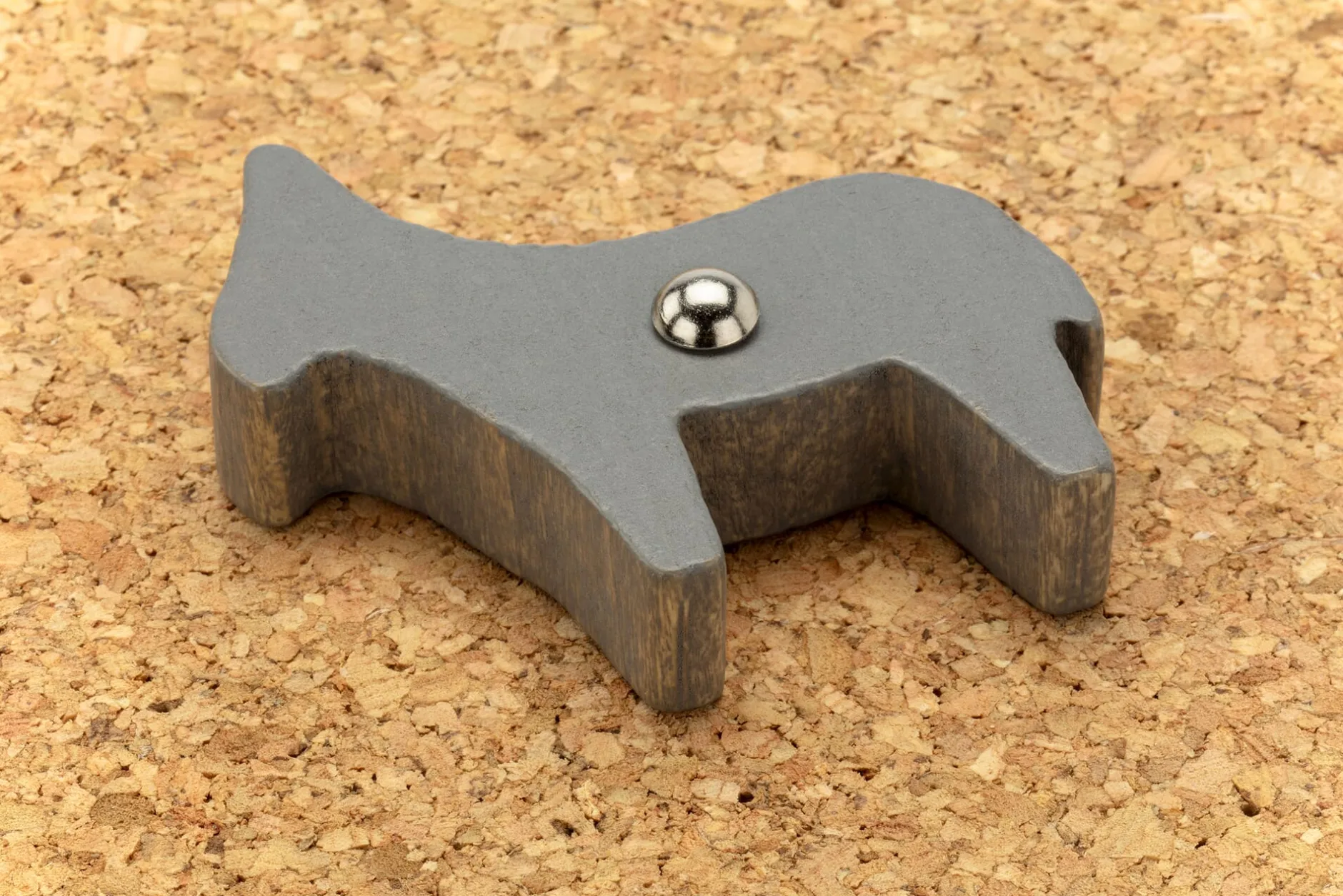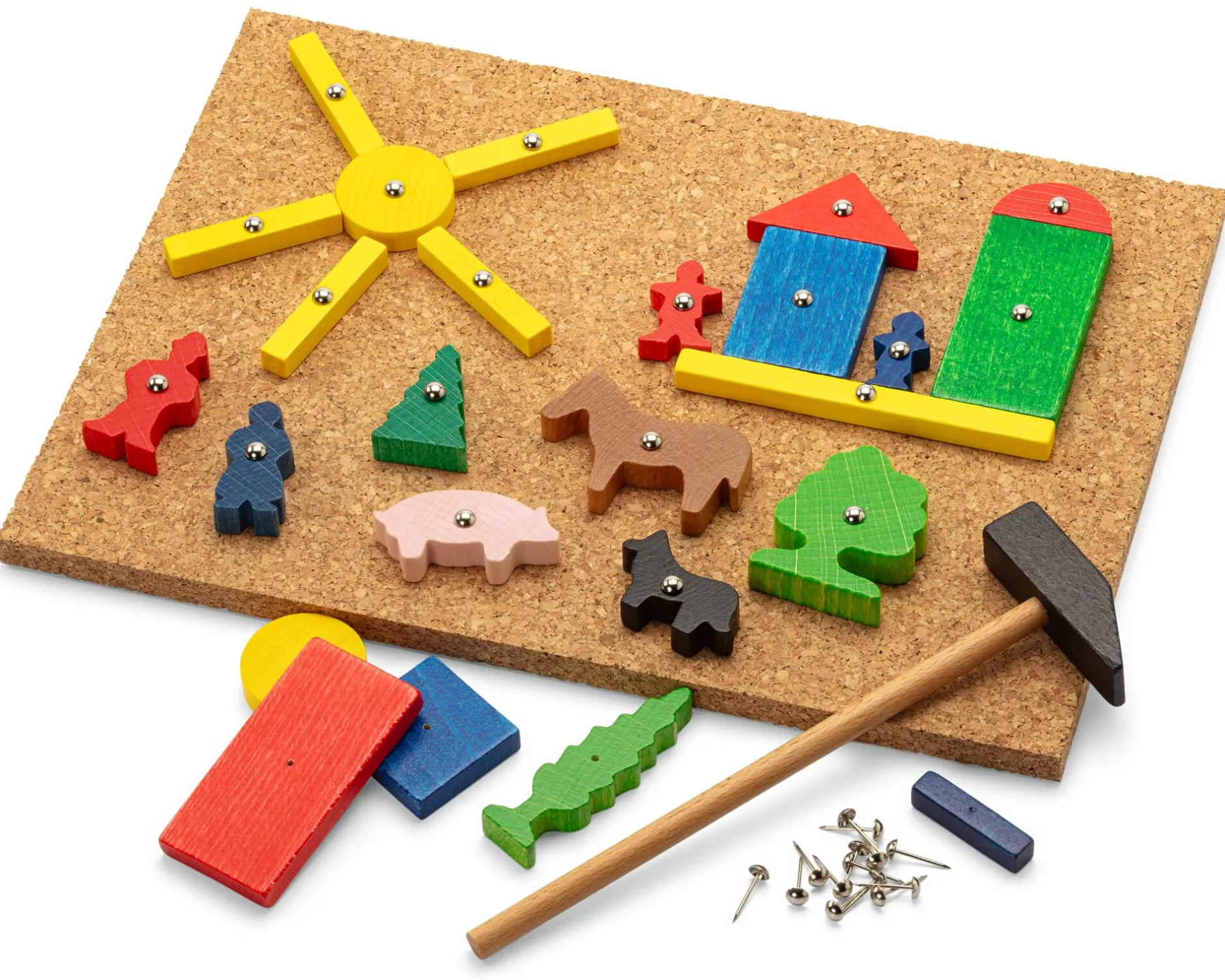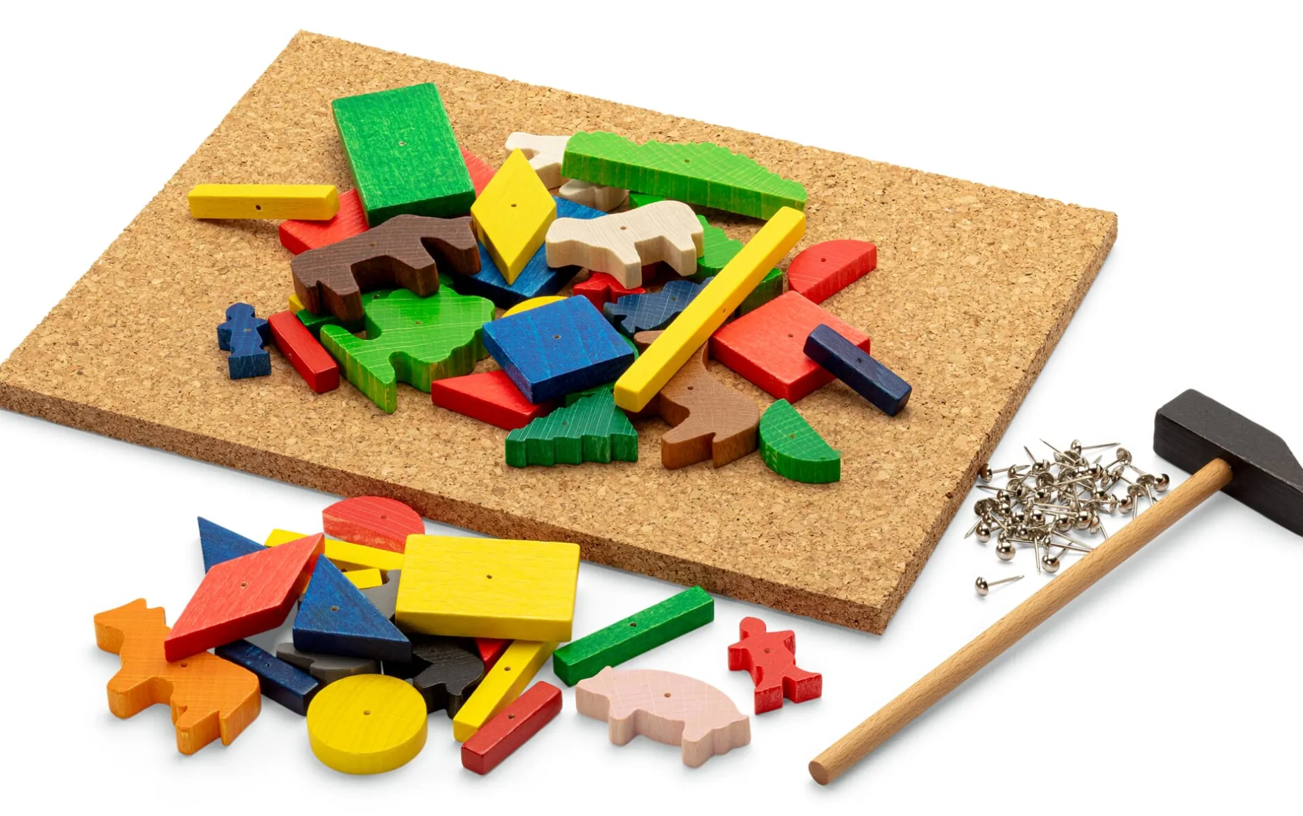 Spielteil aus Buchenholz (Herkunft Europa). Auflage aus Kork (Herkunft Portugal), 21 × 29 × 1 cm. Mit einem Holzhämmerchen und Metallnägeln. 46 verschiedene Formen: Menschen- und Tierfiguren, Pflanzen und geometrische Formen (1–8 cm groß). Gesamtgewicht 600 g.