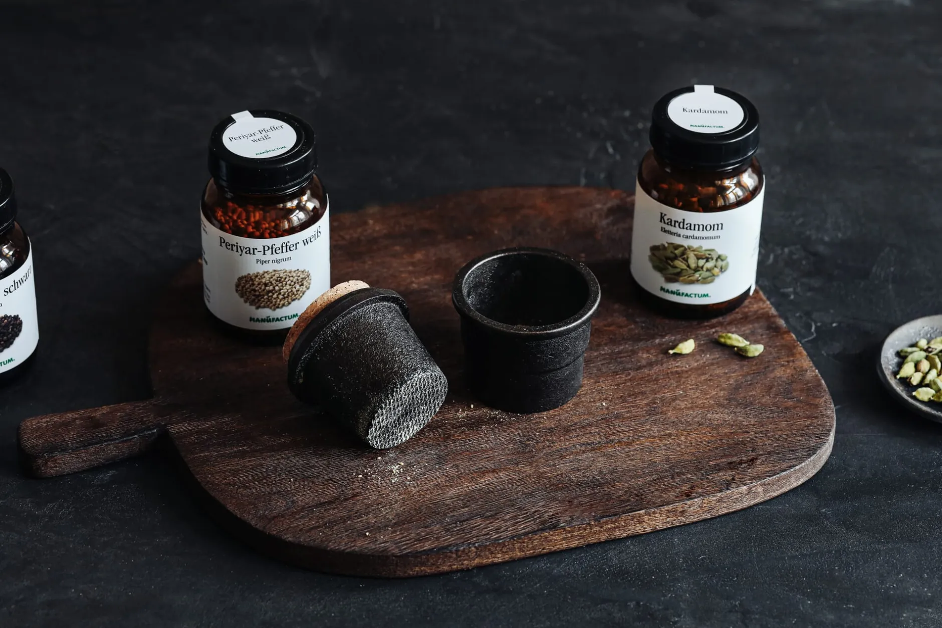 Das Gefäß nicht zu sehr füllen. Das Oberteil bietet Platz für die Gewürzaufbewahrung. Ein Korkdeckel verschließt angemessen natürlich.