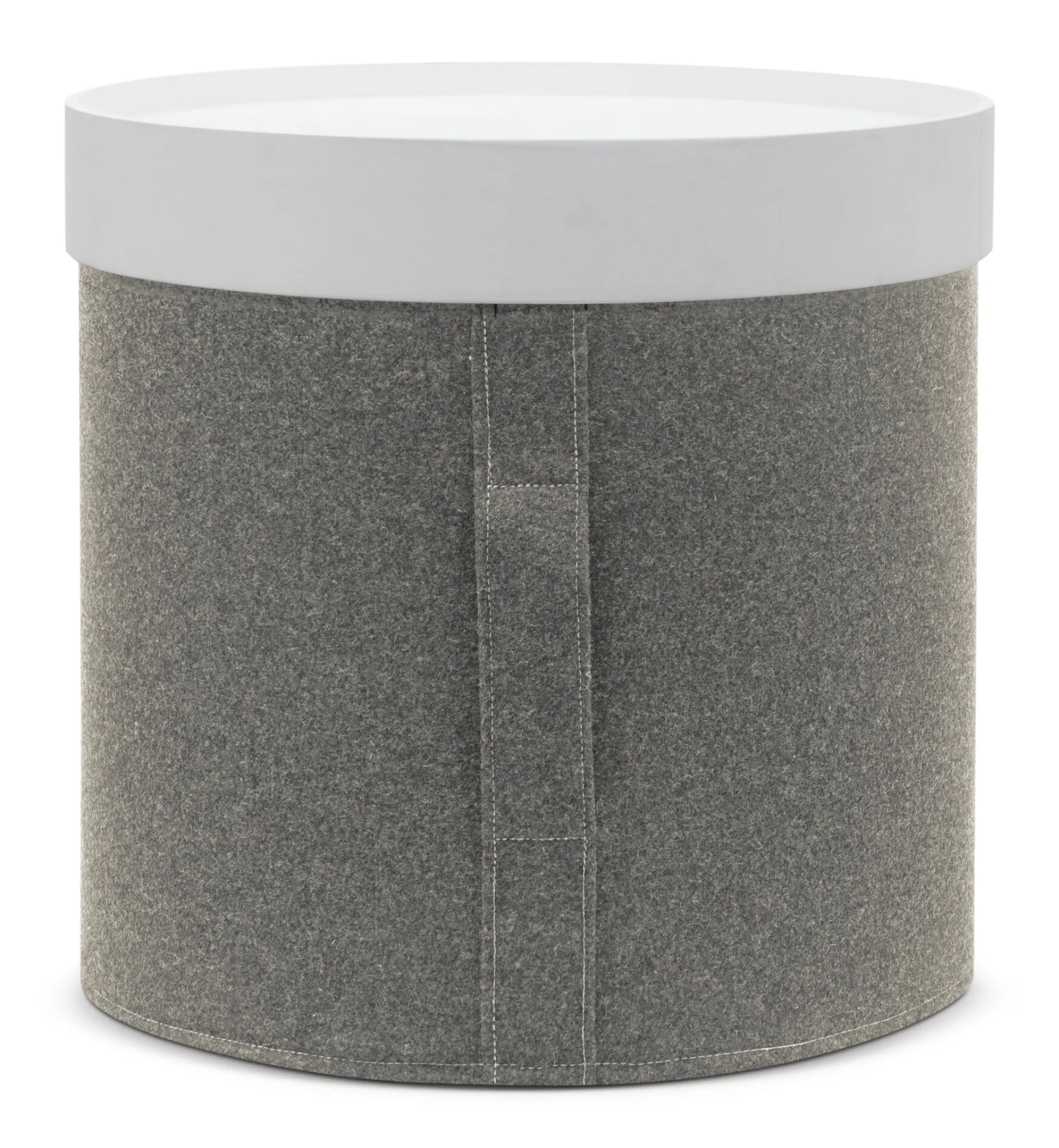 Vollständig mit Stoff bezogener Hocker mit Griffschlaufe. Wird mit einem separat lieferbaren Tablett zum Beistelltisch.