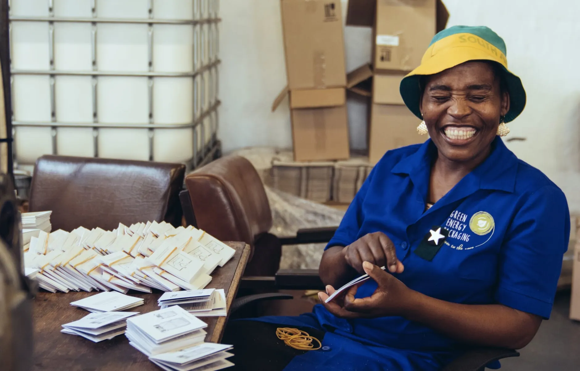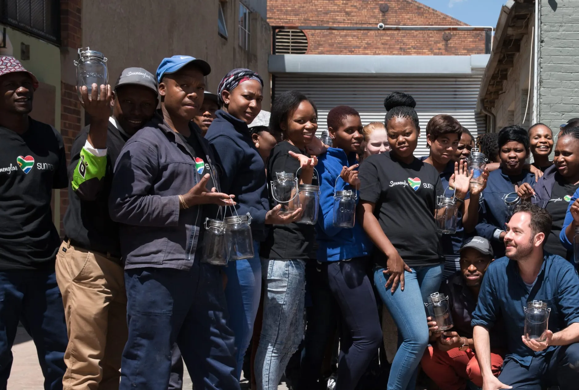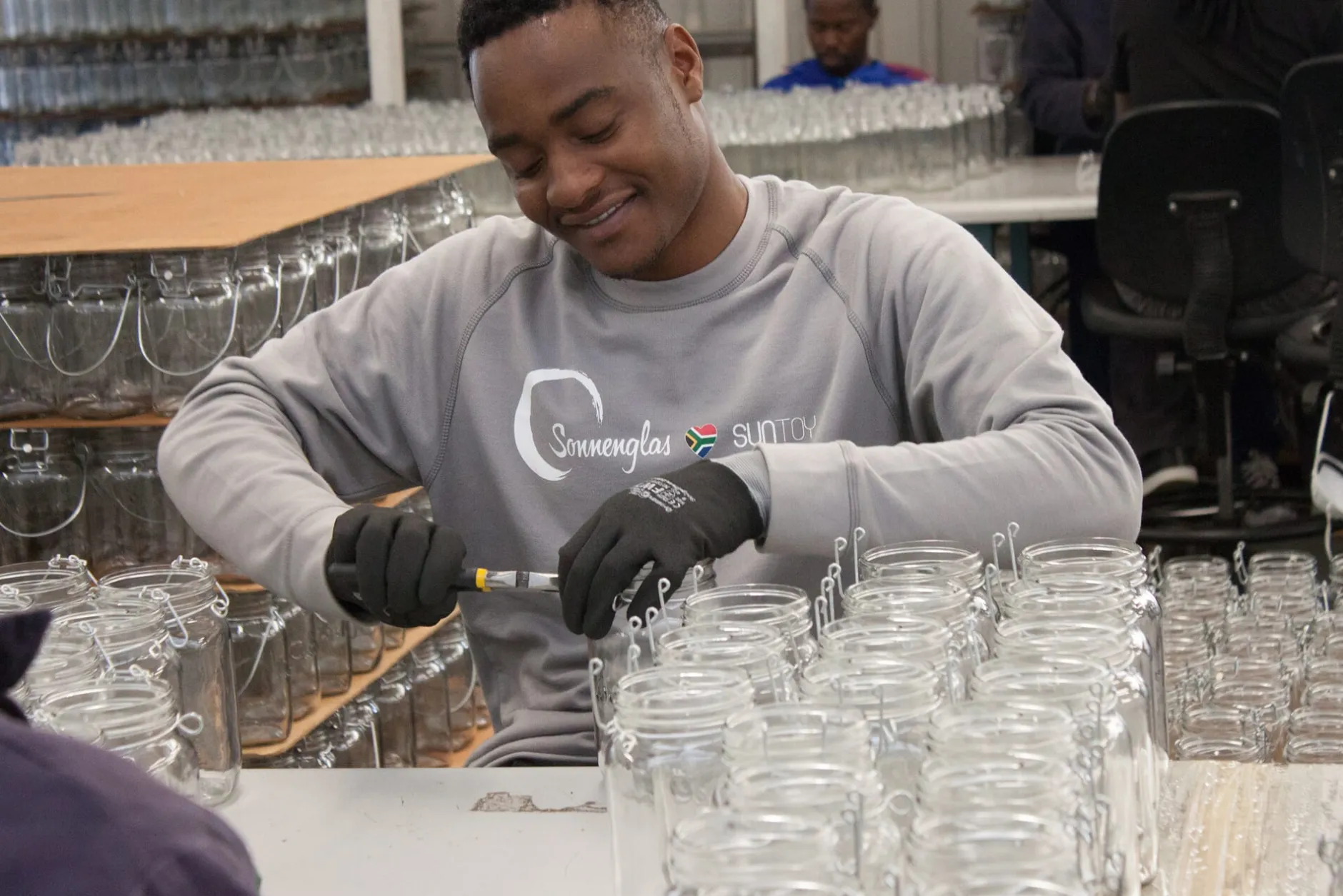 Der Glascontainer unter der Leuchteneinheit sorgt für die Distanz zur beleuchteten Fläche und erzeugt so eine kleine Lichtinsel, die sogar in unmittelbarer Umgebung als Leselicht dienen kann. Ein kleiner Bügel am Schraubdeckel dient als Magnetschalter. Ist dieser aktiviert, schaltet sich die Leuchte ab einer bestimmten Beleuchtungsstärke automatisch an und aus, beispielsweise bei Sonnenauf- und -untergang. Das integrierte Sonnenmodul ist auch ohne Glasbehälter voll funktionsfähig und als mobile Leuchte in der Hosentasche zu tragen. Über den Bedienknopf kann es an- und ausgeschaltet werden, ebenso verfügt es über eine Notlichtfunktion, bei der die LEDs blinken. SONNENGLAS® wird in einem Fair-Trade-Projekt in Südafrika produziert und genießt dort in hoher Verbreitung Kultcharakter.