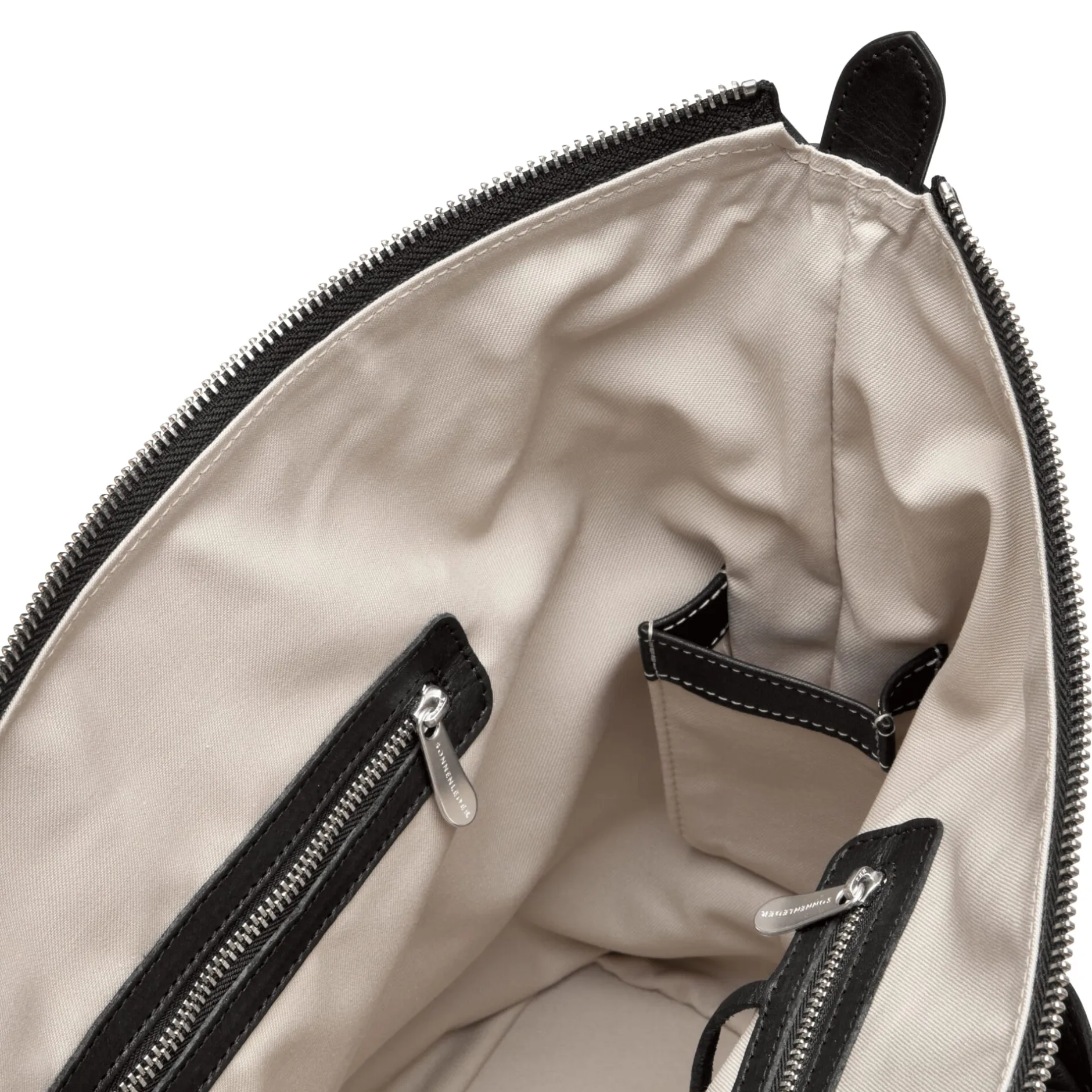 Das Konzept der funktionalen Vielseitigkeit ist bis ins kleinste Detail durchdacht. Zwei verdeckt ins Leder eingearbeitete Magnete sichern die Form, wenn die Seiten heruntergeklappt sind und so gleichzeitig die Befestigungsringe für den abnehmbaren Trageriemen verdecken. Die Lederabdeckungen der „unsichtbaren“ Magnete werden sorgfältig von Hand in gerundeter Form eingeschlagen und aufgenäht. Die beiden kräftigen Ledergriffe sind durch eine eingearbeitete Kordel verstärkt, das verbessert den Tragekomfort entscheidend. Über einen im Hauptfach angebrachten Lederriemen mit Karabiner ist der Schlüsselbund gut zu sichern und schnell greifbar. An ihren Außenkanten ist die Tasche fast ohne eine sichtbare Naht gearbeitet – bis hin zum Boden.