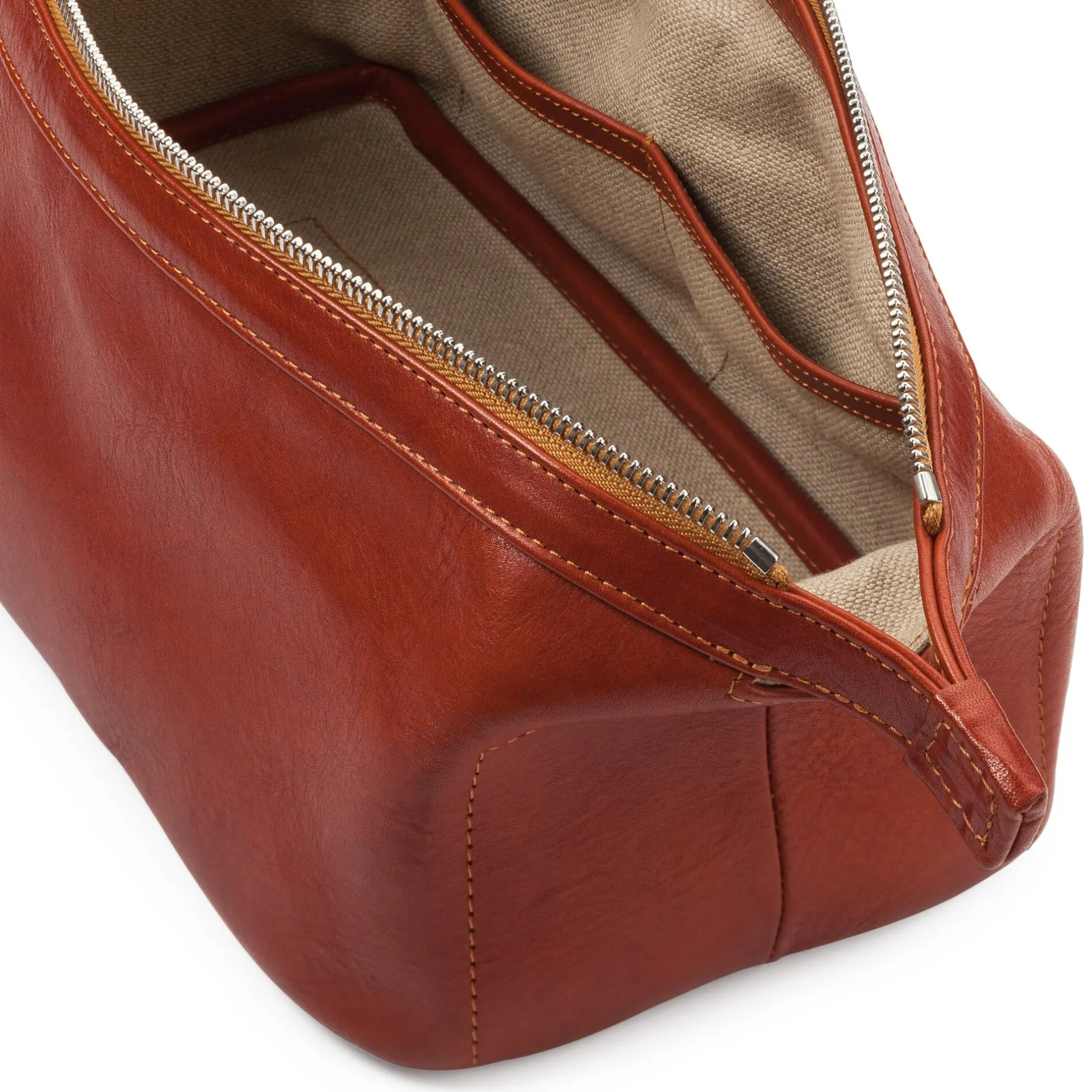 Eine recht große Kulturtasche mit einem ordentlichen Fassungsvermögen. Gefüttert ist sie mit naturfarbenem, strapazierbarem Leinengewebe. Die eine Innenseite ist mit einem Reißverschlussfach gearbeitet, die andere Seite ist mit zwei Einsteckfächern versehen.